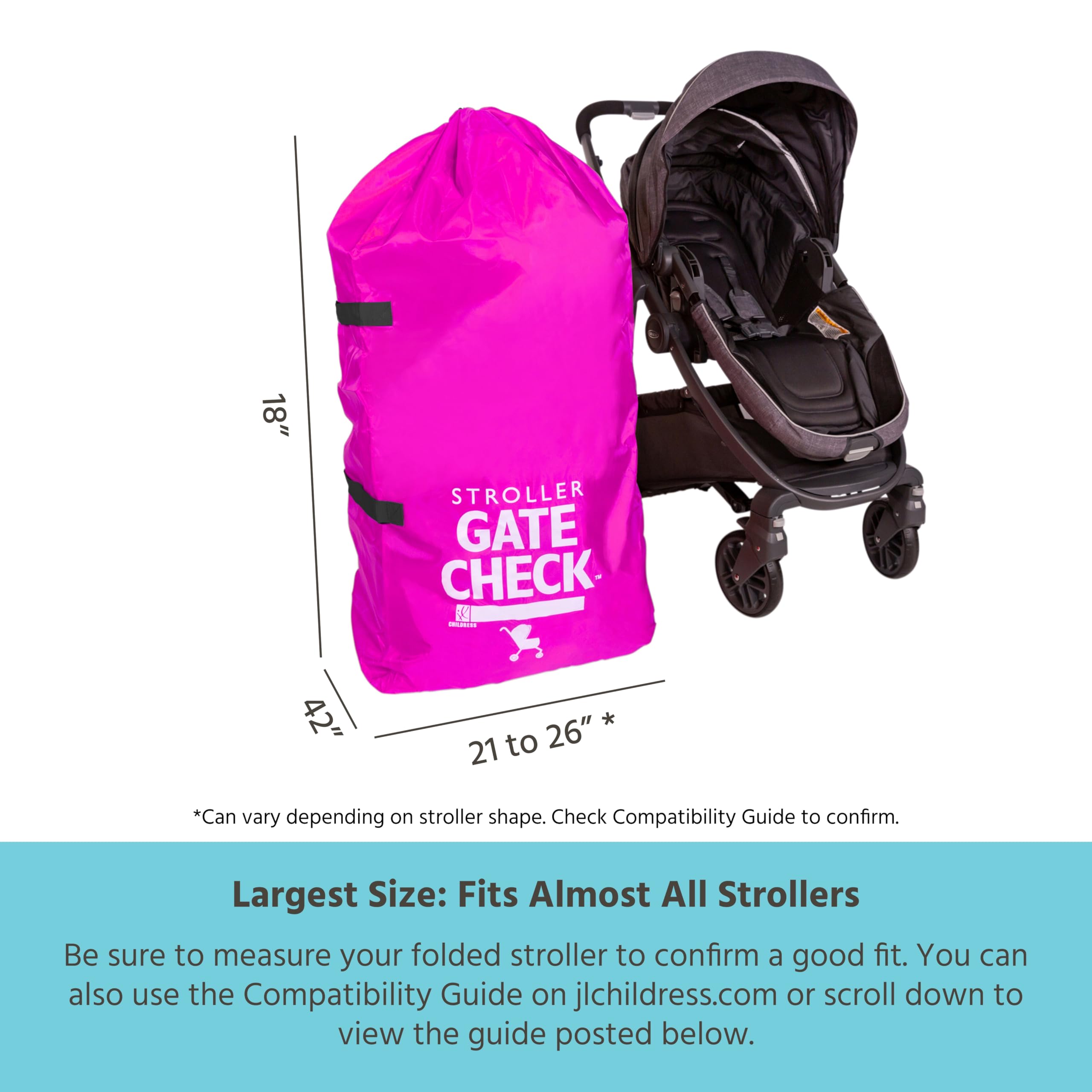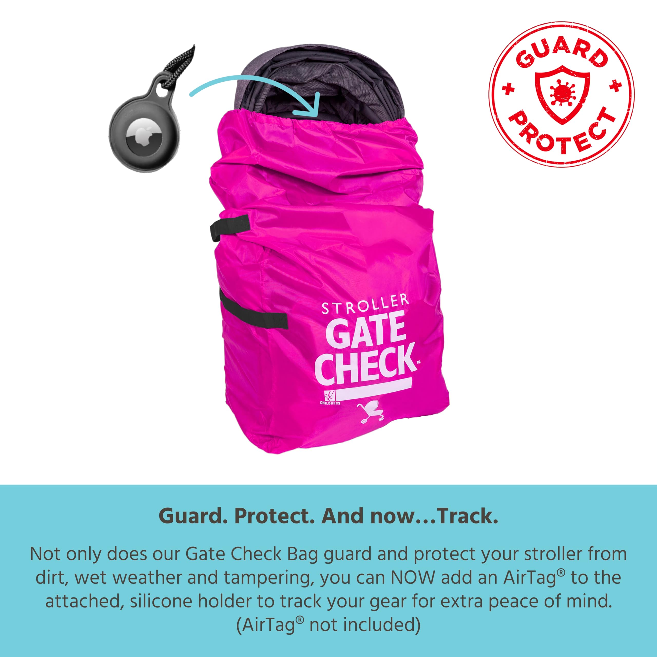 Stroll down the airport concourse with confidence knowing your stroller will be protected! The J.L. Childress Gate Check Bag for Single & Double Strollers has been a go-to travel bag for parents for almost 20 years. This durable yet lightweight bag fits and easily covers most standard single strollers and some double strollers. Be sure to measure your stroller or check the Compability Guide on the J.L. Childress website to ensure a good fit. NEW FEATURE: The interior of the bag features a silicone Apple AirTag holder so you can track the location of your bag during travel (AirTag not included). A drawstring closure with adjustable lock, reinforced seams and dual carry handles are designed to make traveling a bit easier and provide you with peace of mind knowing your stroller is well protected. The attached stretch pouch makes unfolding and refolding the bag quick and easy. The large white ID box for your name helps to quickly identify your stroller. The durable fabric and large GATE CHECK logo help ensure that your stroller is protected and safely returned to you at the end of your flight. It’s also the perfect bag to use for storage when your stroller isn’t in use. You pack the snacks, we’ve got the stroller covered. AIRLINE APPROVED and recommended by baggage handlers around the world. Trust J.L. Childress, the original inventor of the stroller and car seat Gate Check Bags. Around the world or around the block, Travel Happy with J.L. Childress!
