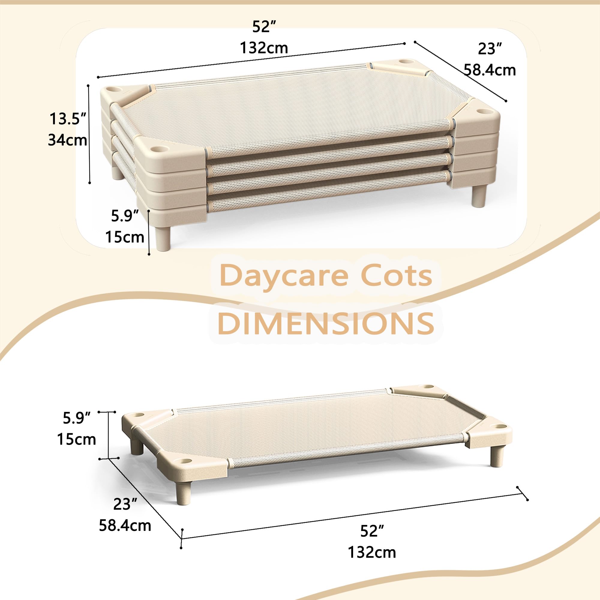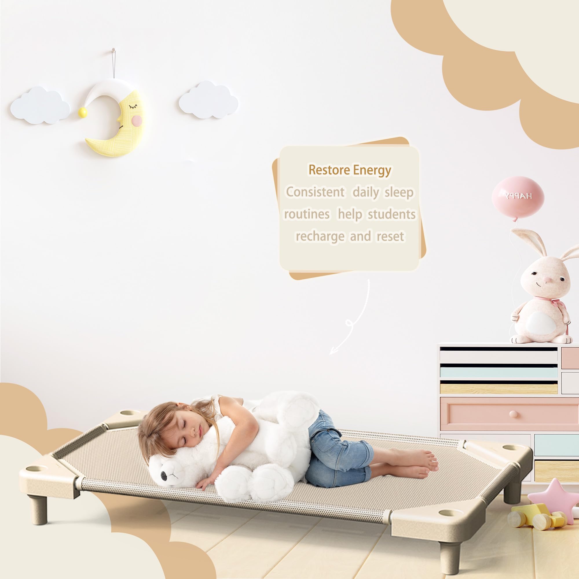 【Versatile and Space-Saving Nap Cot】Our breathable sand mesh cot adapts to children's body contours, enhancing sleep quality. Its lightweight design allows for easy portability, making it perfect for daycare, camping, beach relaxation, or as an emergency guest bed. Additionally, multiple cots can be stacked together, significantly saving space.
