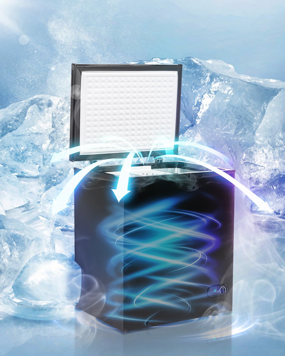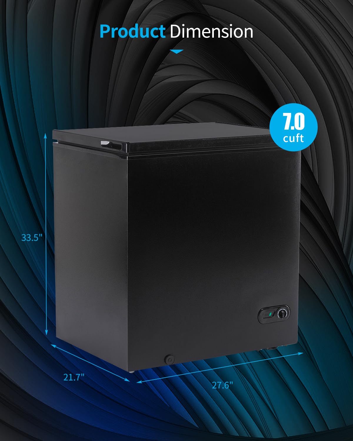 【Compact but Large Capacity】All functions of our chest freezer are designed so compact (22 x 22x 32 inches). Our 7.0 cubic foot compact freezer is designed to save a lot of food in the kitchen. It can be used to preserve seafood, ice cream, meat, etc.