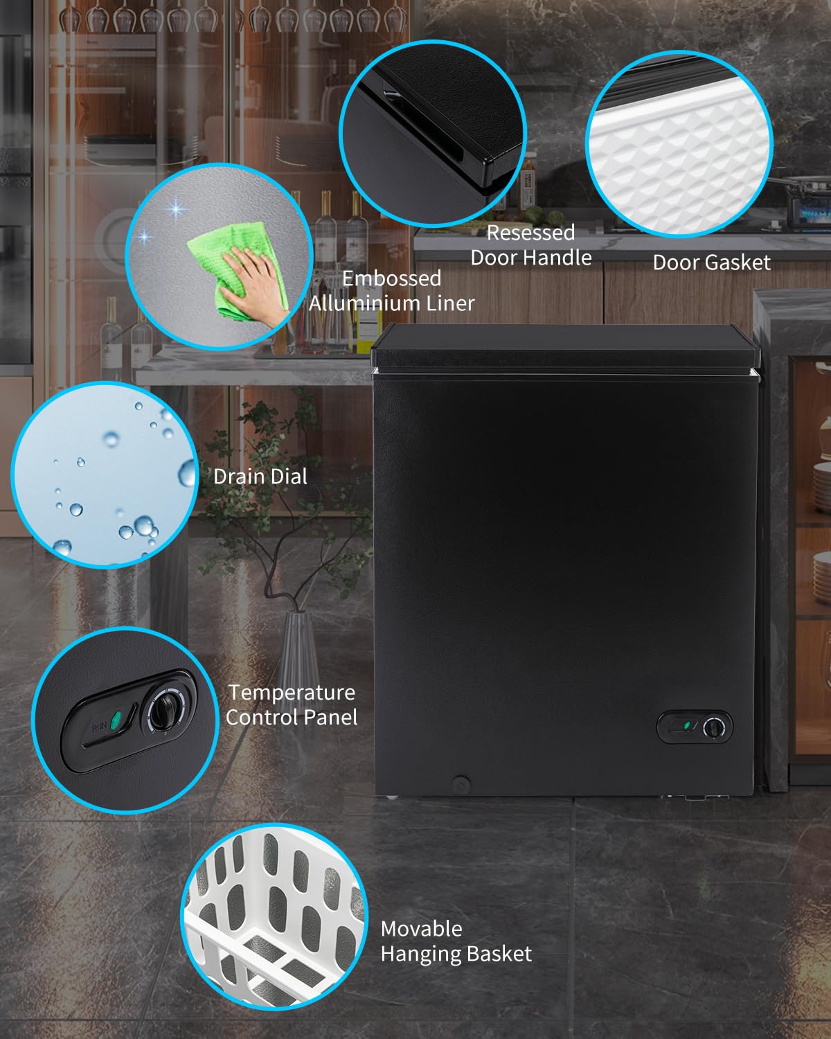 【Temperature Adjustable Control & Manual Defrost】There is adjustable 7-level temperature control at the front of deep freezer. It can be controlled from - 7.6 ° F to 6.8 ° F (- 14 ° C to - 22 ° C). The higher the water level, the lower the temperature. Features with the Manual Defrost design, our chest freezer keeps your food fresher.
