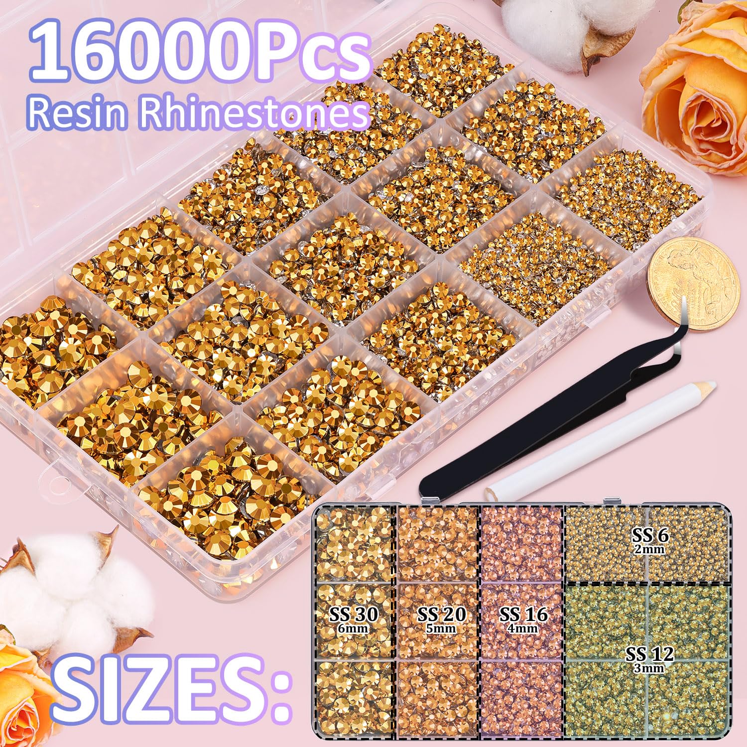 πPACKAGE CONTENT -- The package includes 1 box with 15 grids, featuring a variety of sizes: 2mm x 2 grid, 3mm x 4 grid, 4mm x 3 grids, 5mm x 3 grids, and 6mm x 3 grids, approx. 16000 pcs of 2-6mm bling-out resin rhinestones (Gold). 1 tweezers and 1 pickup pen are included for easily picking up of rhinestones. The large amount will support you to fulfill a number of your wonderful DIY decoration ideas.