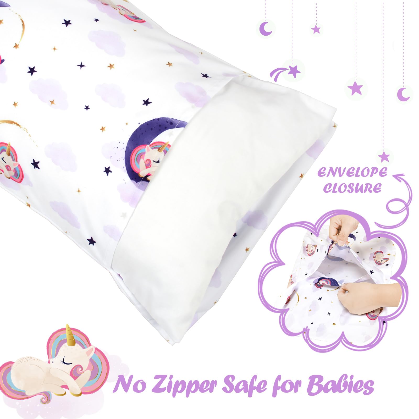 【TODDLER PILLOWCASE SIZE】:Unicorns Toddler Pillowcases 13 x 18 inch for baby girls boys 2 pack (PILLOWS ARE NOT INCLUDED).100% polyester toddler Pillow Case breathable lightweight fabric, which is gentle to the touch and your baby's delicate skin.Fits toddler pillows sized 13x18,12 x 16, 14 x 19 inches.