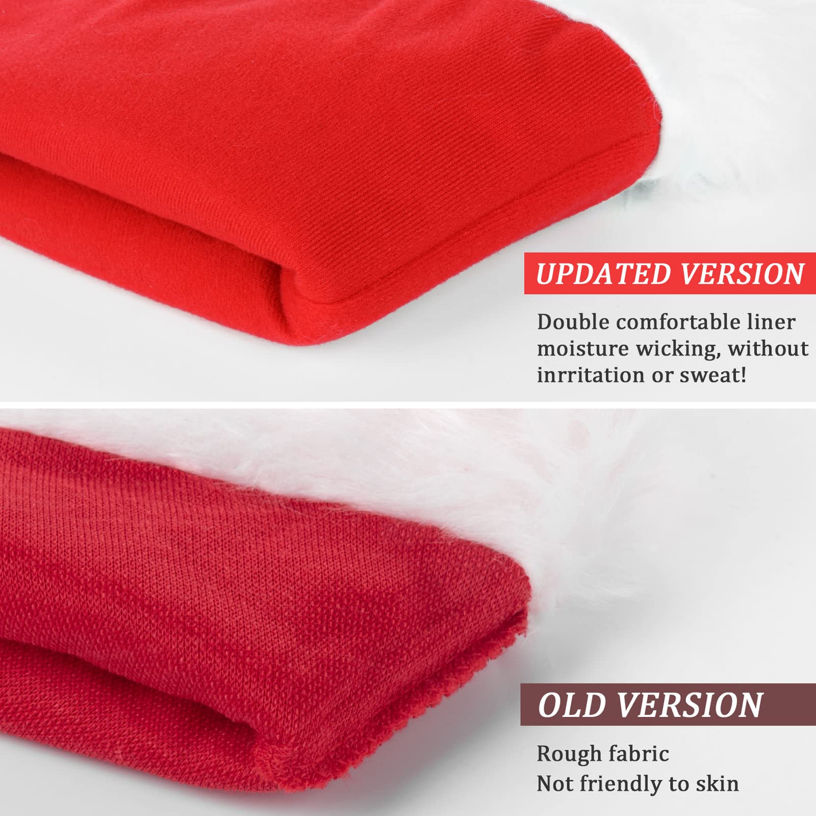 [SOFT AND HIGH QUALITY]: Child Santa hat is made of high-quality plush. Red Velvet fabric and double comfortable liner make adult Santa hats soft and good touch feeling. Soft comfortable fabric to protect your head and hair without irritation or sweat! Hand washable, not allergic, and Eco-friendly. You and your family will love it.
