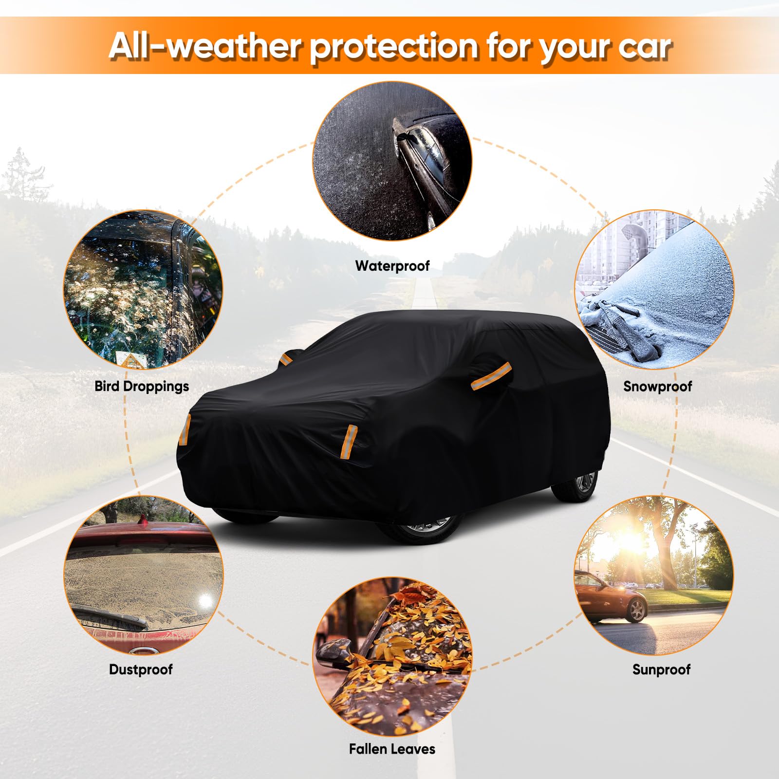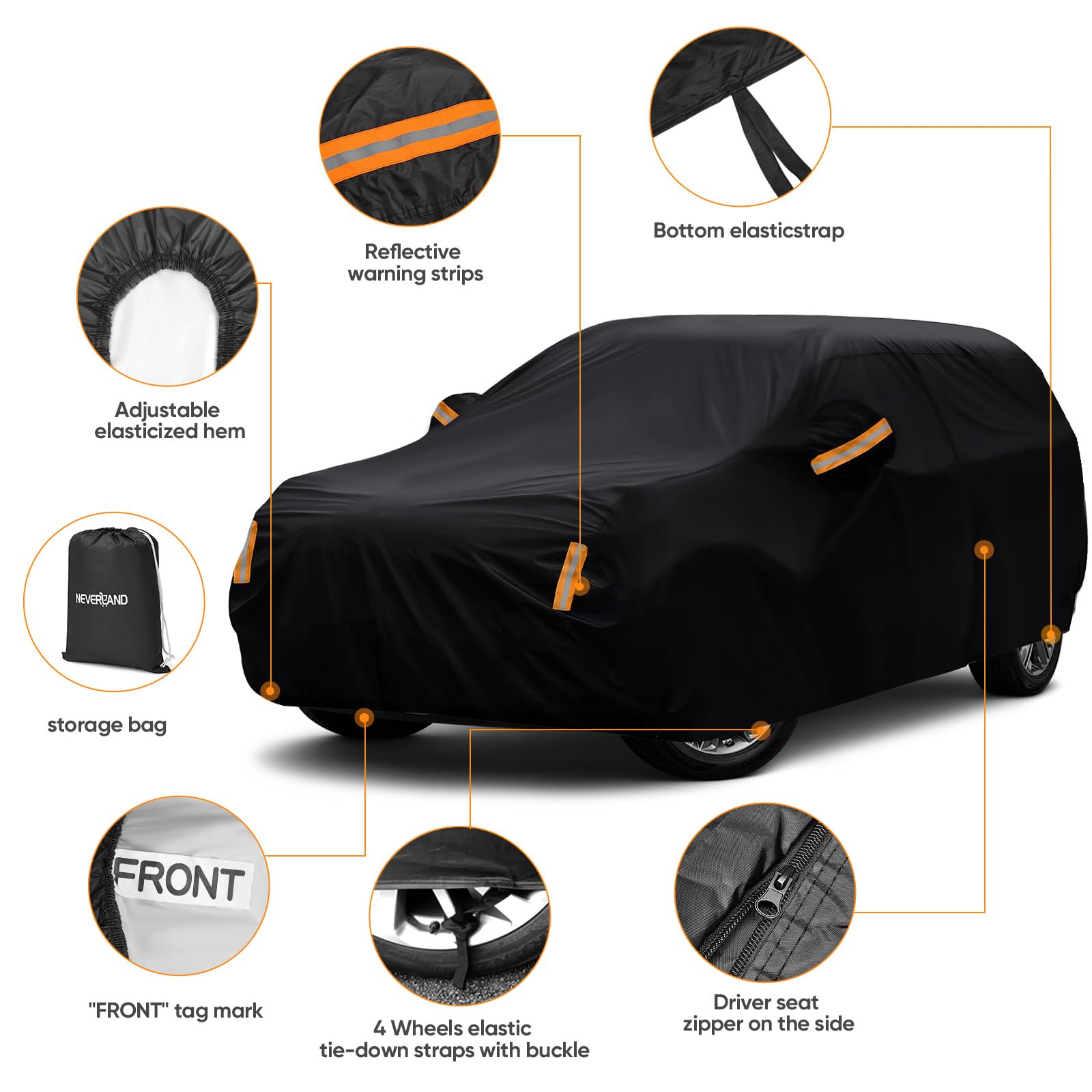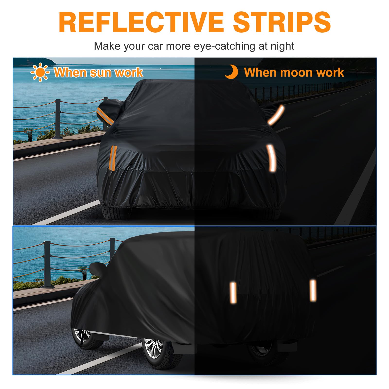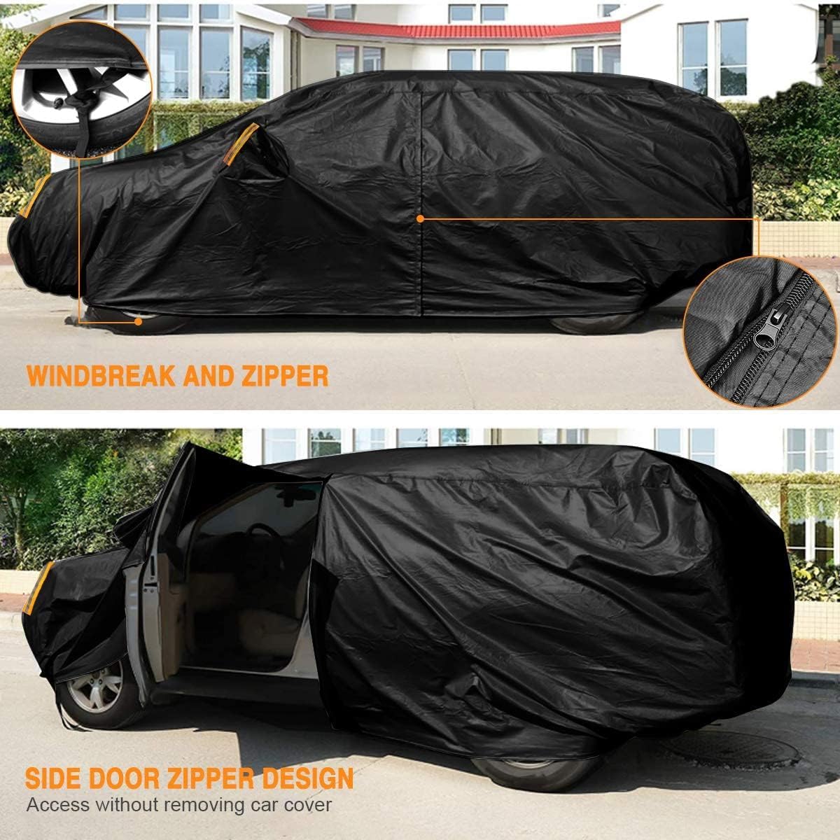 【Unique design】Driver Door Zipper ,Elastic Hem Type & Wheel Fixing Strap: 1)Driver Door Zipper for Easy Access. 2) All four tires can be fixed to Protect Your Auto Cover not Blown Away by Heavy Wind. 3) Reflective Stripes Make you car stay in safe