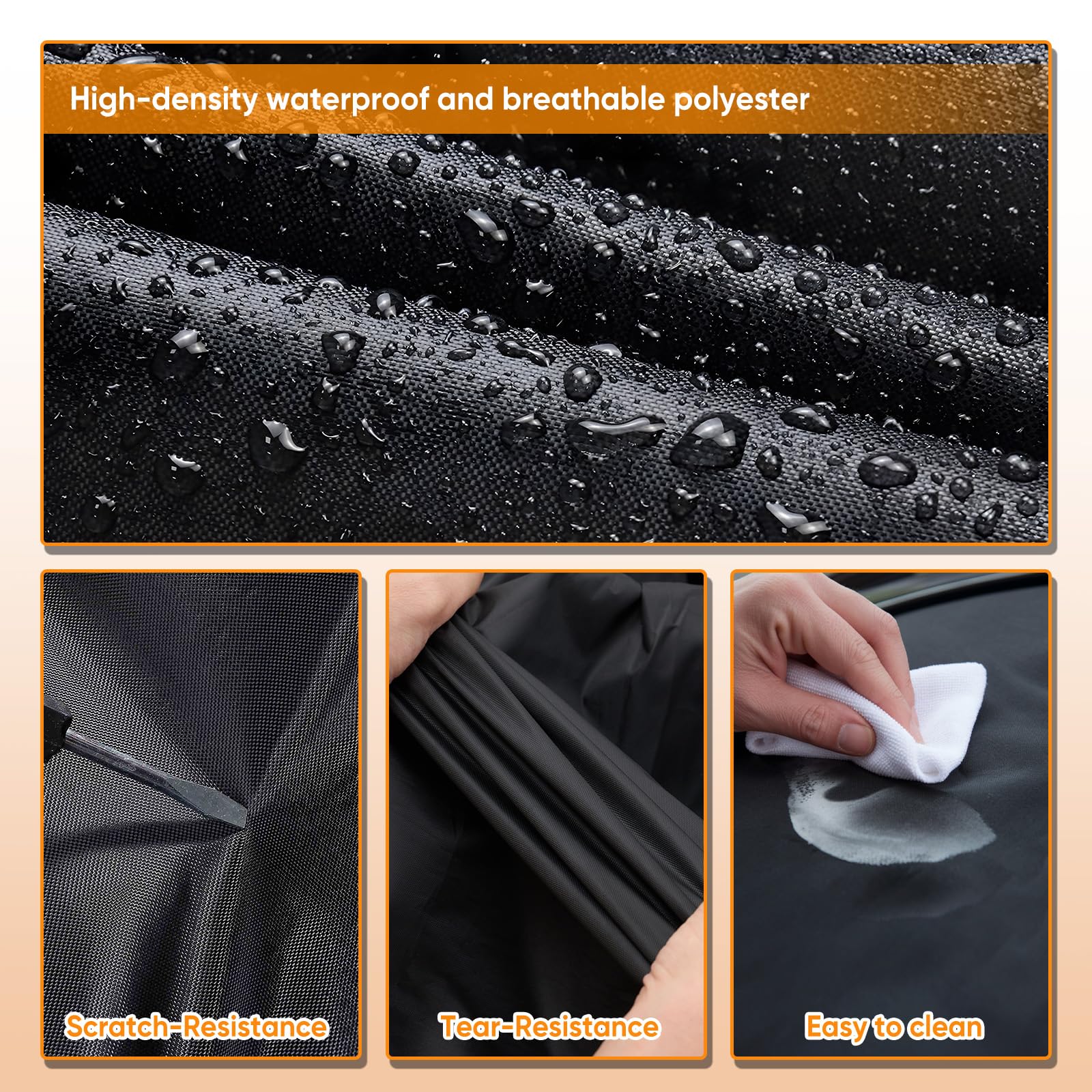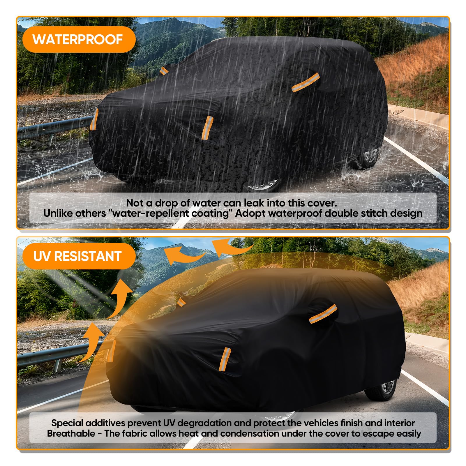 【Premium Material】 NEVERLAND full exterior cover adopt newest secure materials, more wear-resistant and tear resistant.Can withstand 2500mm water pressure, so that the car cover have better water resistance. PA coating is good at sunproof, anti-Uv, keeps cool in hot day, suitable for all season