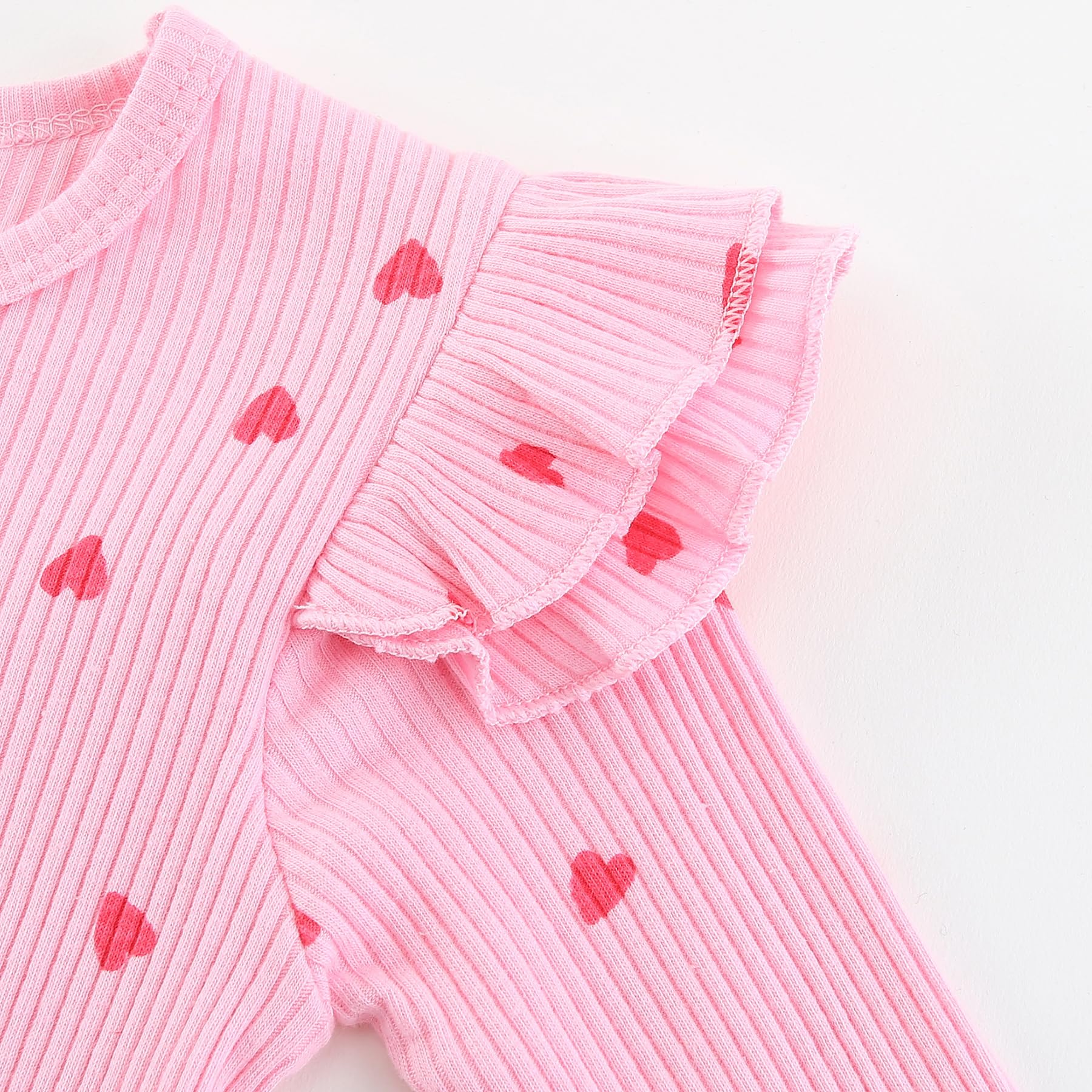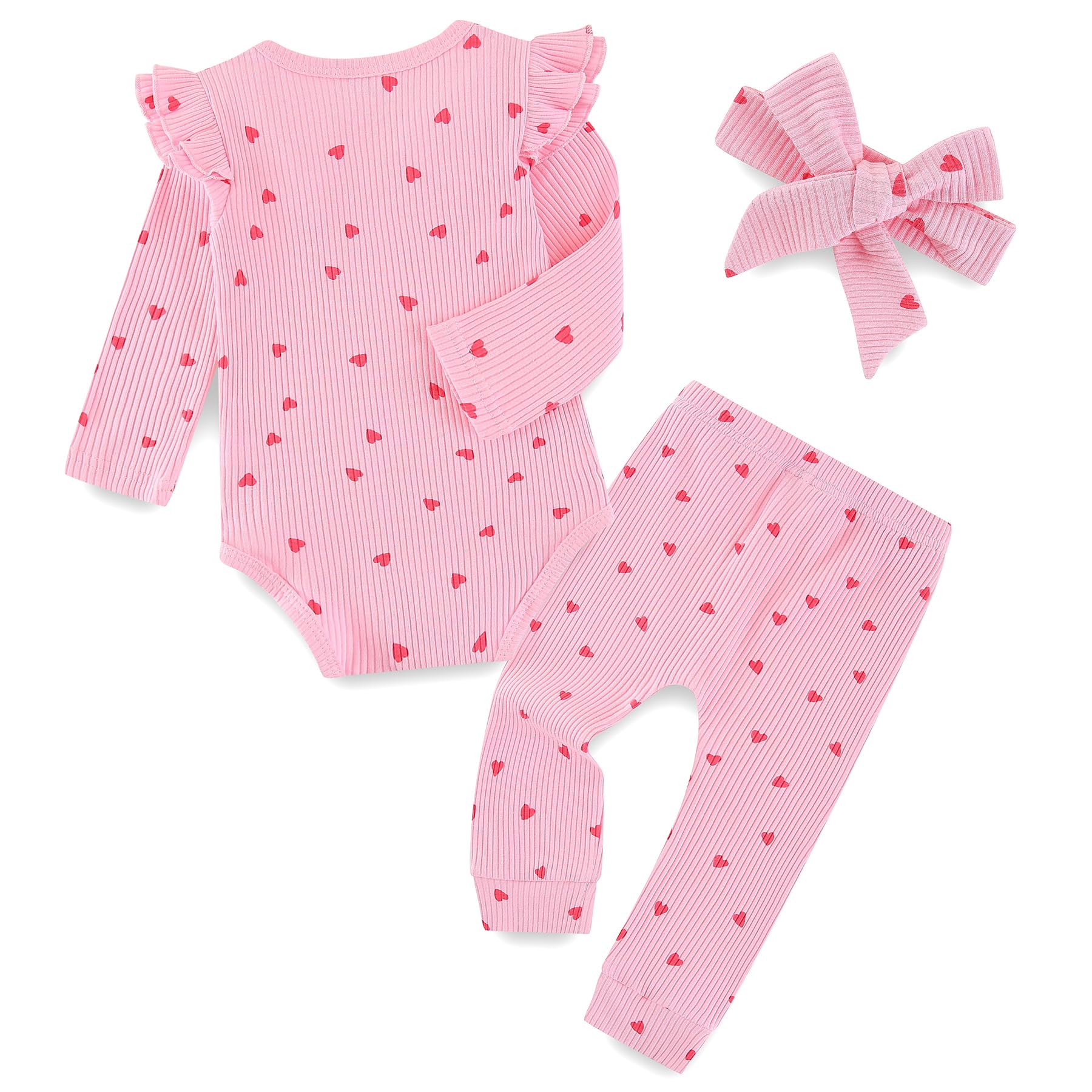 Adorable heart print design and ruffled accents add charm to this 3-piece outfit set