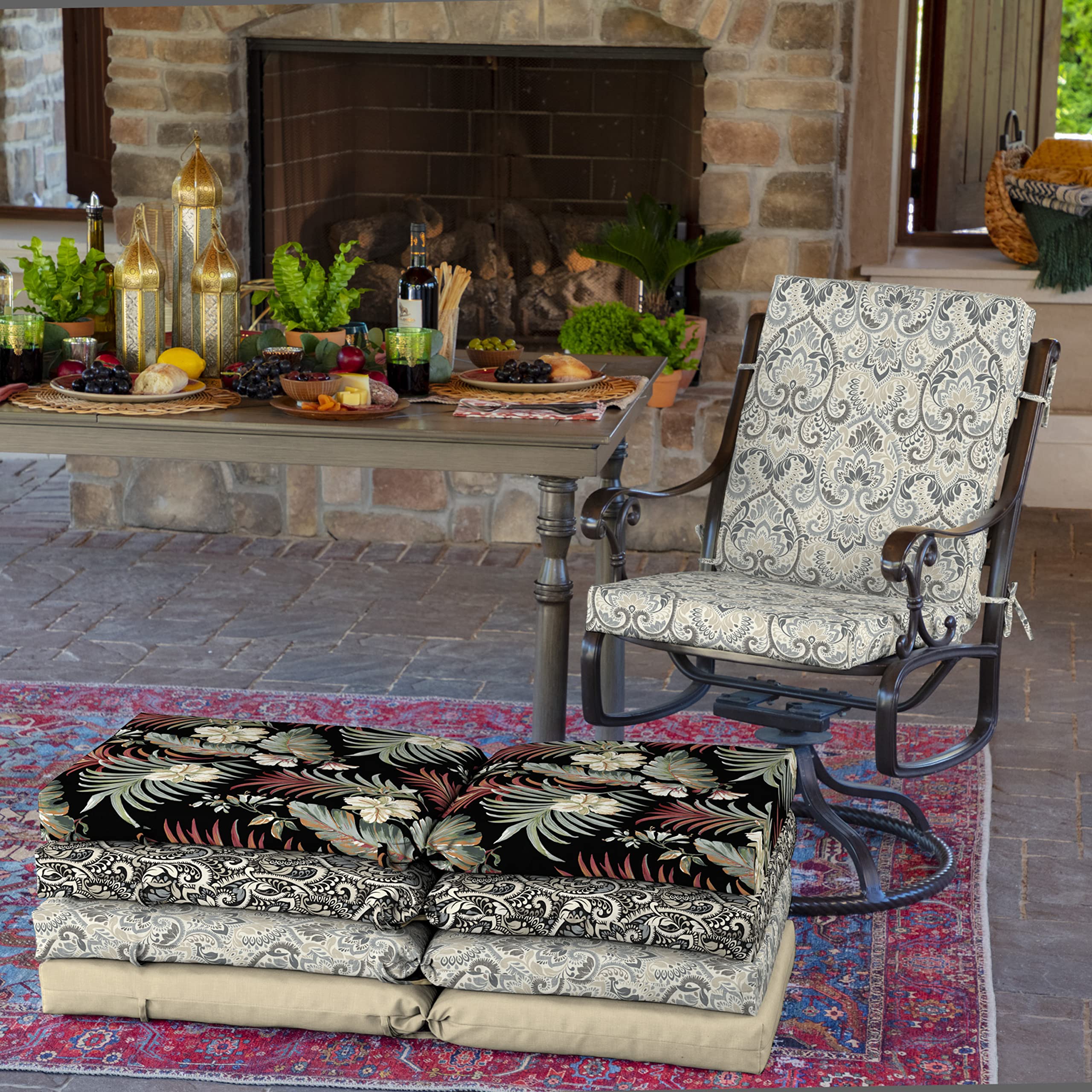 Designed to fit standard outdoor dining chairs, this highback cushion measures 20 in W x 44 in H x 3.5 in T, including a 20 x 20 seat cushion and 20 x 24 chair back for complete seating support