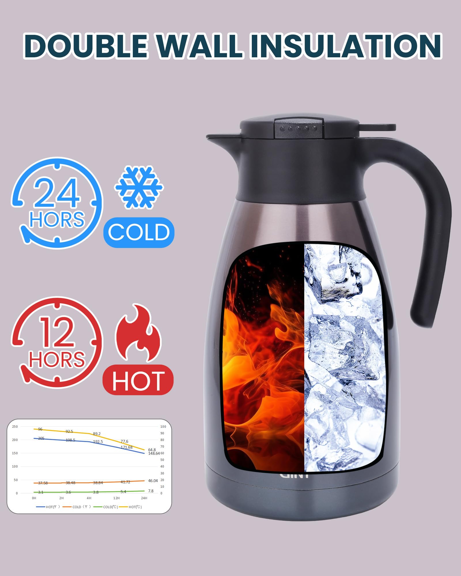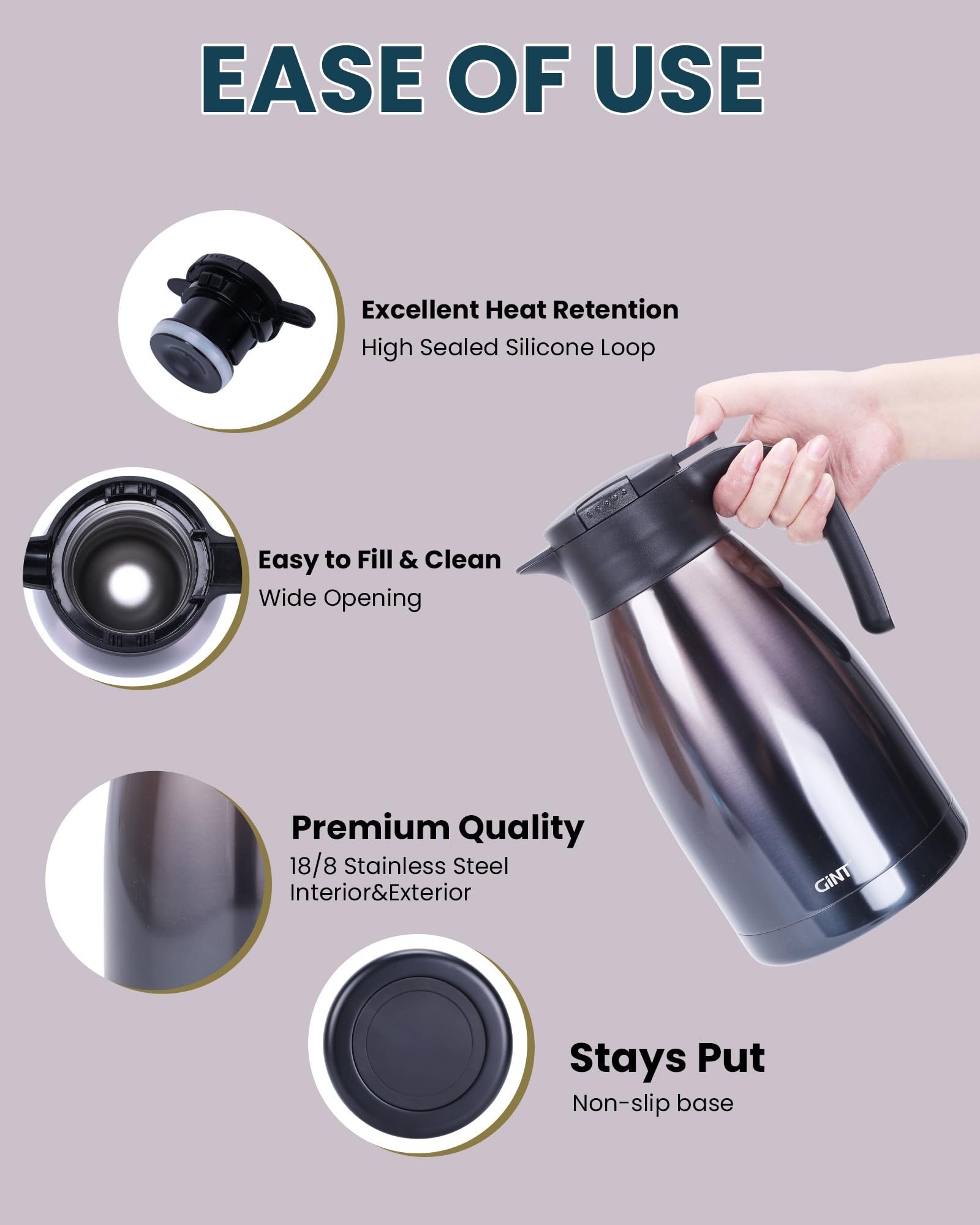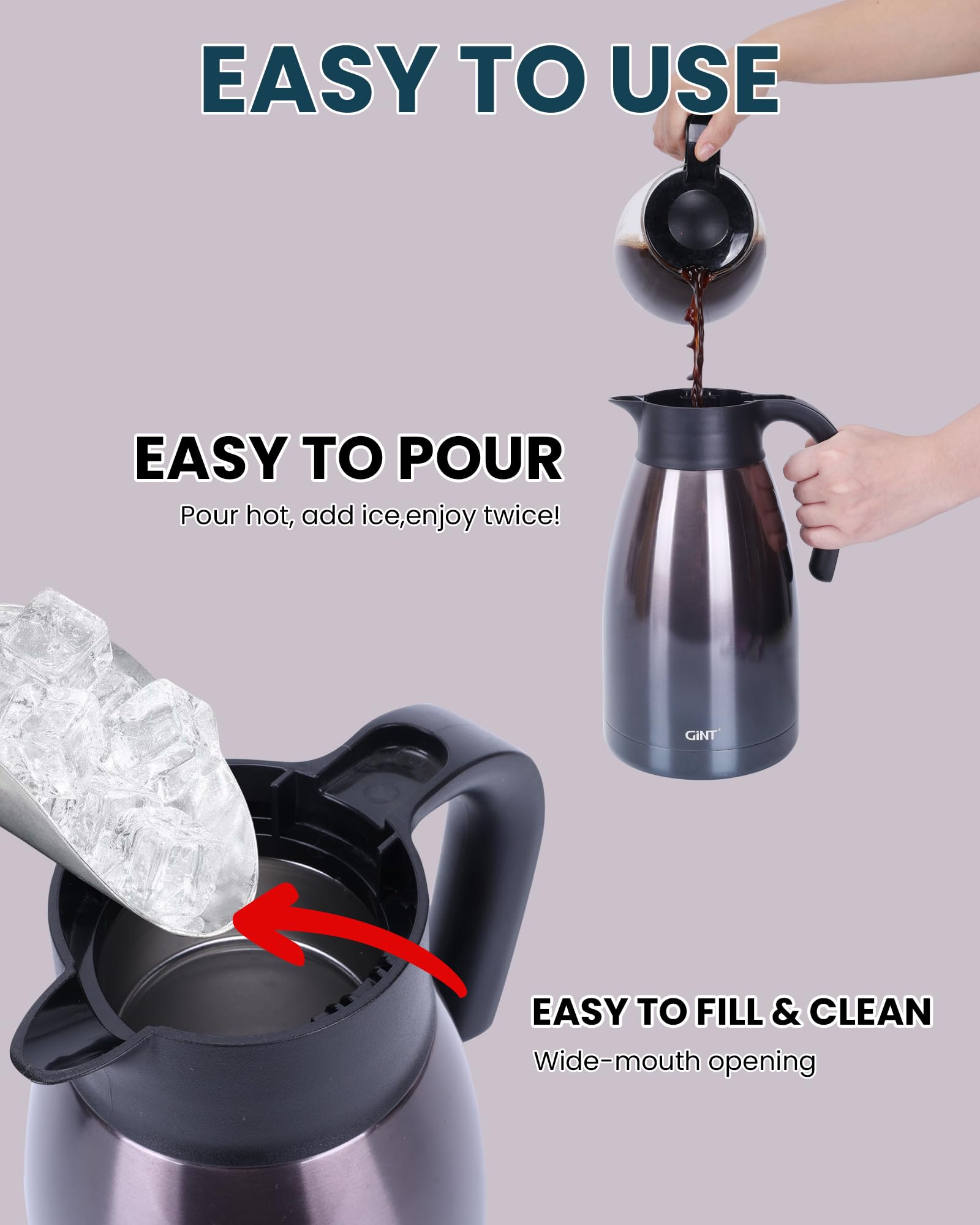 USER FRIENDLY: GiNT 74oz thermal carafe features extra wide top opening, easy for cleaning and adding ice cubes; Simple-push button enables single-hand pouring without leaking, dripping or spilling; Ideal used for bedside, restaurant, office, party, camping, travel insulated coffee carafes.