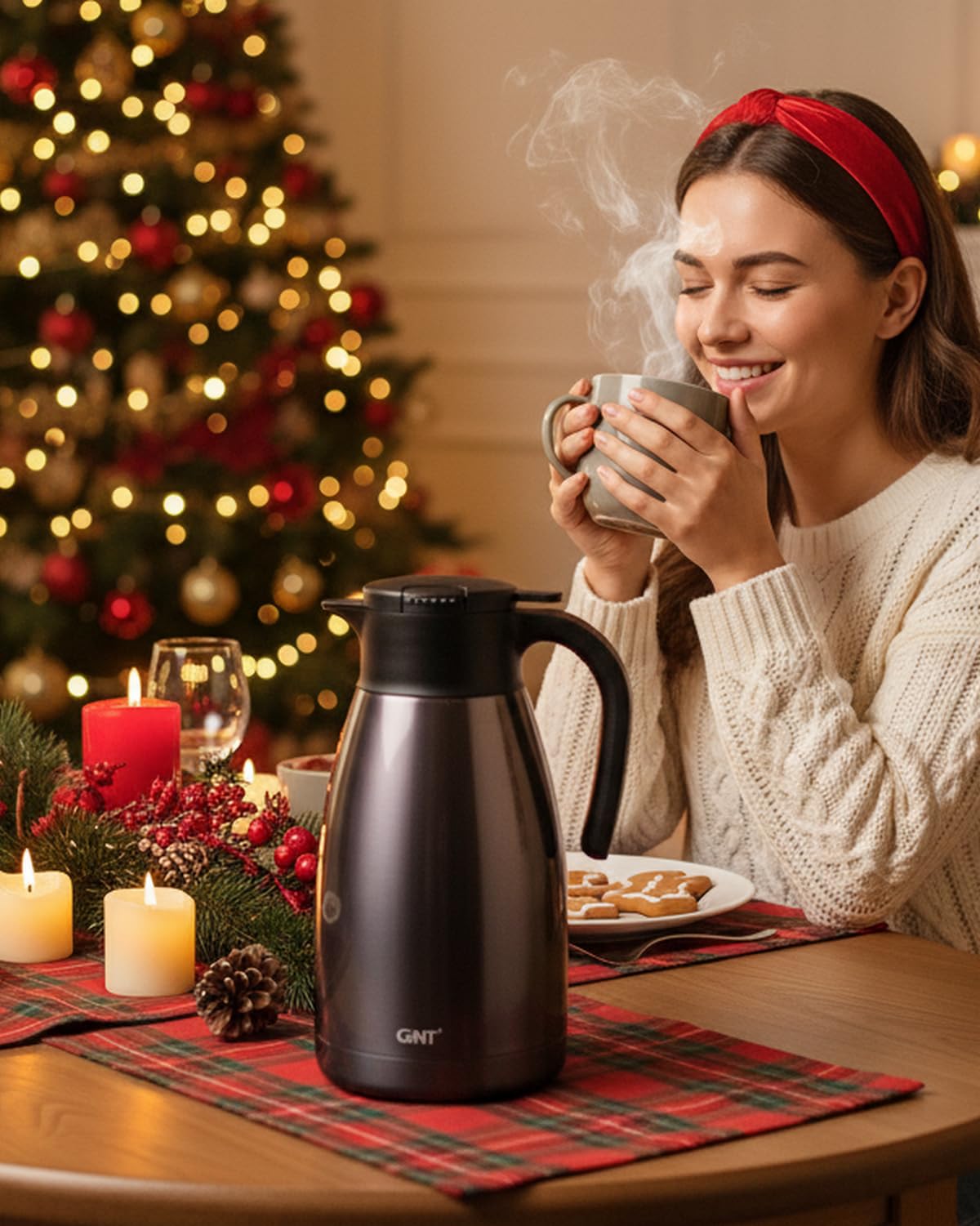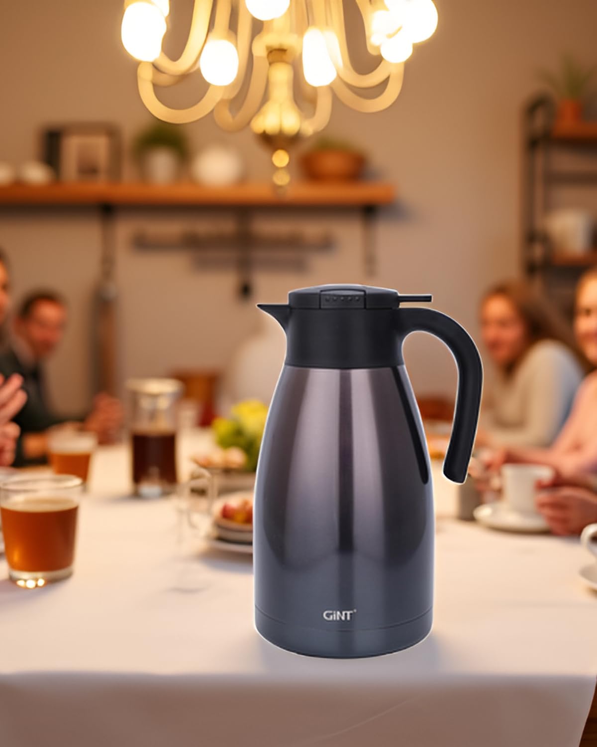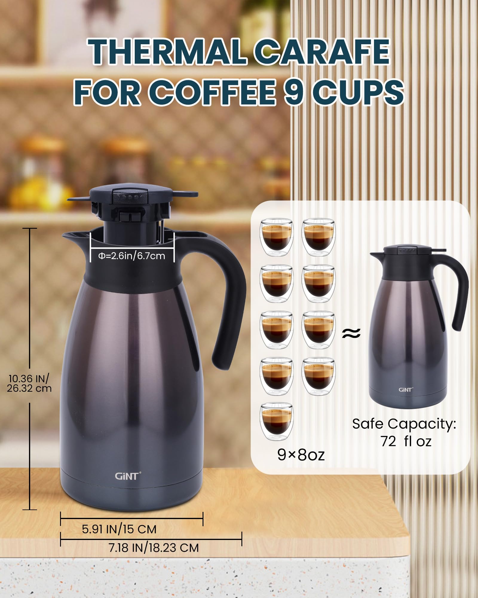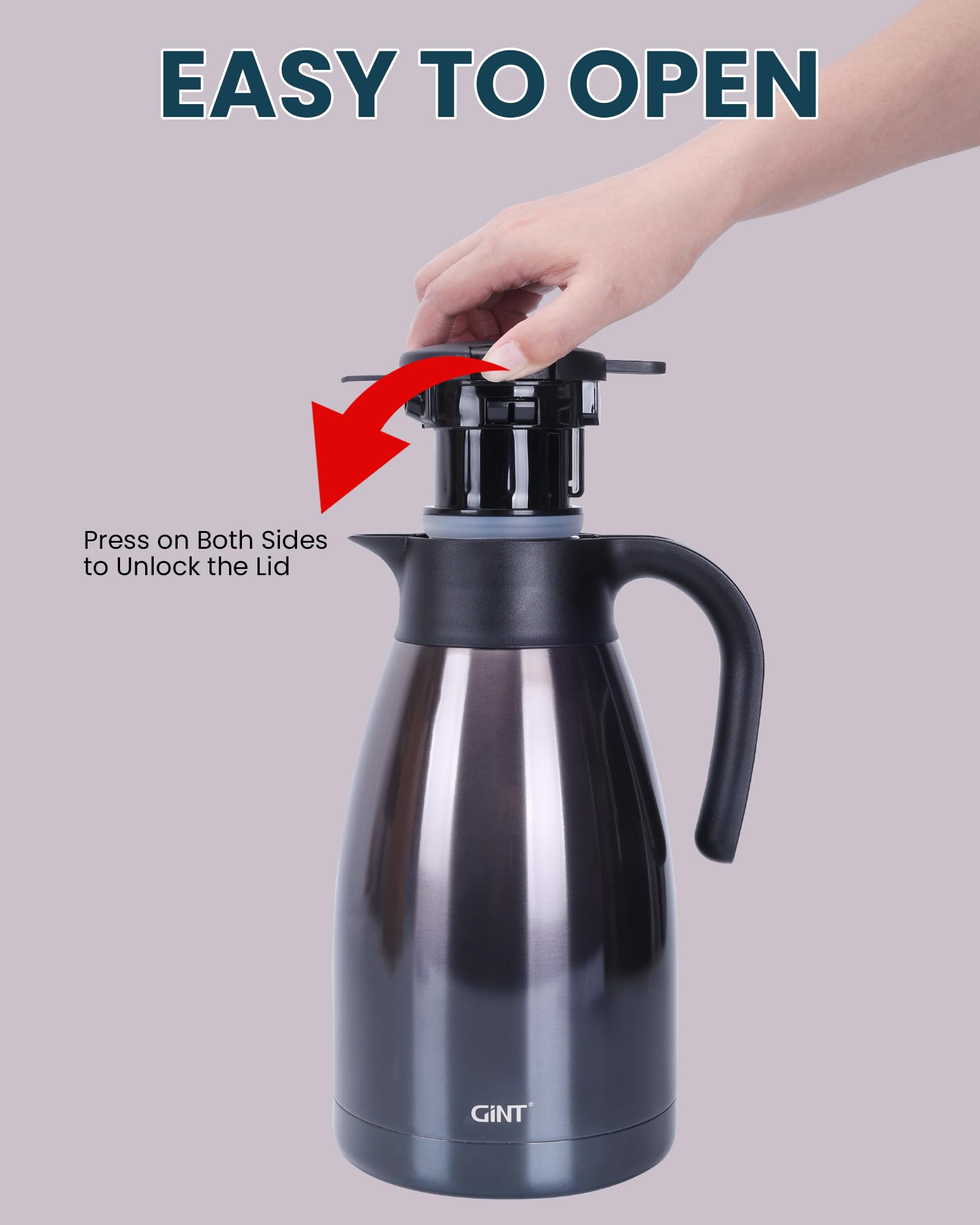 USER FRIENDLY: GiNT 74oz thermal carafe features extra wide top opening, easy for cleaning and adding ice cubes; Simple-push button enables single-hand pouring without leaking, dripping or spilling; Ideal used for bedside, restaurant, office, party, camping, travel insulated coffee carafes.