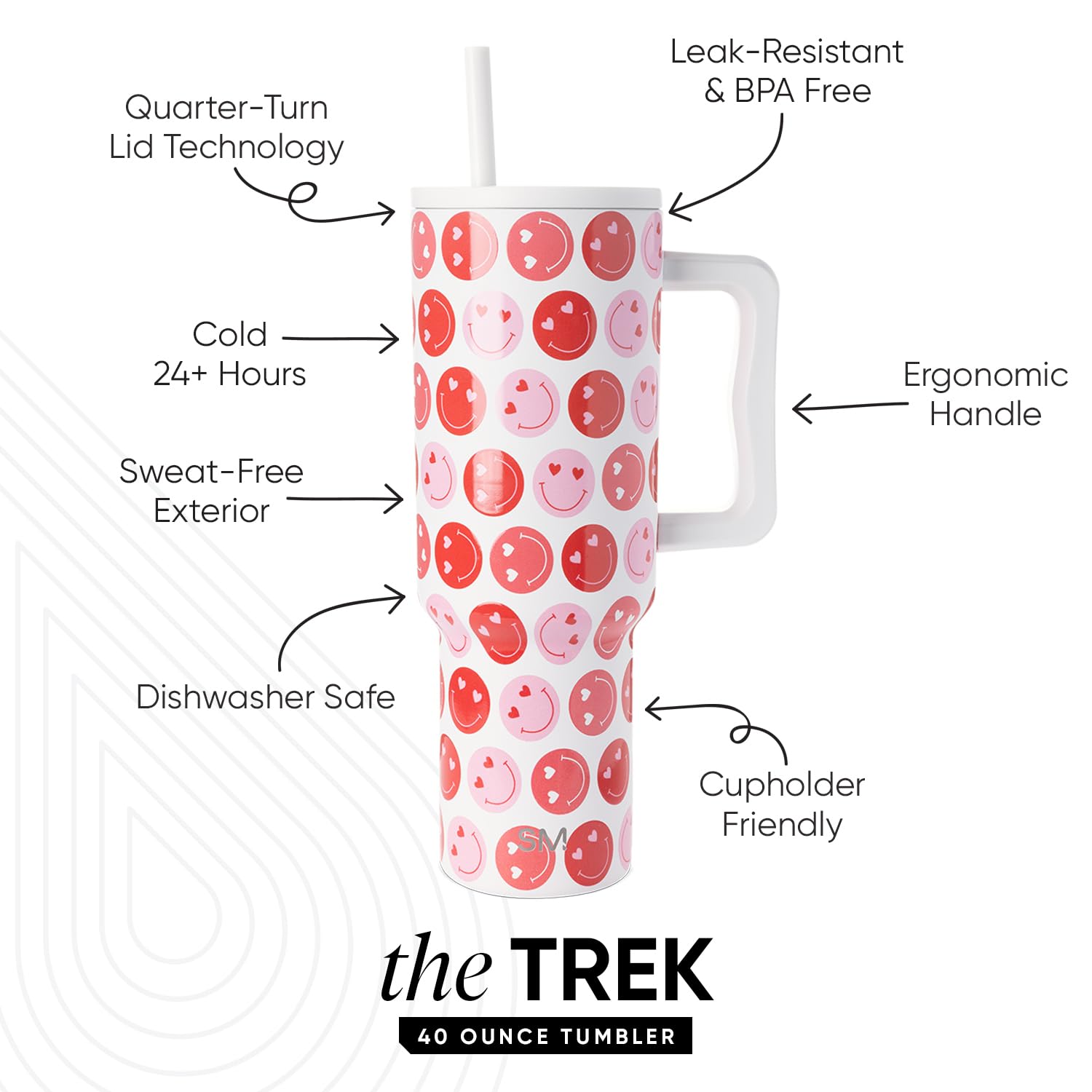 The Simple Modern Trek Tumbler is double walled and vacuum insulated to keep your drink hot or cold for hours. The cup is outfitted with an ergonomic handle, that is aesthetically designed for comfort. It comes with a straw lid and two straws so you can enjoy your favorite beverage on the go. The straw lid is four-way threaded to allow four different straw placements for your drinking hand preference. The Trek is made from 18/8 stainless steel and fits standard cupholders, and with a variety of color options, you can get an Emotional Support Water Bottle for whatever outfit or activity the day entails -- Take Us With You.