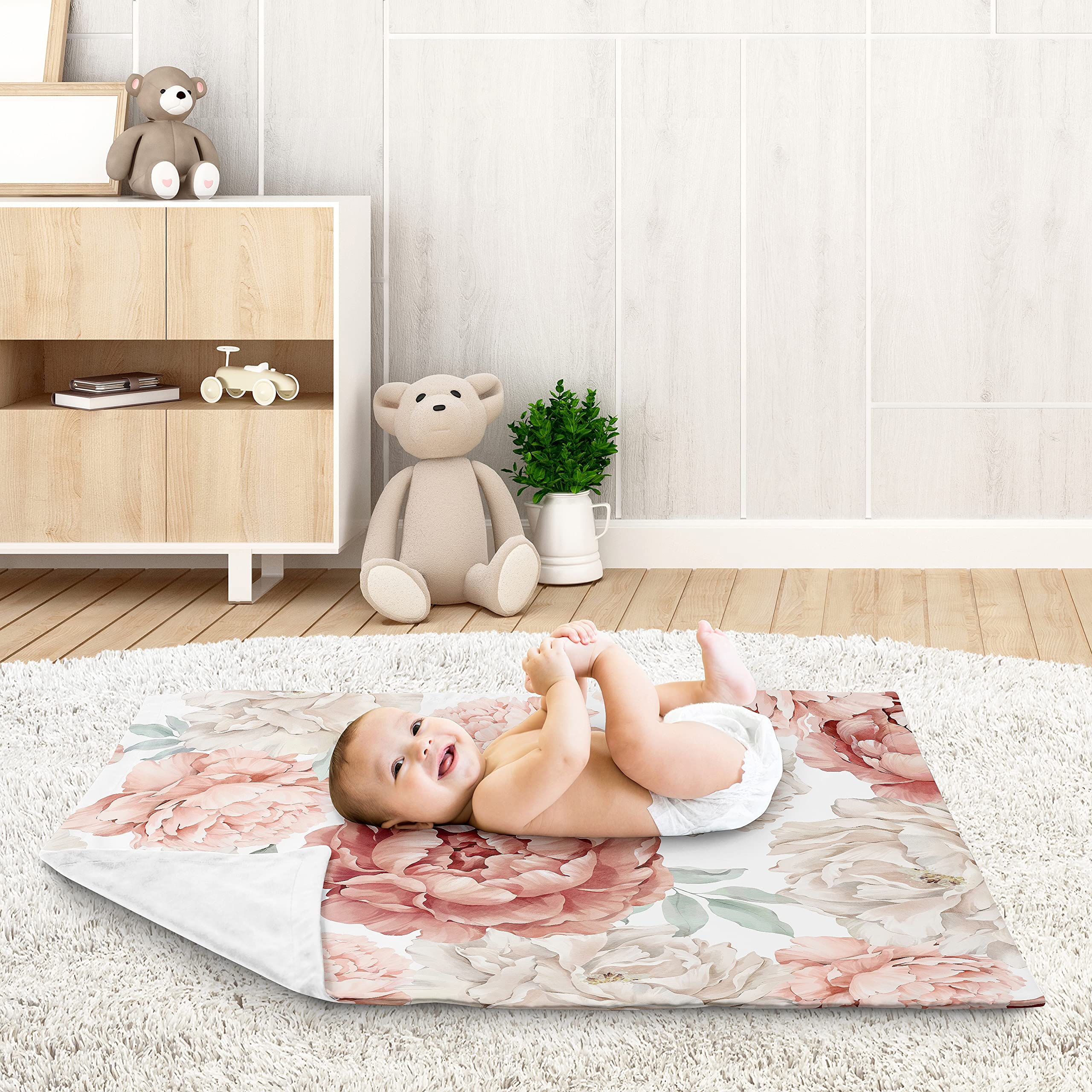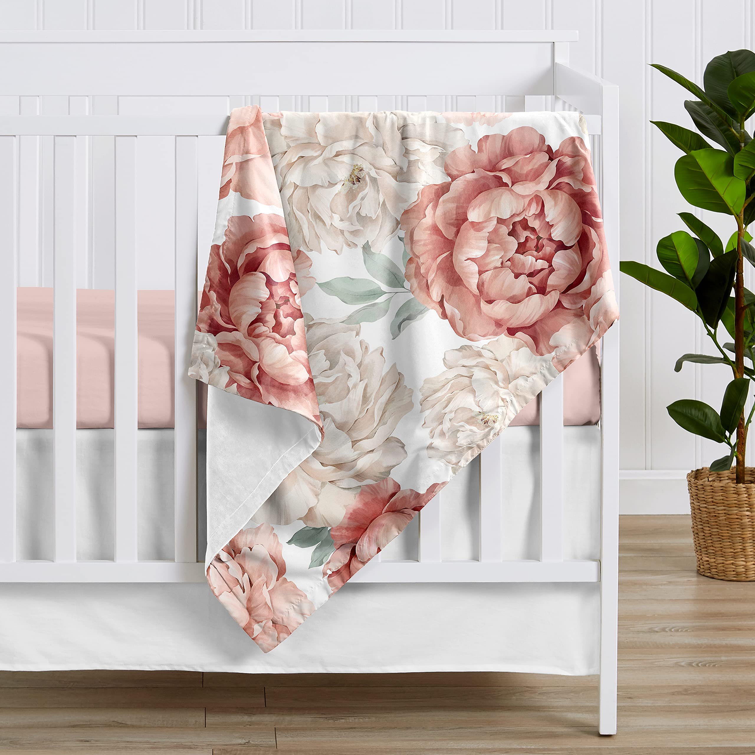 Blanket is designed using a blush pink and ivory boho shabby chic watercolor floral bohemian vintage garden peony flower brushed microfiber print and reverses to soft white minky