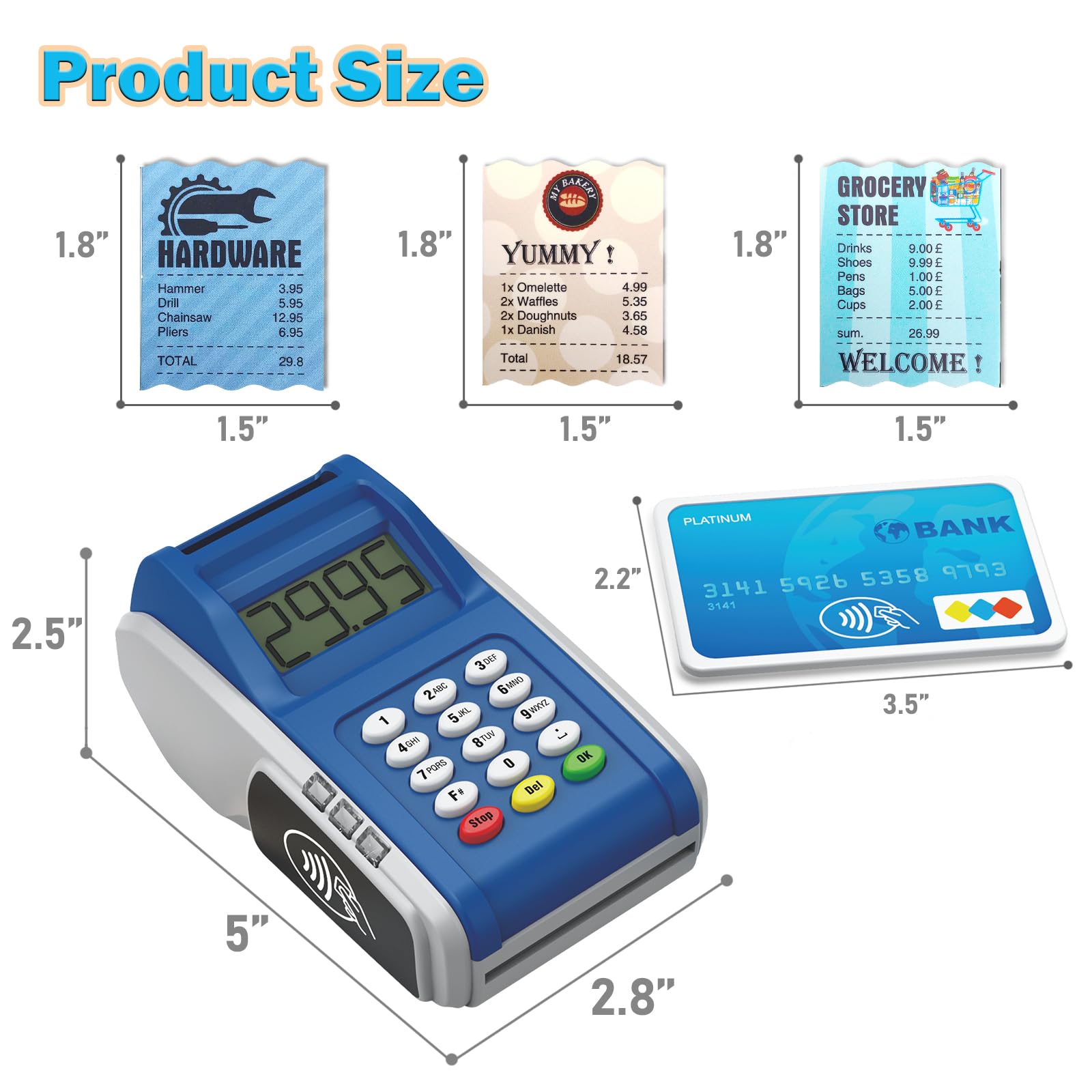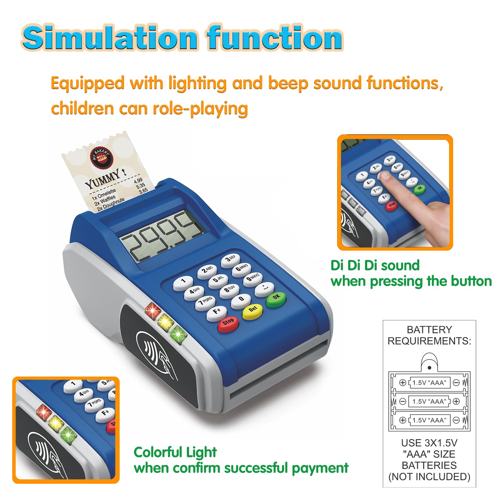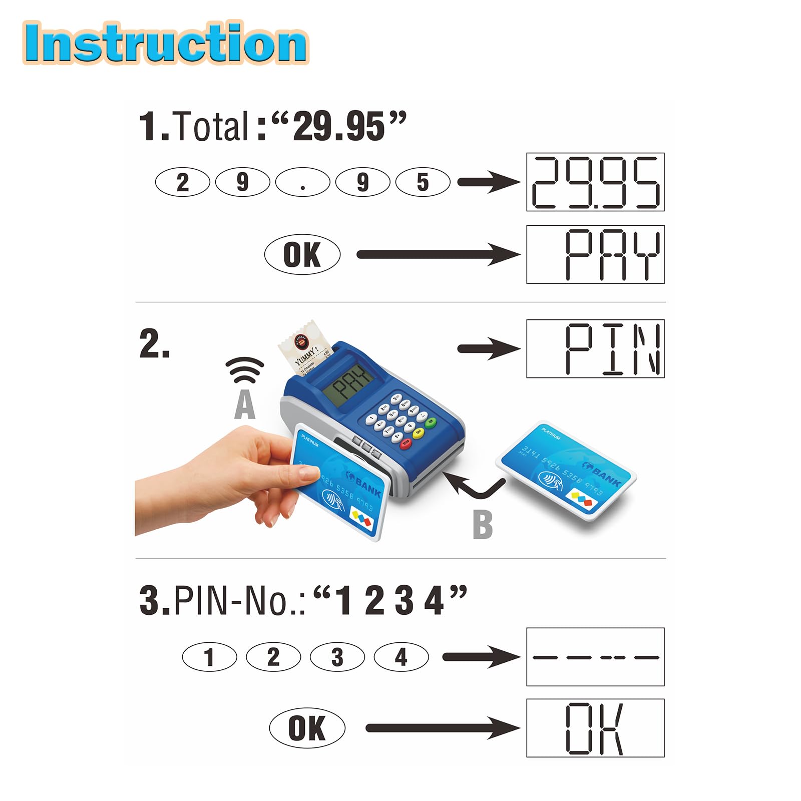 Packaging Included: Look like real payment terminal toy with light and sounds, including 2 credit cards and 2 receipts. Required 3 AAA batteries (Not Included). Encouraging kid to use their imagination ability to play pretend game and satisfying children’s role-playing desires.