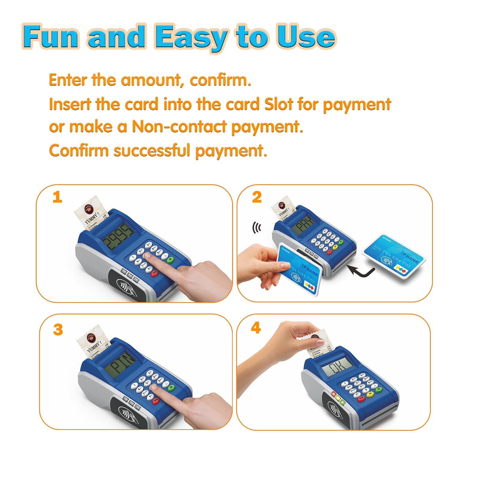 Quality and Safety: The payment terminal toy is made of eco-friendly and ABS plastics, smooth surface, curved corners. Great quality for long-time playing. No harm to kids and environment.