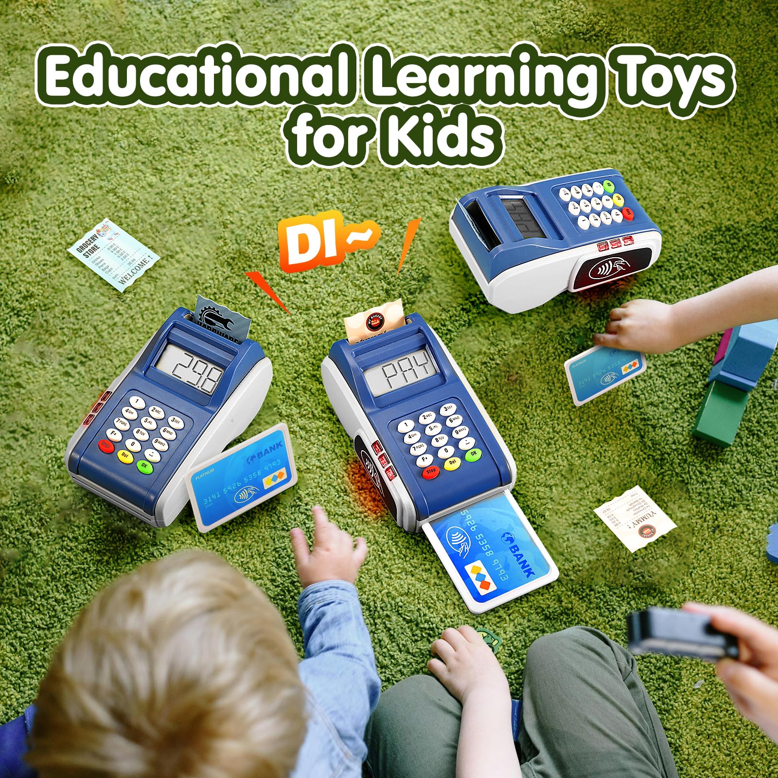 Electronic Point of Sale (POS) Terminal Toy The payment terminal playset included a POS terminal, one credit card and three receipts. It has real sound effects. Kids can experience real life payment just like real payment process. Amazing addition to kids pretend play play store. Parent and children can play tighter with the payment machine. Children can play with their imagination and communication skill. Also, the card reader machine toy helps kids to understand real life shopping and train their essential communication skill for social skills. How to Play: Pretend play interactive game with the POS terminal is easy to start with parents or other little friends. Calculate shopping items then put final figure into the payment terminal, insert the card into the credit card slot for payment or use contactless payment, then put the pin number, next, payment complete with real sound effect. Last, print receipt paper to your customers. Batteries Needed: Required 3 AAA batteries (not included)