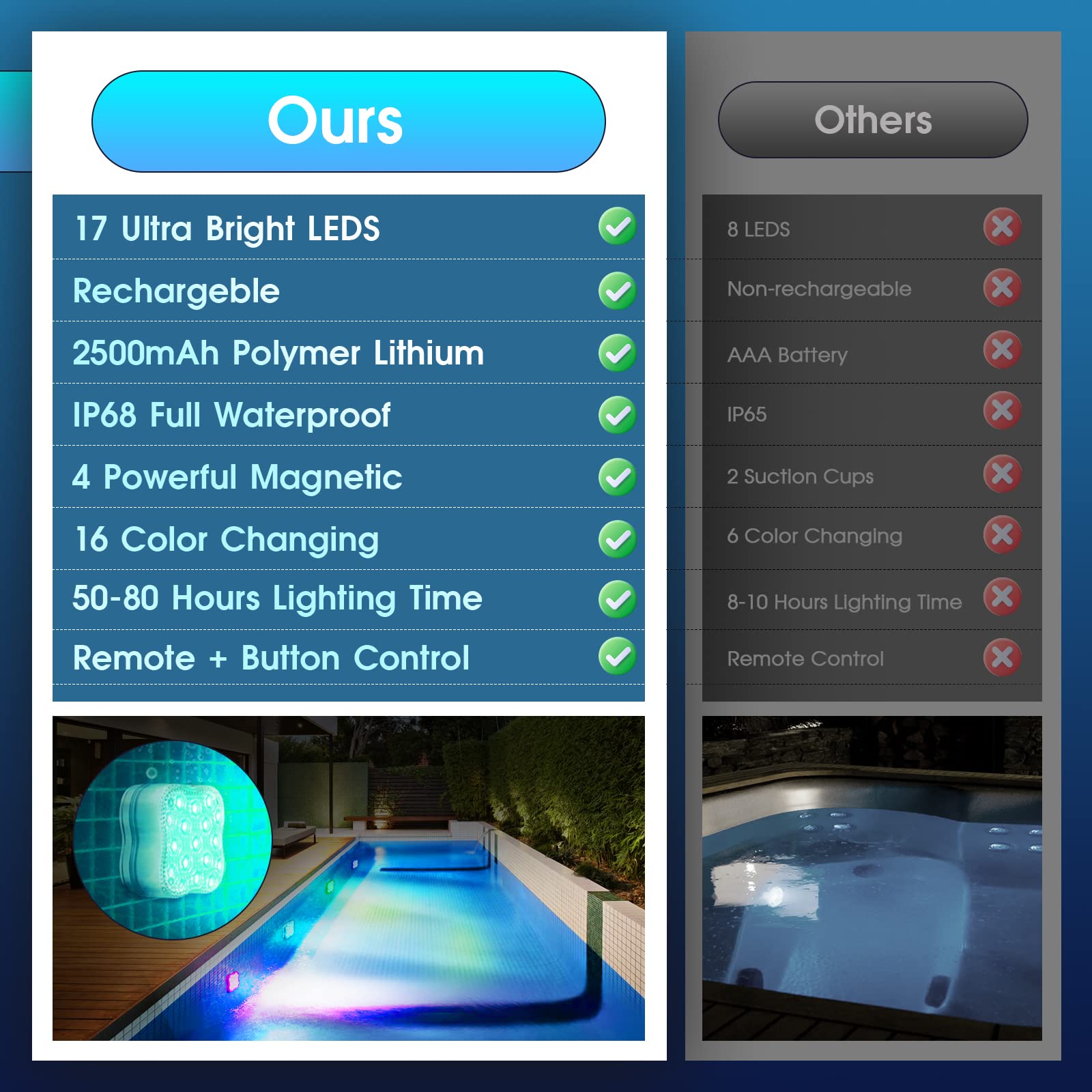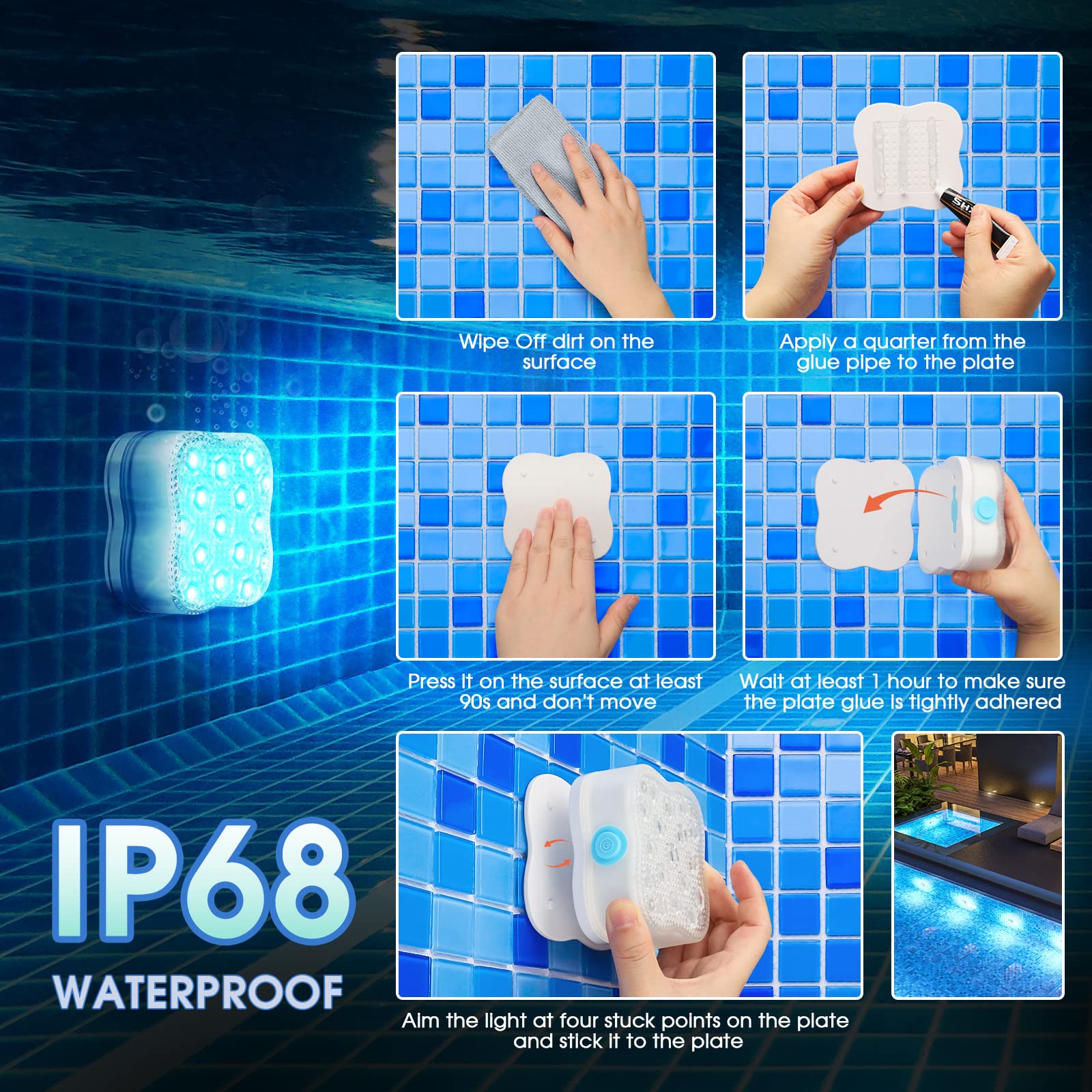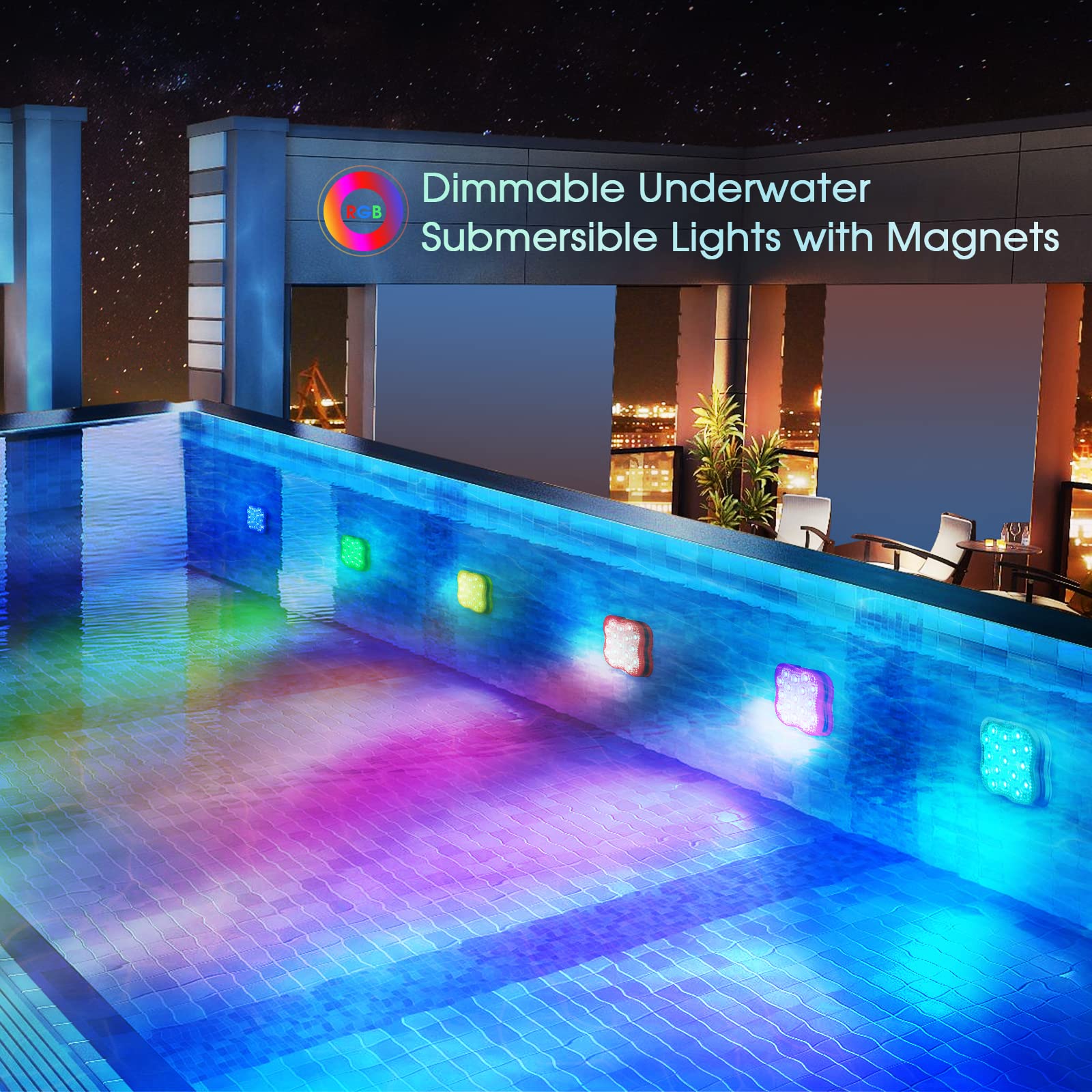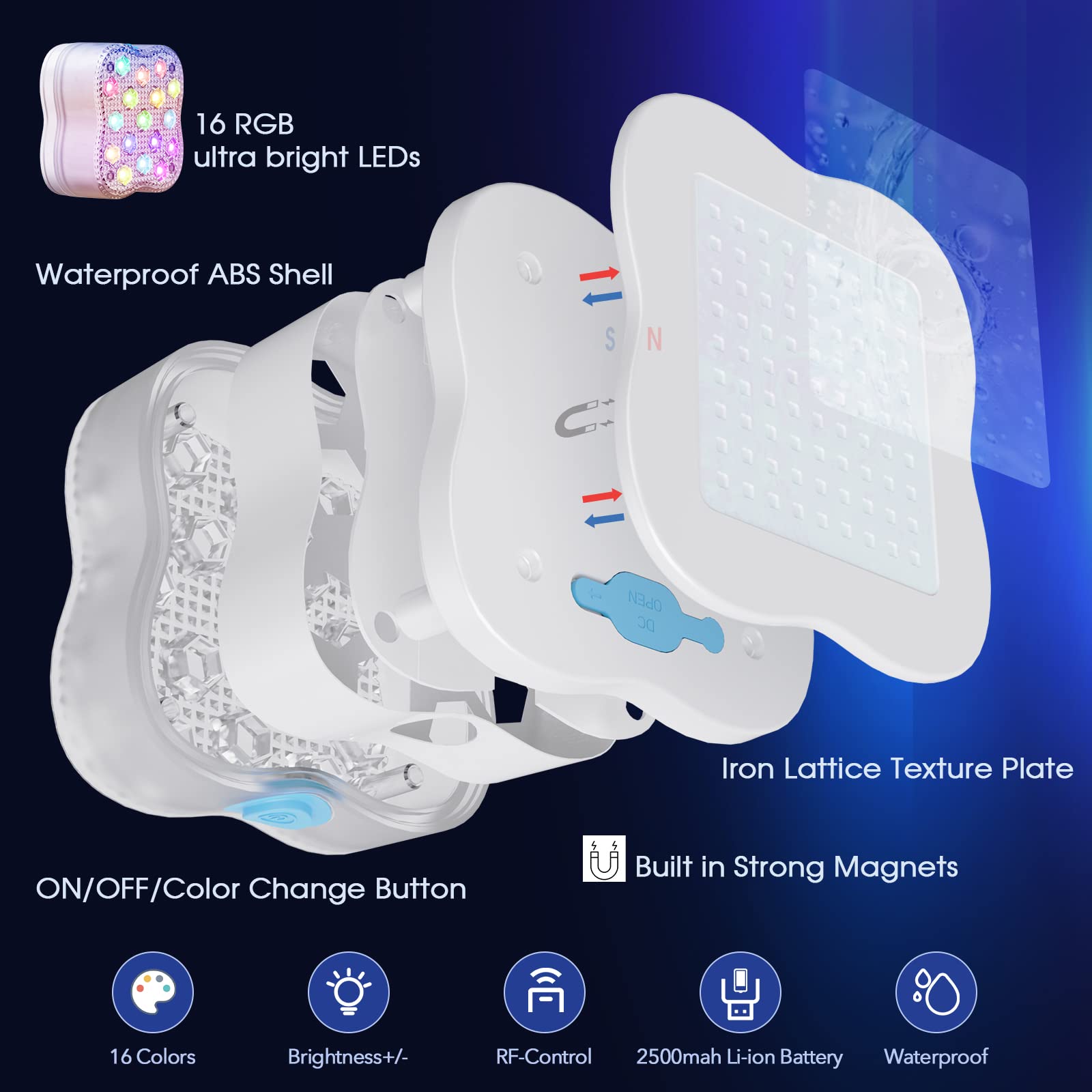 【IP68 Waterproof】Our underwater pool lights have new integrated sealed design. It is IP68 waterful and safe for submersion. Each submersible LED light is equipped with a super magnet inside, so it won't come off when placed on a metal surface.