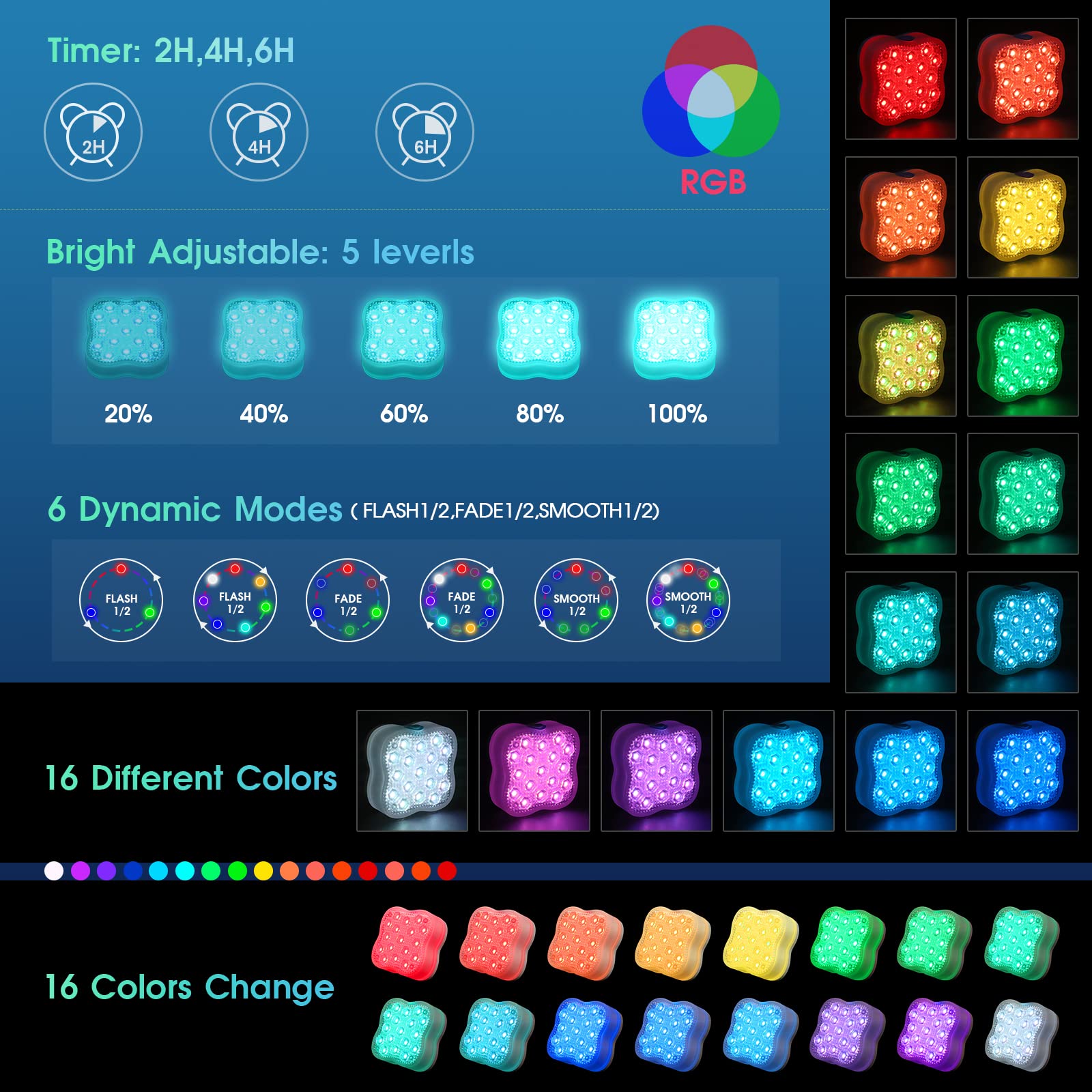 【Color Change LED Lights】Our RGB pool light has 16 kinds of stable color, 6 kinds of dynamic modes (FLASH1/2, FADE1/2, SMOOTH1/2), 3 timer modes (2h, 4h, 6h), 5 kinds of brightness adjustable level, memory function.