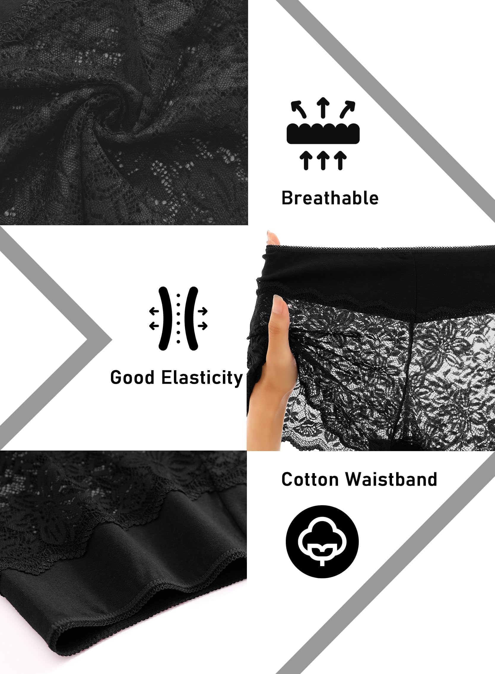 Lace Boyshort Underwear for Women:Our stretch cotton waistband lace boyshort panties feature a distinctive cotton waistband design that offers exceptional elasticity. The elastic waistline provides sturdy support for a variety of waist sizes, ensuring that they stay in place without easily slipping down, making them perfect for everyday life as well as during physical activities. These sexy lingerie offer a stretchy, lightweight and comfortable fit for all-day wear.