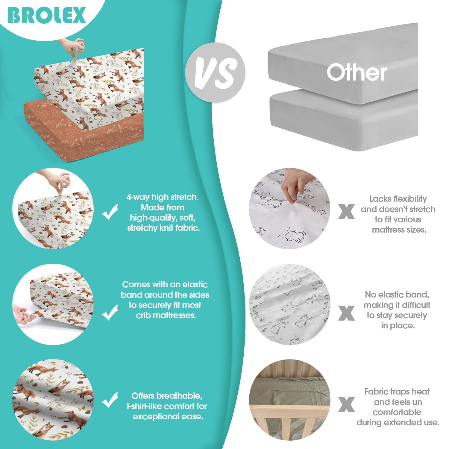 Enhance Your Baby's Sleep with the BROLEX Crib Sheets Transform your baby’s crib into a snug and inviting retreat with the BROLEX fitted crib sheets. Crafted from soft, breathable jersey knit material, these crib sheets provide exceptional comfort and support for your little one. Available in a variety of cute prints, including floral and animal patterns, these sheets are designed to complement any nursery decor and stimulate your baby’s imagination. The BROLEX baby mattress sheets ensure a peaceful and restful sleep, making bedtime a joyful experience for both parents and babies. Key Features: Supreme Comfort: Made from ultra-soft jersey knit, providing a gentle touch that’s kind to your baby’s delicate skin. Charming Designs: Choose from playful prints like floral and animal to inspire your baby's imagination and add a fun touch to the nursery. Breathable Fabric: Allows for excellent airflow, helping to keep your baby cool and comfortable throughout the night. Perfect Fit: Measures 52” x 28” with a 9" deep pocket to securely fit most standard crib and toddler mattresses, offering full coverage and protection. Easy Installation: Equipped with a full elastic band for hassle-free application and removal, ensuring the sheets stay in place and don’t slip off during sleep. Low Maintenance: Machine washable and durable, maintaining their shape and softness even after multiple washes. Free from shrinkage, fading, or pilling. Versatile Style: Available in neutral colors and patterns that effortlessly coordinate with any nursery or daycare theme, making it suitable for both boys and girls. Why Choose BROLEX? Upgrade your baby’s sleep environment with the BROLEX toddler bed sheets and experience the perfect blend of comfort, style, and functionality. Our sheets not only enhance your nursery’s look but also provide a restful and soothing sleep experience for your baby.