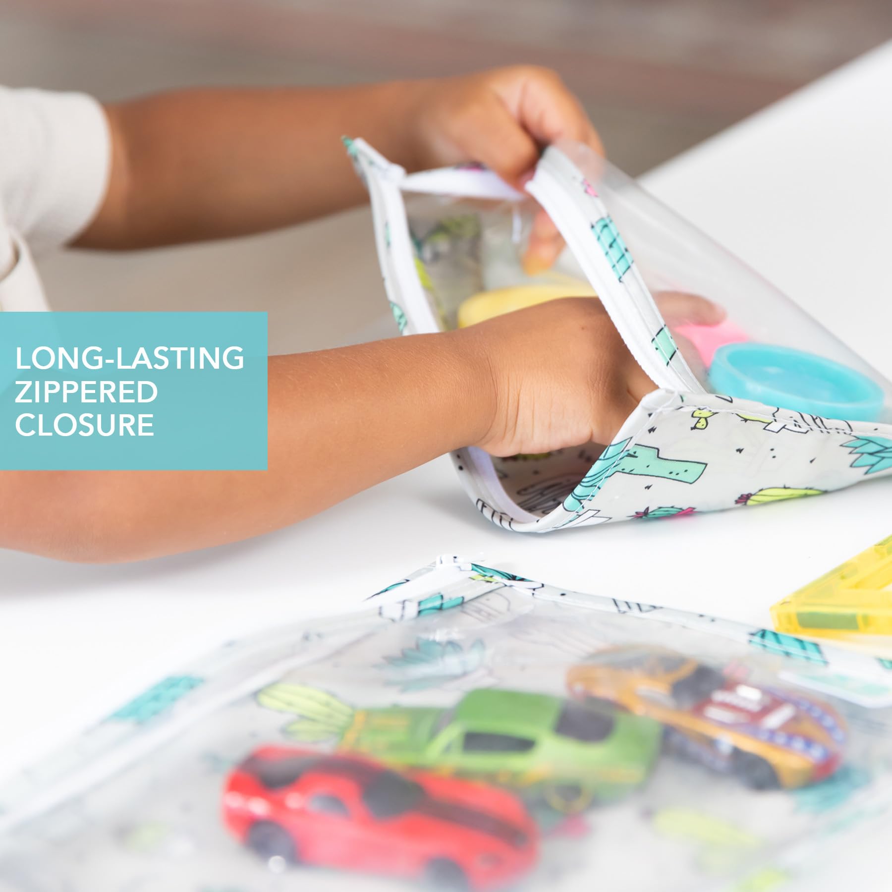 The better alternative to single-use plastic bags, our clear-sided 3-pack reusable travel pouches are TSA compliant, making it easy to go from your day-to-day and then through security. Not just for airplane travel – these travel bags make excellent organizers for toys, accessories, cosmetics, electronics, and more. Our bags keep your items secure. Plus, they’re safe to use. They’re BPA-free, PVC-free, vinyl-free, phthalate-free and lead-free. The set includes 3 sizes: large: 9.5"x 8.5"; medium: 9"x7"; small: 9"x5". Designed in Arizona, responsibly made in China.