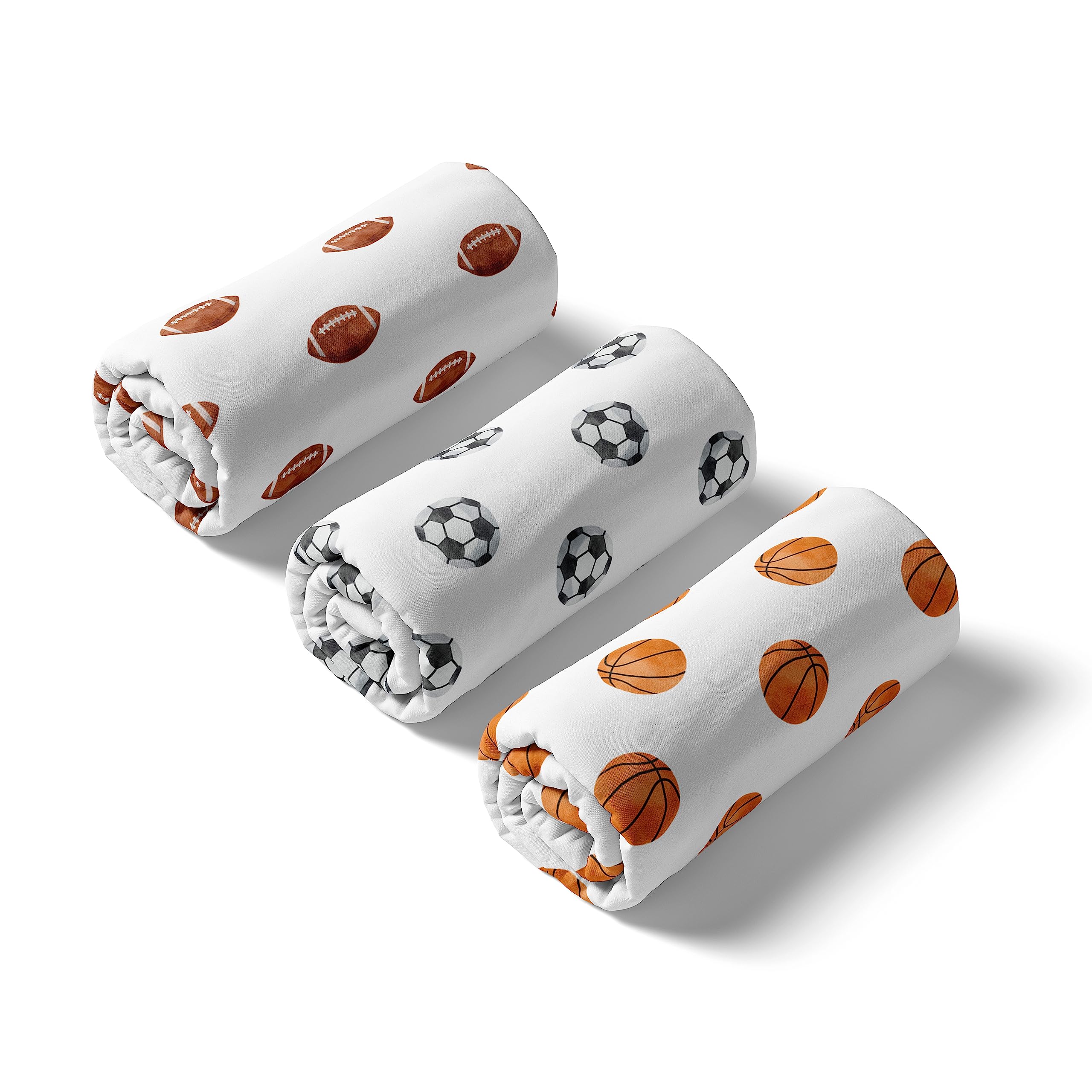 SNUG FIT: Includes: (3) Baby Crib Sheets: 52in. x 28in. x 8in. each. Our newborn standard crib sheets fit snugly, with premium elastic sewn around the entire bottom edge for a secure fit on most standard sized cribs and toddler beds, to reduce shifting and bunching. This microfiber cribsheets set features an exclusive design of a vintage, watercolor sports theme balls brown football print, orange basketball print & soccer balls & is gentle on delicate skin to foster a soothing sleep environment.