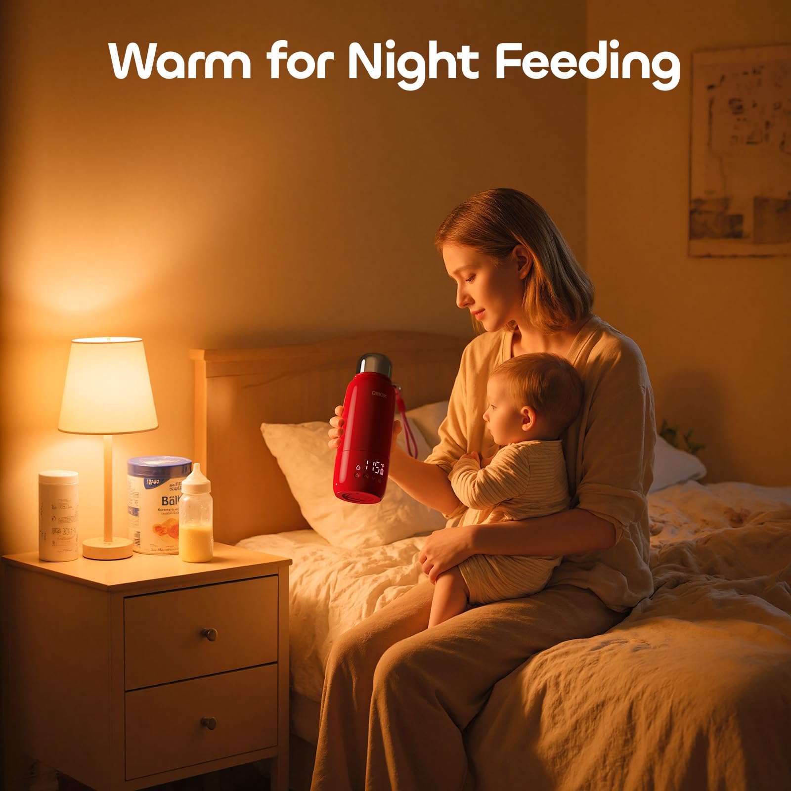 17oz Large Capacity & Long-lasting Heat Retention β This bottle warmer on the go provides enough capacity for multiple feedings, and its compact design allows it to be placed in a daily bag. Hassle-free for outdoor baby feeding. When heated to 212Β°F in normal summer conditions, the water temperature remains at 122Β°F after 24 hours. In winter, the temperature may drop below 122Β°F, but this still demonstrates our exceptional long-term heat retention capabilities.