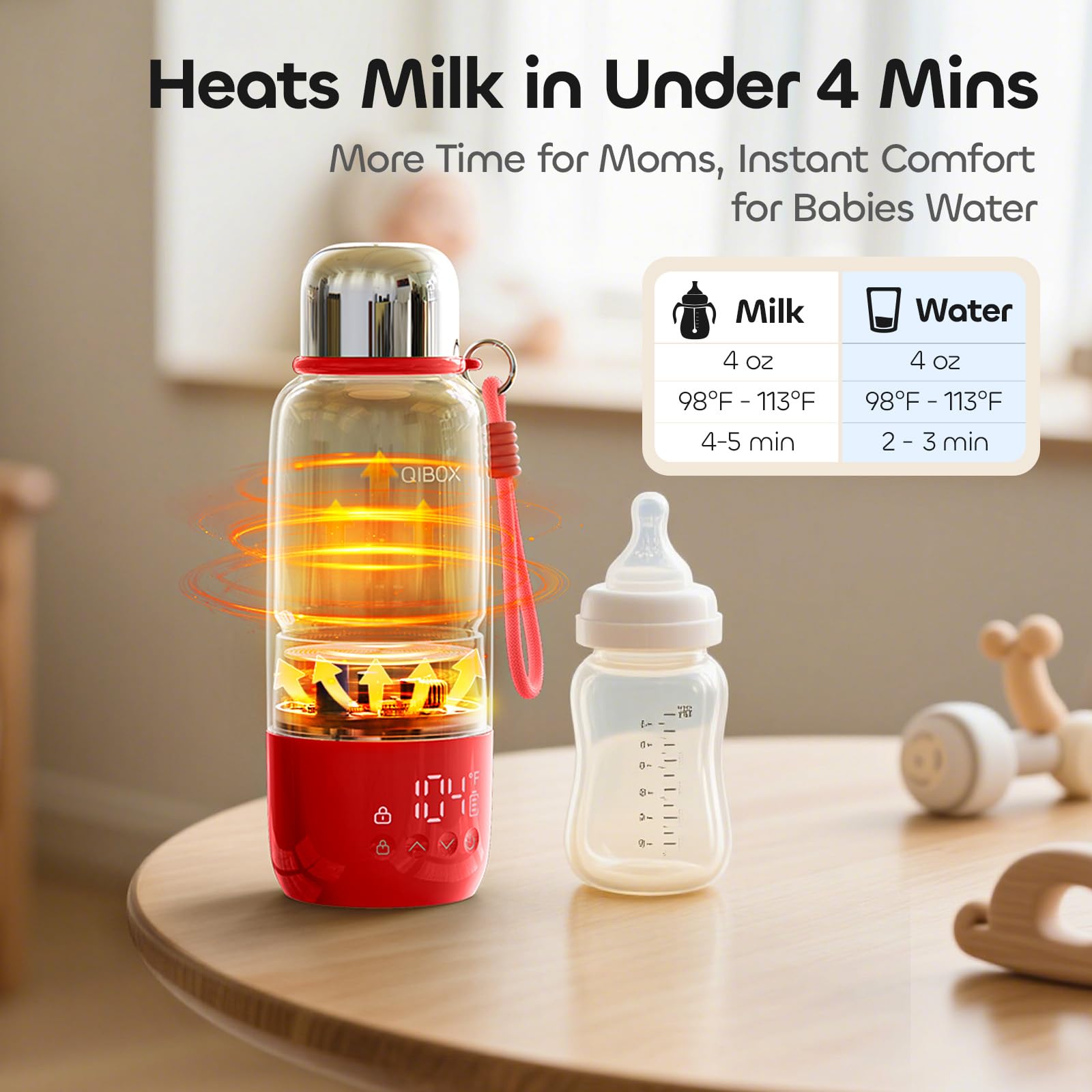 QIBOX Portable Bottle Warmer: Fast, Safe & All-Day Power Tired of waiting for bottles while your baby cries? Meet our all-in-one portable warmer with food-grade safety and incredible battery life. The perfect feeding partner for busy parents on the move. π 120W Lightning-Fast Heating Warm 4oz refrigerated milk to perfect 98Β°F in just 3min 50s. Our powerful 120W system delivers warm milk faster than ever - no more hungry cries during late nights or travel emergencies. π‘οΈ SUS 316L Food-Grade Safety Your baby's safety comes first. The inner chamber uses premium SUS 316L stainless steel - the same material used in medical implants. 100% food-grade, BPA-free for complete peace of mind. π 16000mAh All-Day Battery The massive battery heats up to 8 bottles of milk or 20 portions of water per charge. With 30W fast charging, it powers up in under 2 hours. Perfect for long trips without outlet access. βοΈ 17oz Capacity + 24H Heat Big enough for multiple feedings yet. Our advanced insulation keeps water at 122Β°F even after 24 hours - ready whenever you need it. ποΈ Precise Temp Control + Free Brush Choose any temperature from 99Β°F to 212Β°F for milk, formula, or baby food. We even include a free cleaning brush to make maintenance effortless! Make feeding stress-free anywhere, anytime!