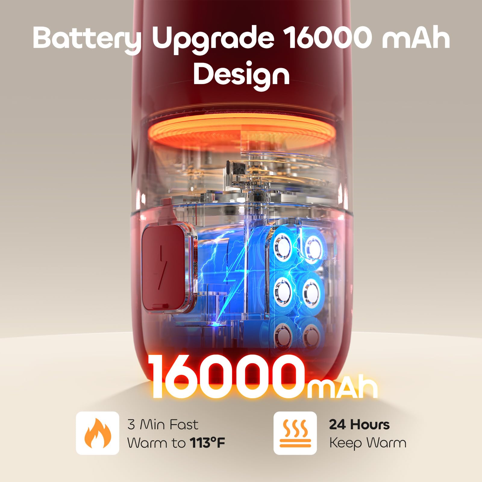 16000mAh Large Battery Capacity & 30W Fast Charging β The portable bottle warmer boasts an extended battery life. One full charge heats 8 (4-oz) portions of refrigerated breast milk and 20 (4-oz) portions of water, covering a day's feeding needs. With 30W fast charging, it fully recharges in under 2 hours, so you're always ready to go.