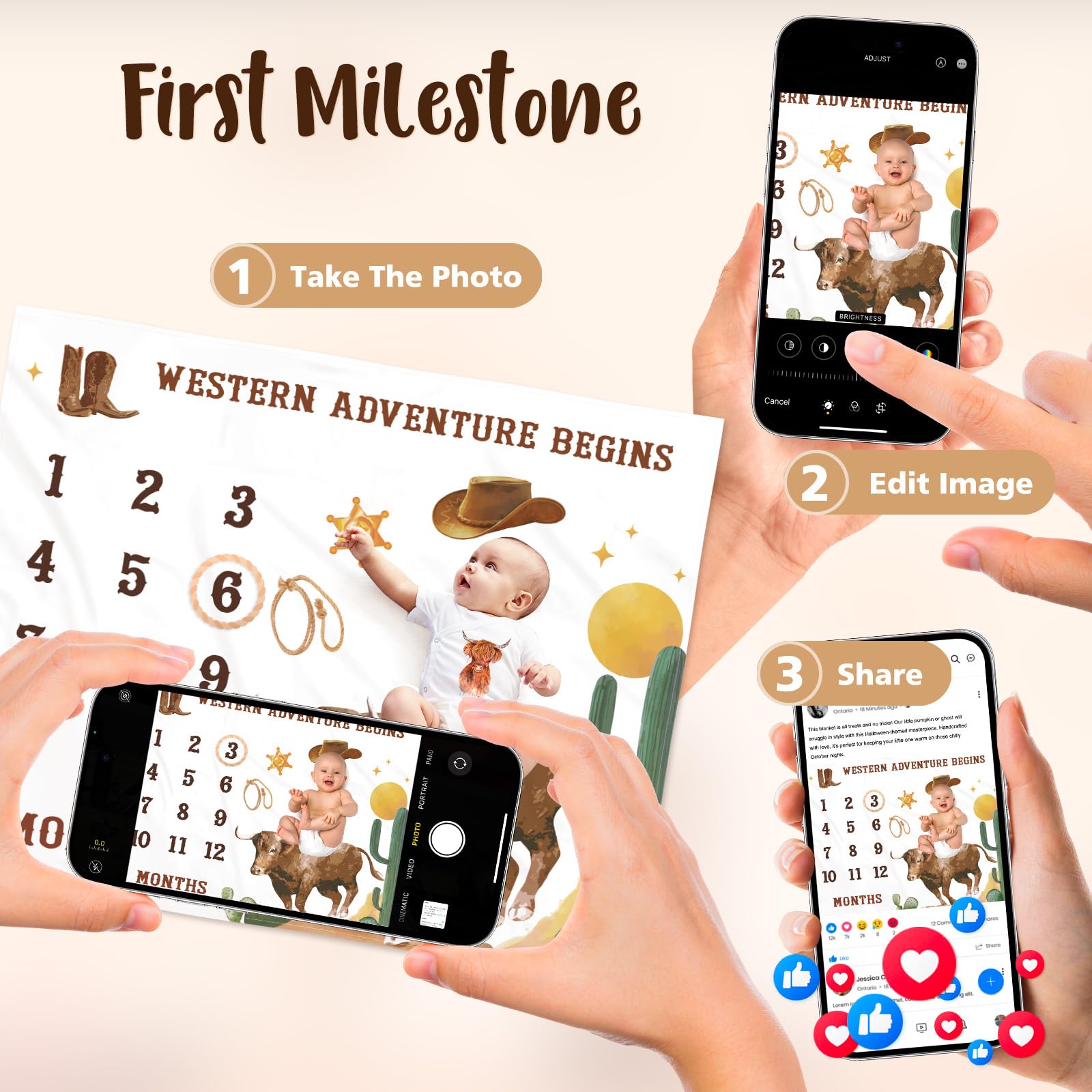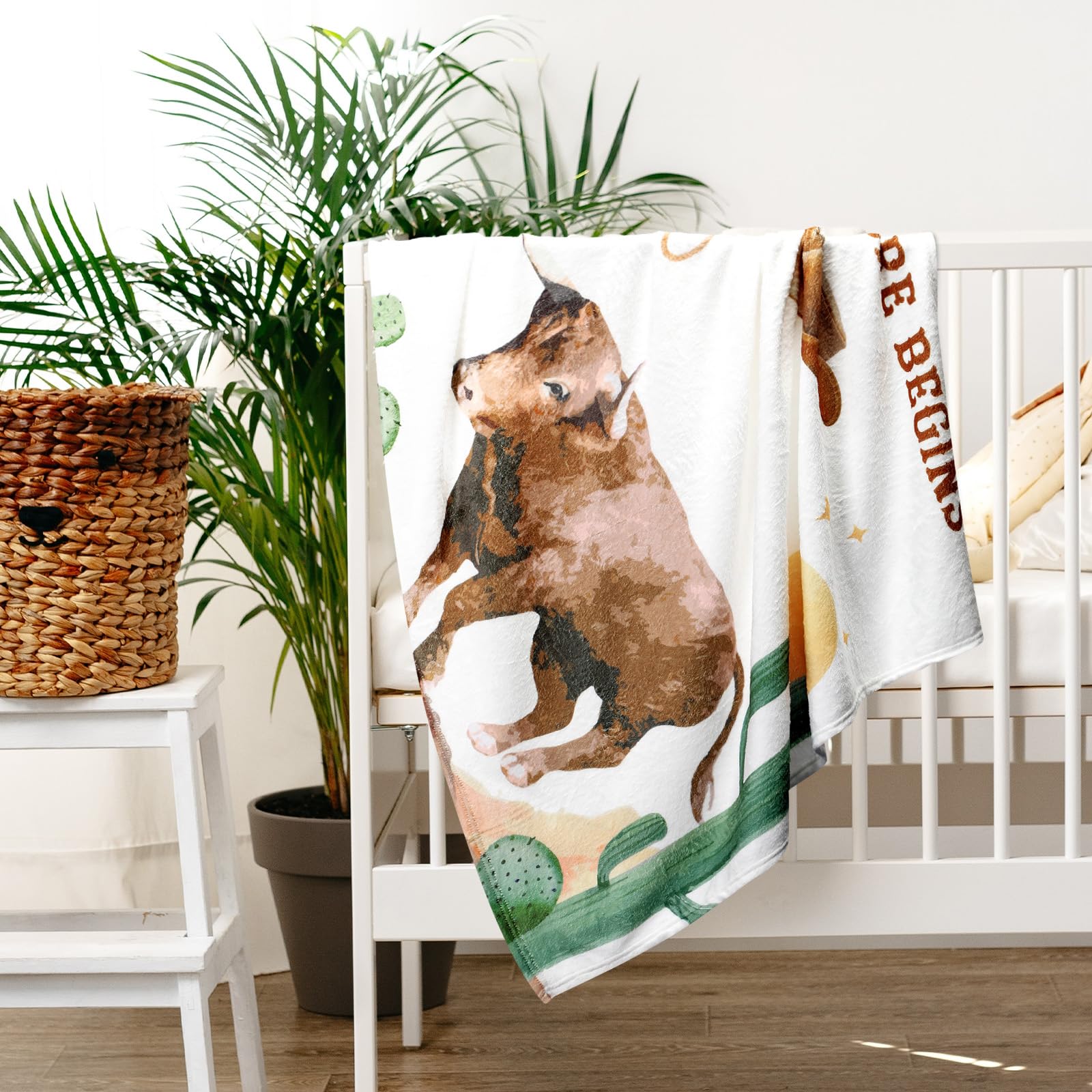 Cowboy Baby Milestone Blanket: You will receive 1 baby milestone blanket and 1 felt lariat frame. Featuring a bull, cowboy boots, cactus and more, this western-themed monthly blanket is ideal for celebrating the birth of your baby and recording his or her first-year journey.