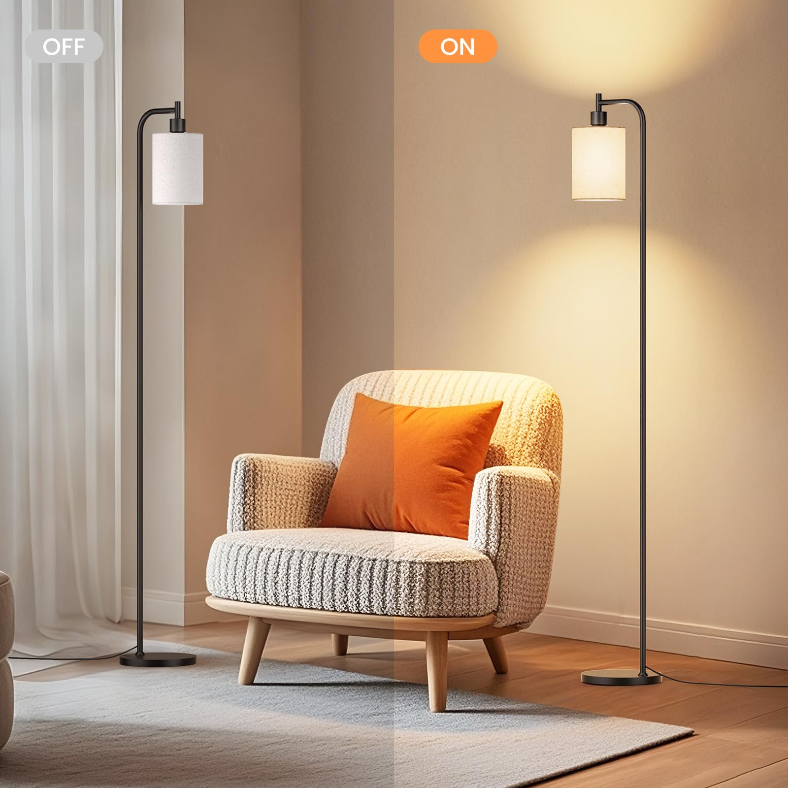 【Sleek Design for Modern Spaces】This modern floor lamp features a matte metal base and linen fabric shade, making it stable and long-lasting. Its understated elegance complements modern, Nordic, or industrial decor styles, while the compact footprint fits effortlessly into corners, bedrooms, or living rooms.