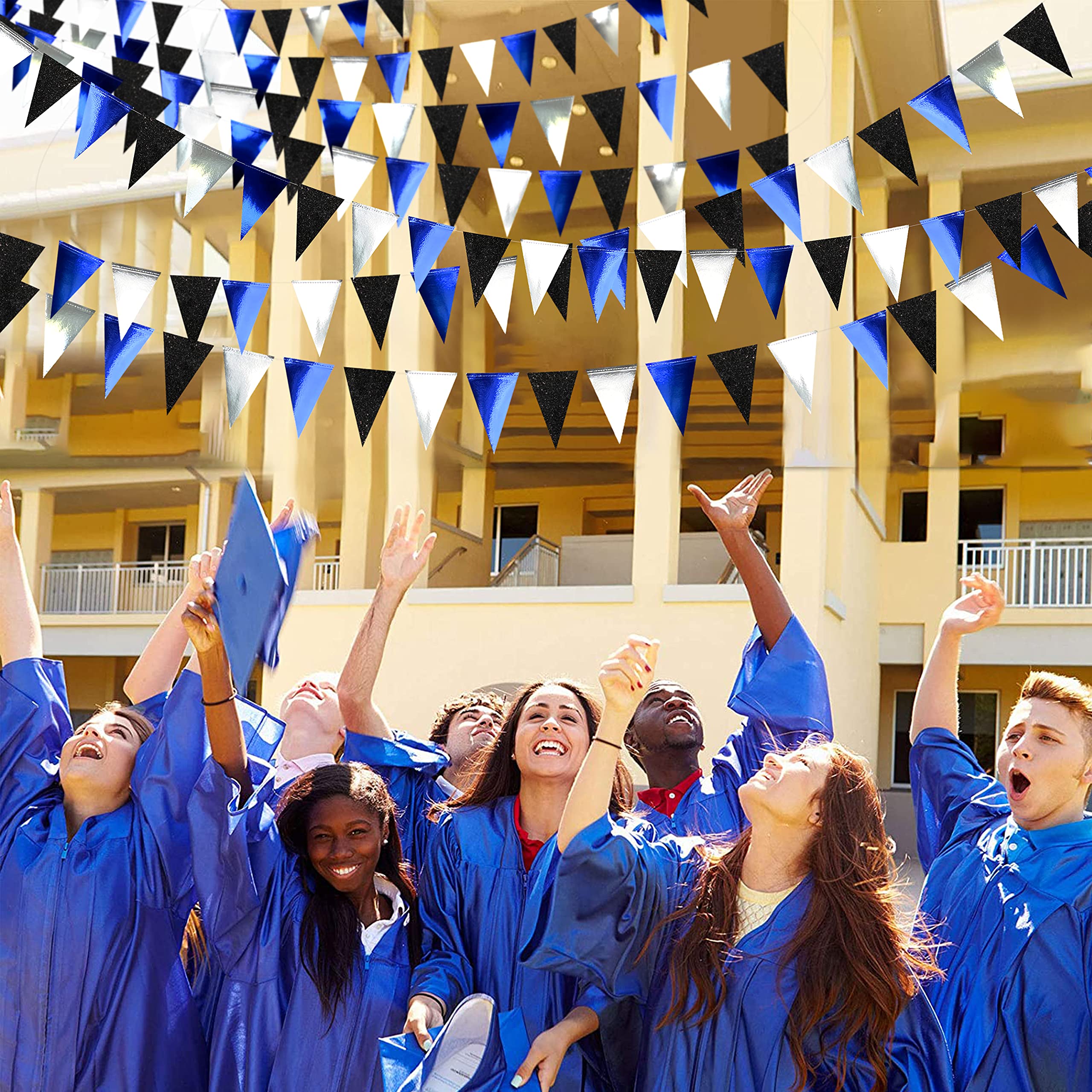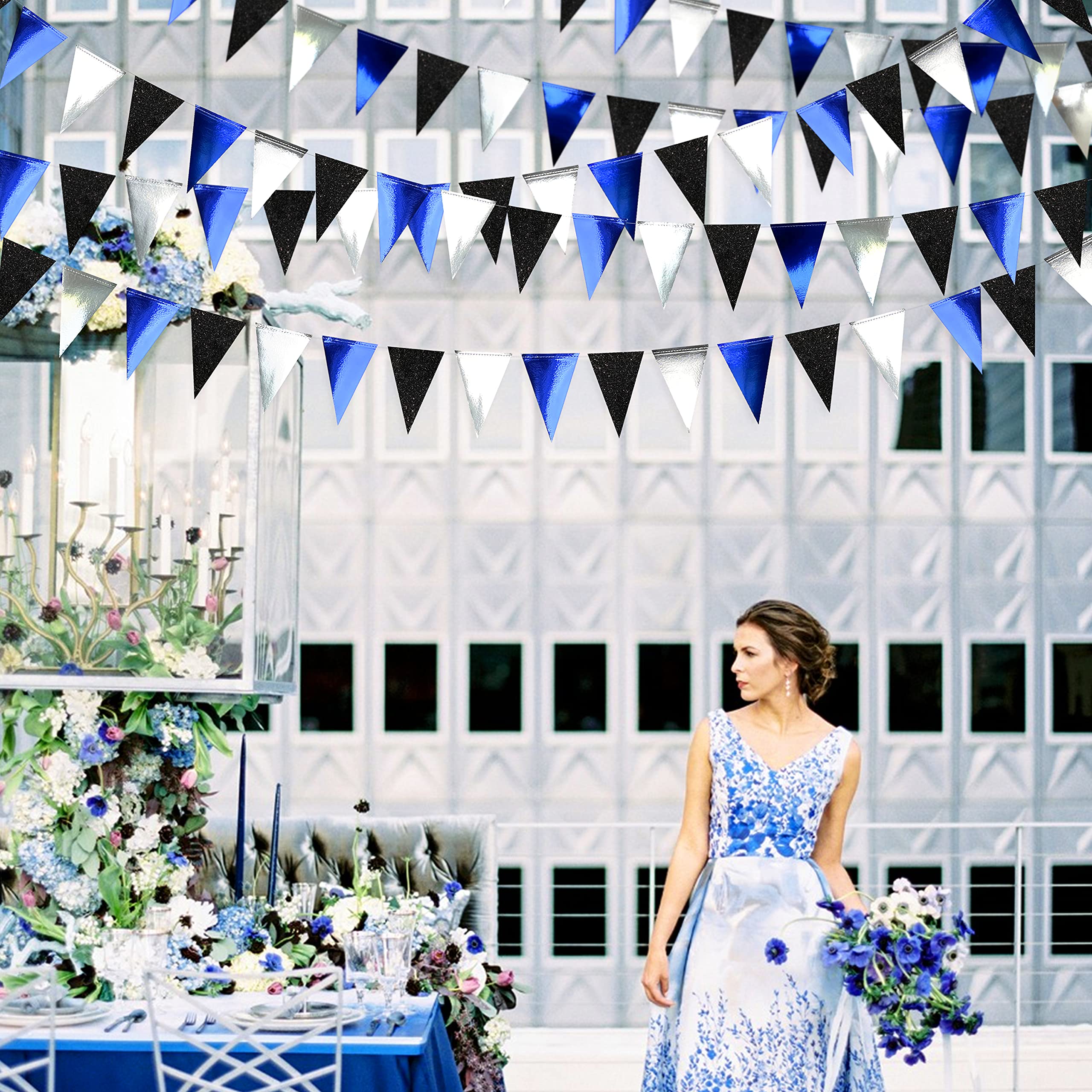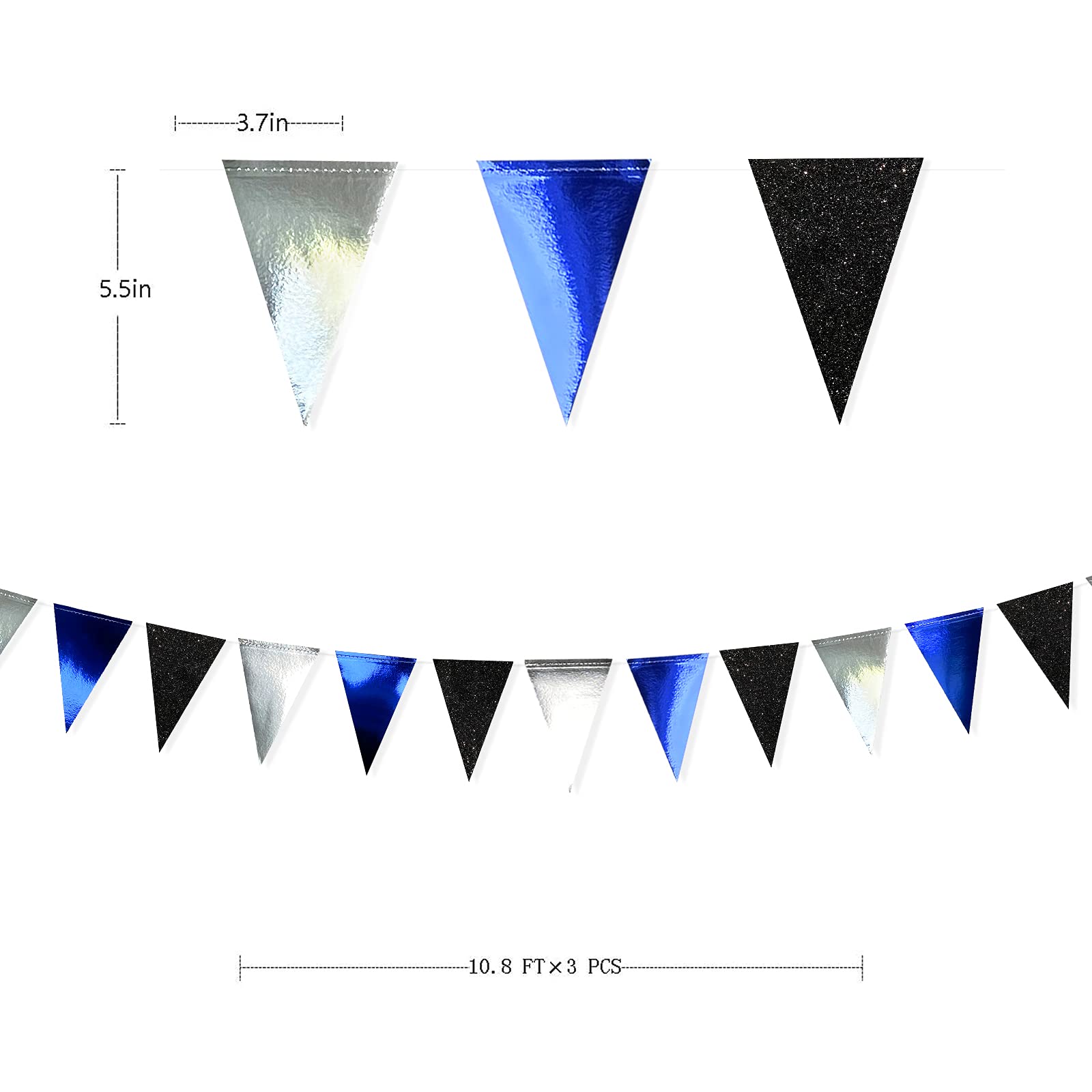 💙PACKAGE CONTAINS- 3 set of royal blue black silver hanging triangle party banner,each string is 3 meters with 26 pieces triangular flags,so total is 9 meters = 30 feet and 78 pieces flags. Size of each flag:14cm x 9cm/5.5" x 3.5" (L x W).