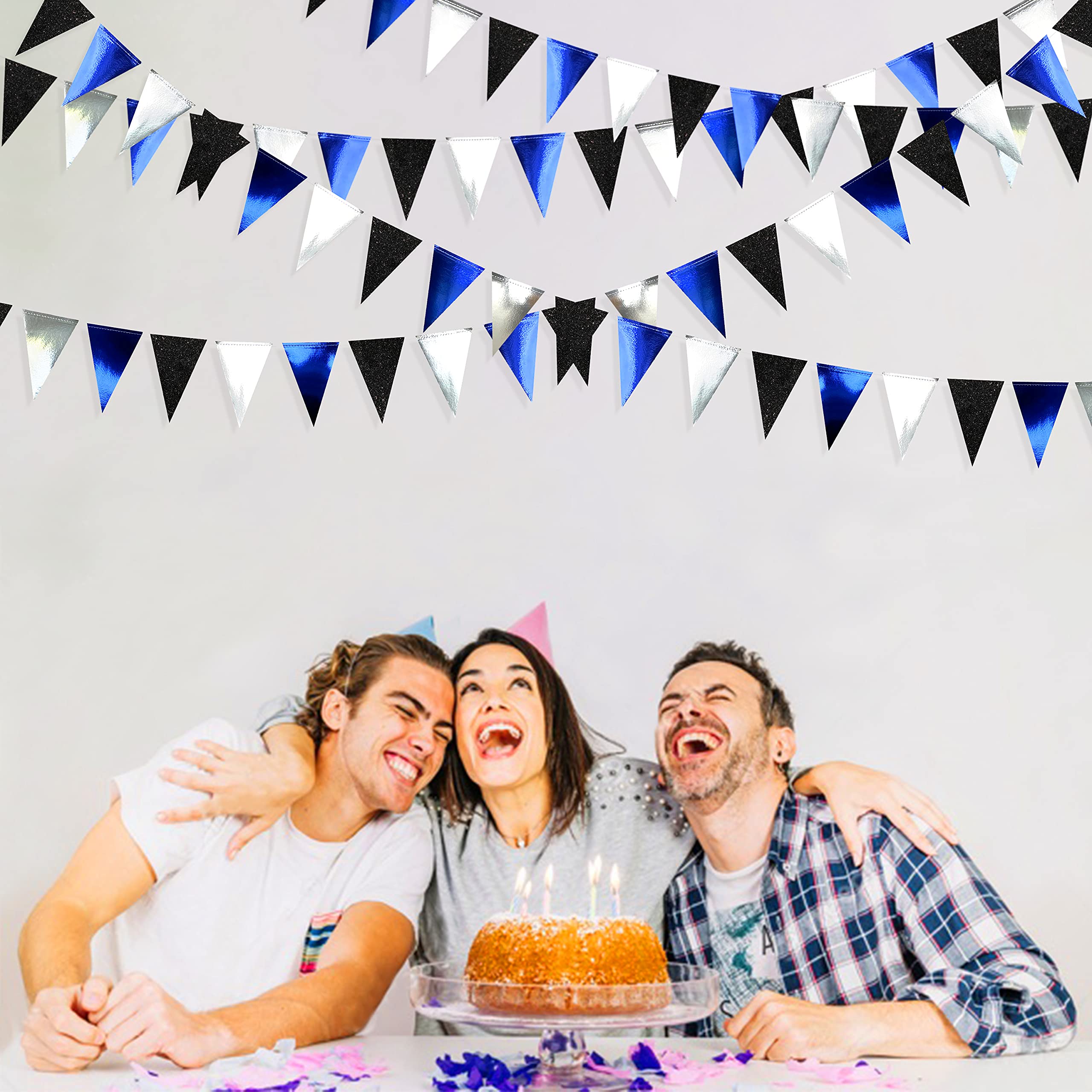 🖤ENVIRONMENTAL MATERIAL-Our black silver blue pennant bunting are made of two different materials paper.Double sided glitter paper and metallic paper,safe and non-toxic,carefully hand-made and machine-sewn together with thread.durable and reusable.