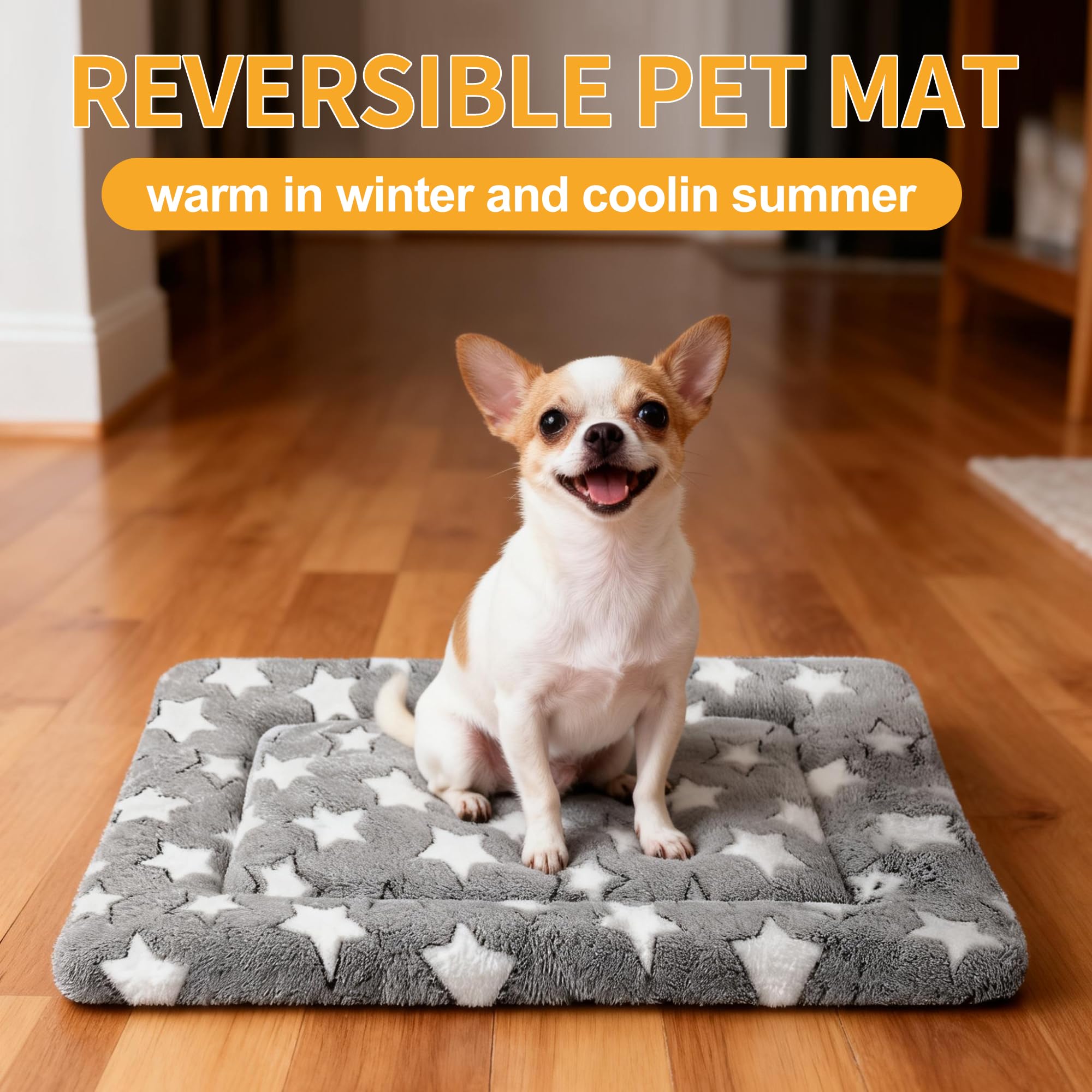 All-season reversible comfort: Our reversible dog bed is thoughtfully designed to keep your pet comfortable all year round, no matter the weather. One side is made of soft, warming plush, which is perfect for chilly days, while the other is made of breathable hight-quality canvas to keep your pet cool during warmer months. Perfet as a dog mat or crate bed, it effortlessly adapts to your pet's needs, blending style and comfort in one attractive design.