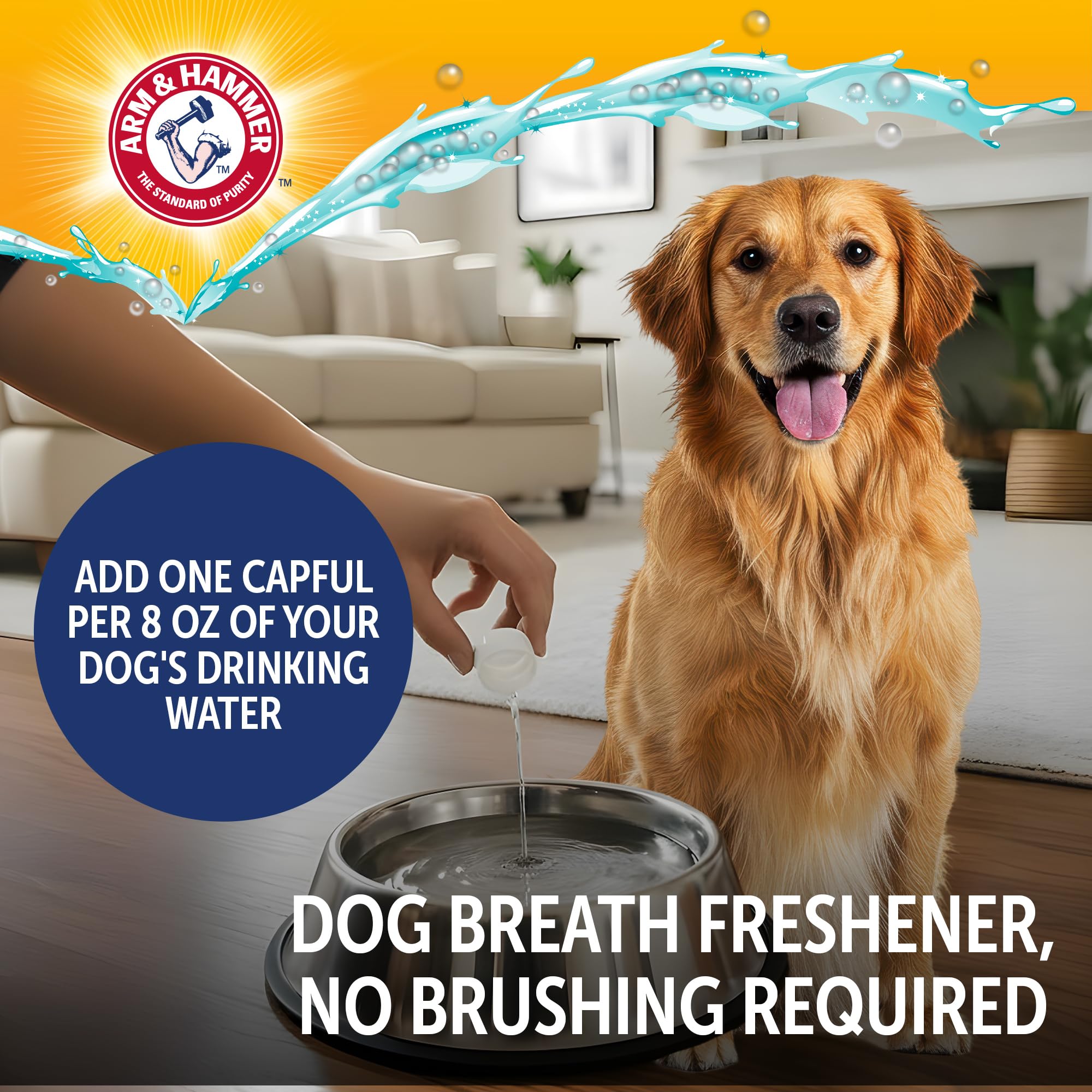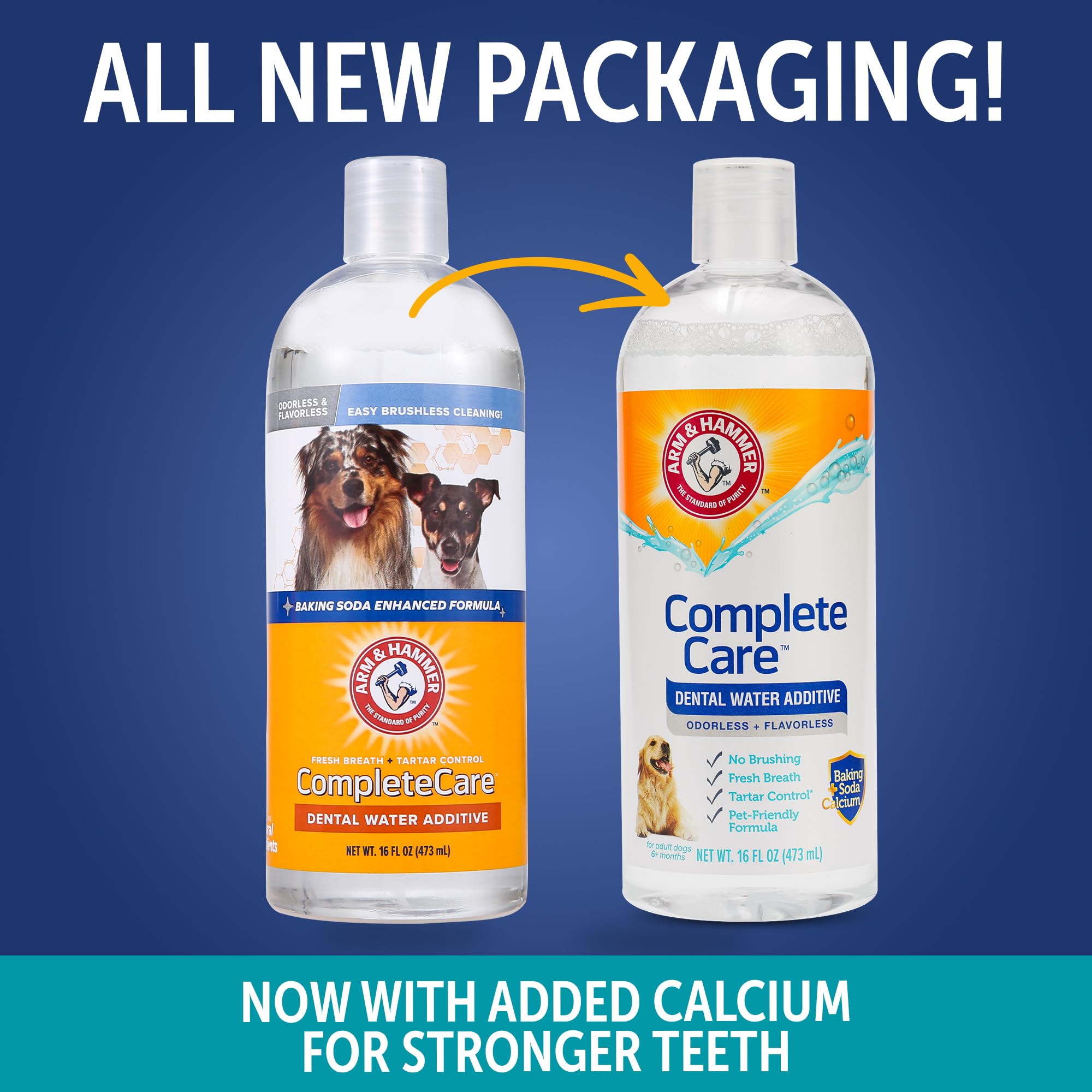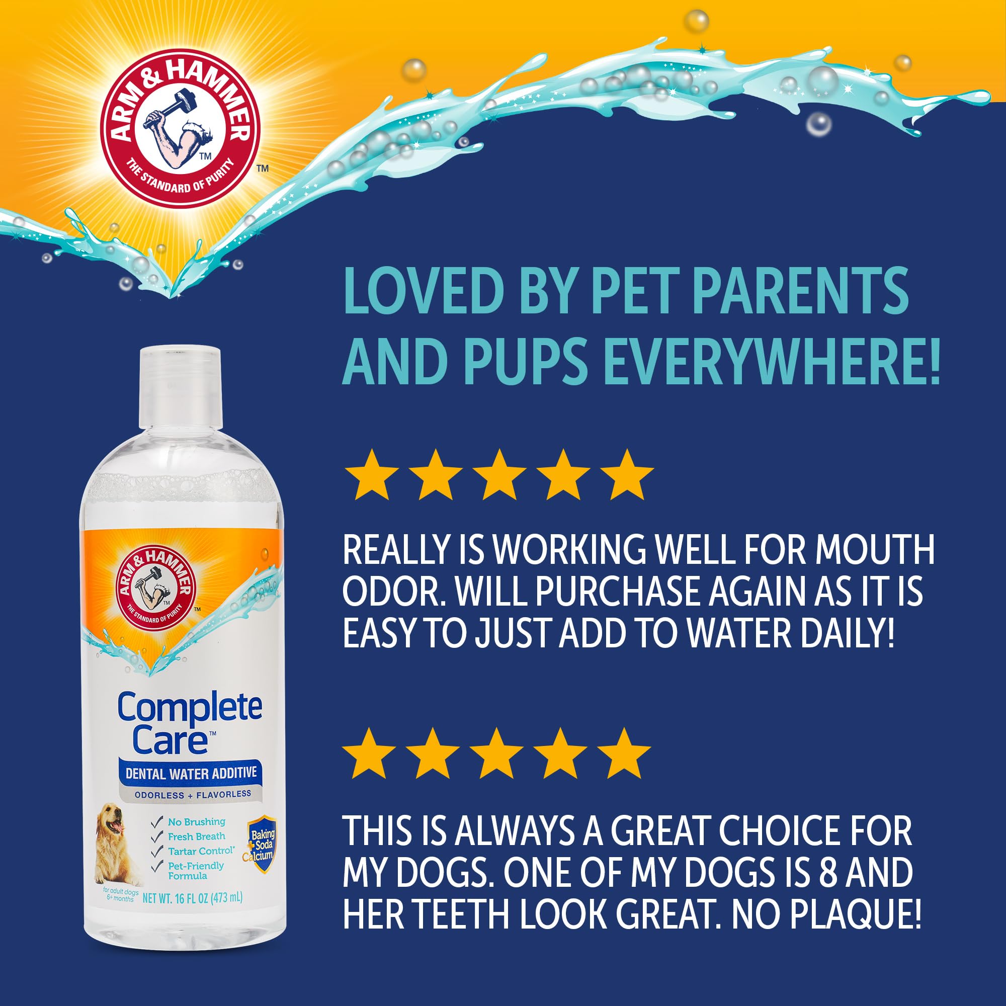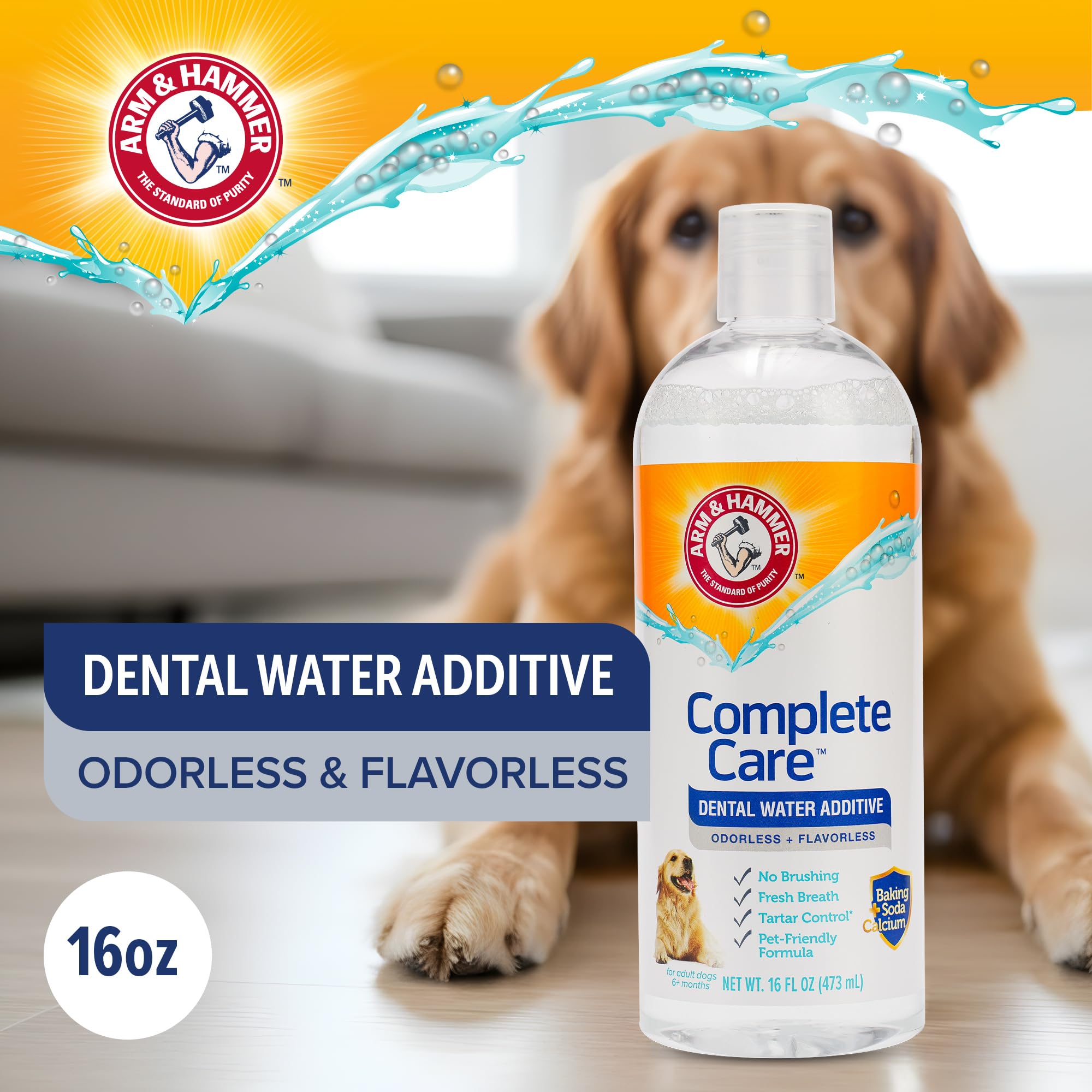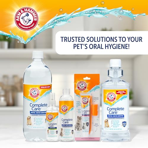 Arm & Hammer Complete Care Dental Water Additive for Dogs offers an easy way to support daily oral hygiene without brushing. Simply add the solution to your dog’s drinking water to help freshen breath and support plaque and tartar control as part of a consistent routine. This odorless and flavorless formula is designed for easy acceptance, making it suitable for dogs of all sizes and breeds. Formulated with baking soda, calcium, and added vitamins, it helps support cleaner teeth and healthier gums over time while fitting naturally into everyday hydration. The fluoride-free formula is safe for daily use and works gradually as your dog drinks water throughout the day. No brushing, rinsing, or special steps are required, making it a convenient option for pet owners looking to simplify dental care. Ideal for ongoing maintenance between professional cleanings, this dental water additive helps support fresher breath and improved oral cleanliness through a simple daily habit.