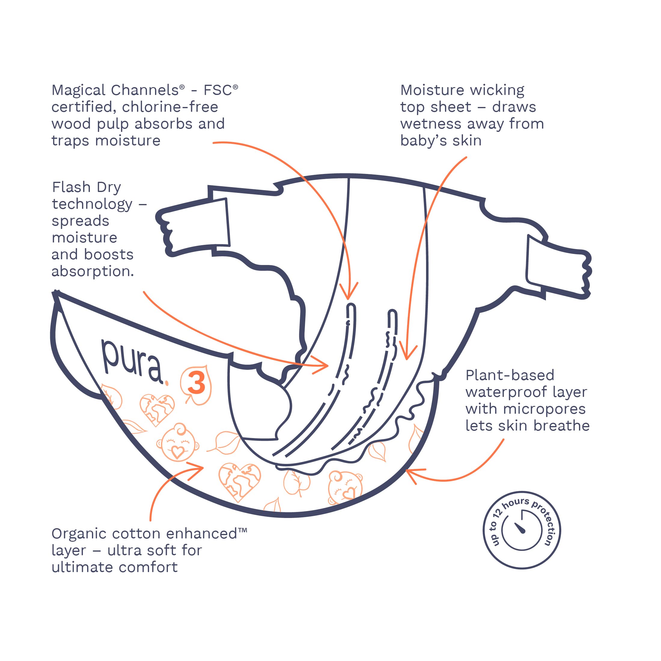 GOOD FOR THE PLANET: Pura’s diapers are manufactured in a carbon neutral plant, powered by green electricity. Where possible, we’ve replaced non-sustainable materials with lower impact materials such as wood pulp from sustainably managed forests in the absorbent core of our diapers. Our packaging is made from paper, so it's easier to recycle!