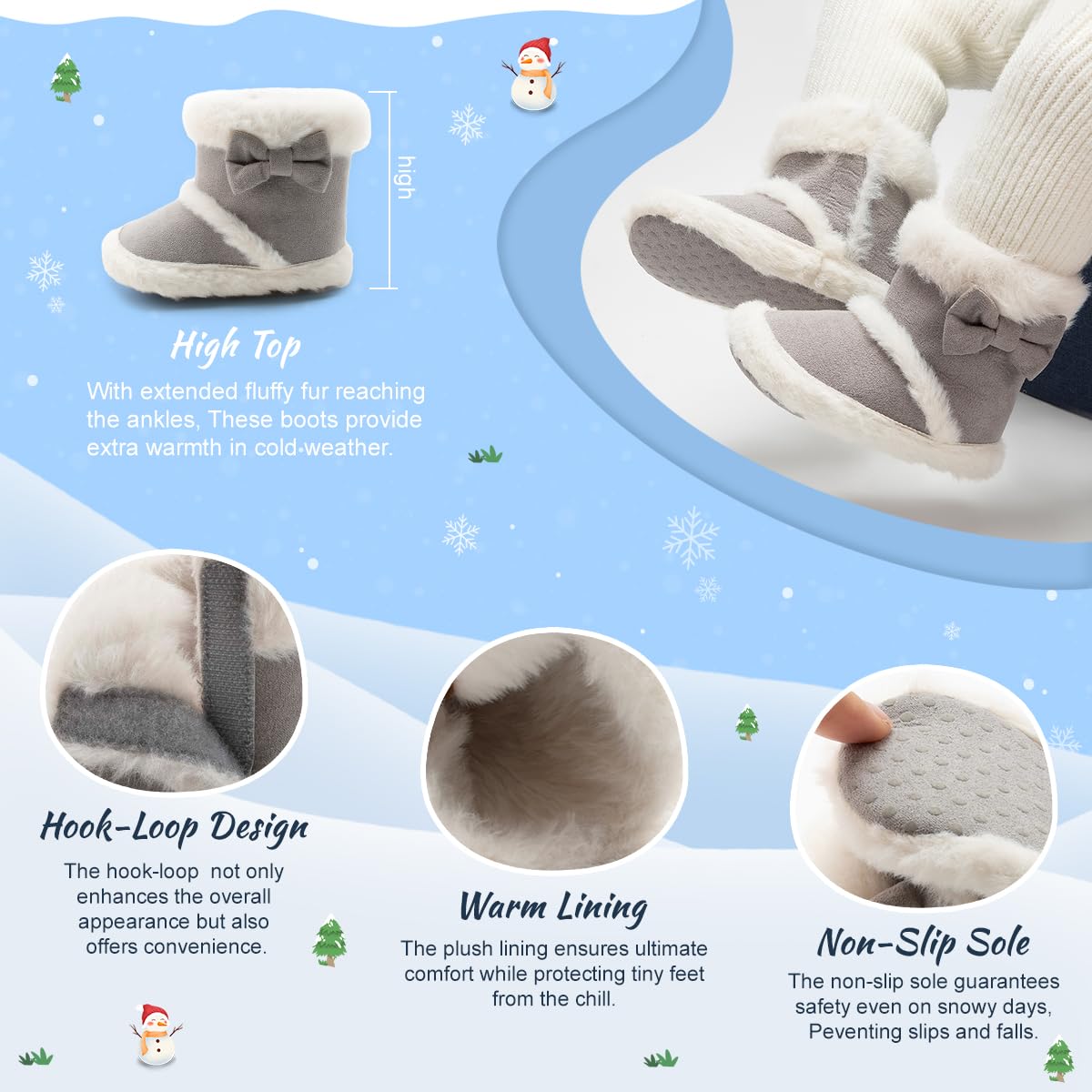 Extremely Warm: Extremely warm fur inside these cute boots. Extra long fluff in the lining, to ensure that the heat stability control in the shoe does not lose. Make sure your baby doesn't get frostbite from playing in the frozen