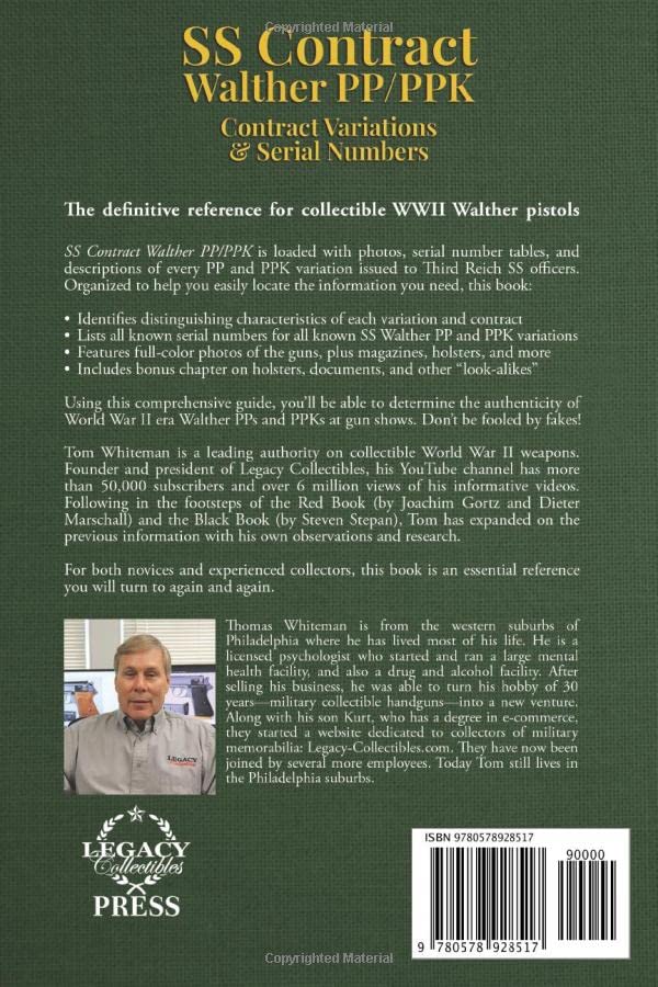 The definitive reference for collectible WWII Walther pistols. SS Contract Walther PP/PPK is loaded with photos, serial number tables, and descriptions of every PP and PPK variation issued to Third Reich SS officers. Organized to help you easily locate the information you need, this book: - Identifies distinguishing characteristics of each variation and contract - Lists all known serial numbers for all known SS Walther PP and PPK variations - Features full-color photos of the guns, plus magazines, holsters, and more - Includes bonus chapter on holsters, documents, and other “look-alikes” Using this comprehensive guide, you’ll be able to determine the authenticity of World War II era Walther PPs and PPKs at gun shows. Don’t be fooled by fakes! Tom Whiteman is a leading authority on collectible World War II weapons. Founder and president of Legacy Collectibles, his YouTube channel has more than 50,000 subscribers and over 6 million views of his informative videos. Following in the footsteps of the Red Book (by Joachim Gortz and Dieter Marschall) and the Black Book (by Steven Stepan), Tom has expanded on the previous information with his own observations and research. For both novices and experienced collectors, this book is an essential reference you will turn to again and again. Pick up your copy today and be sure to take it with you to your next gun show!