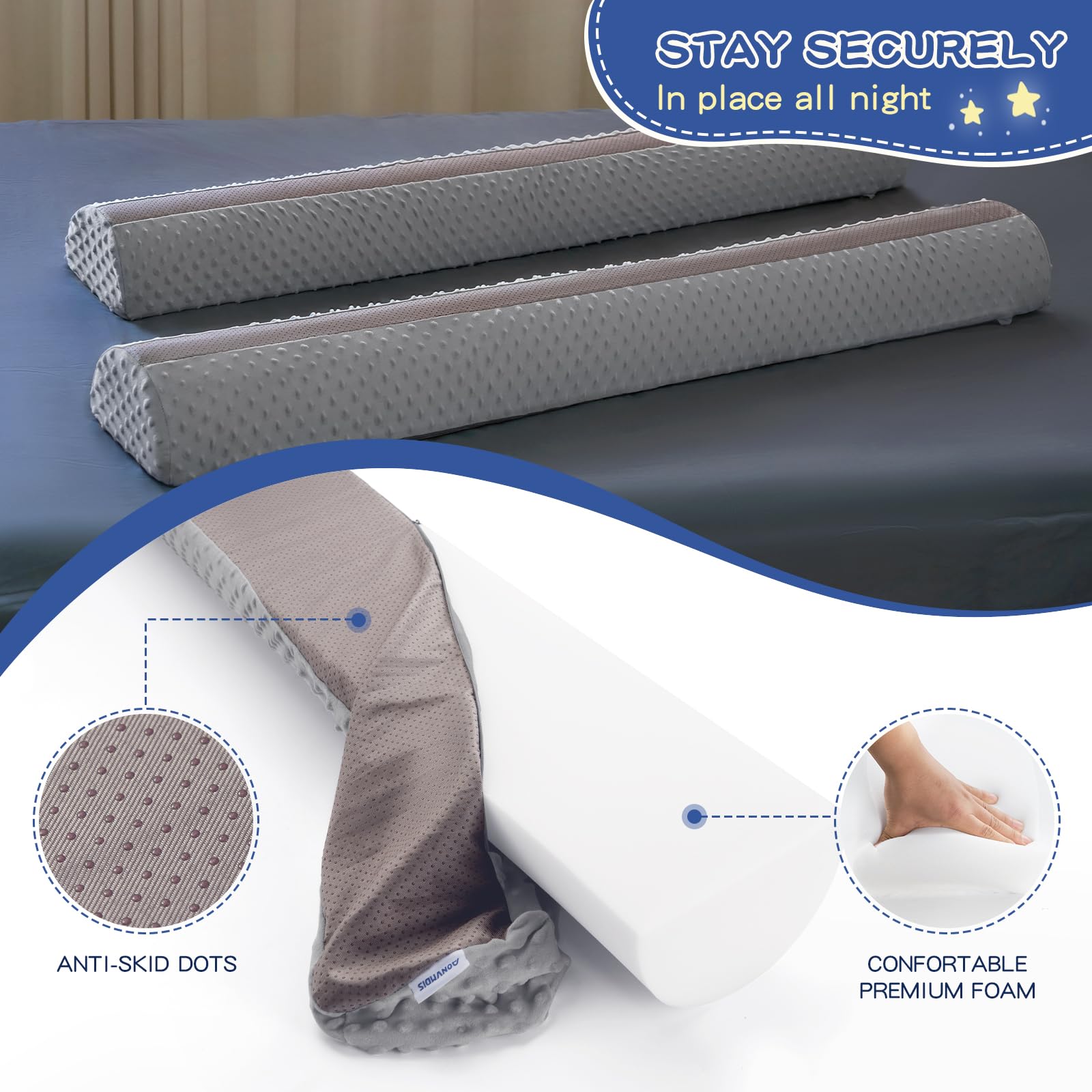 Better Night's Sleep:The semi-cylindrical design of this bed bumper is long enough 52"(L)x7"(B)x4.5"(H) to keep the little guy from rolling off, but not too hight that he can easily climb over it to get in bed. Our exclusive design anti-slip bumper pads with flap that have non-slip pads on the bottom to stay put all night long.Our toddler bed rails keep your child safe and get a better night's sleep.