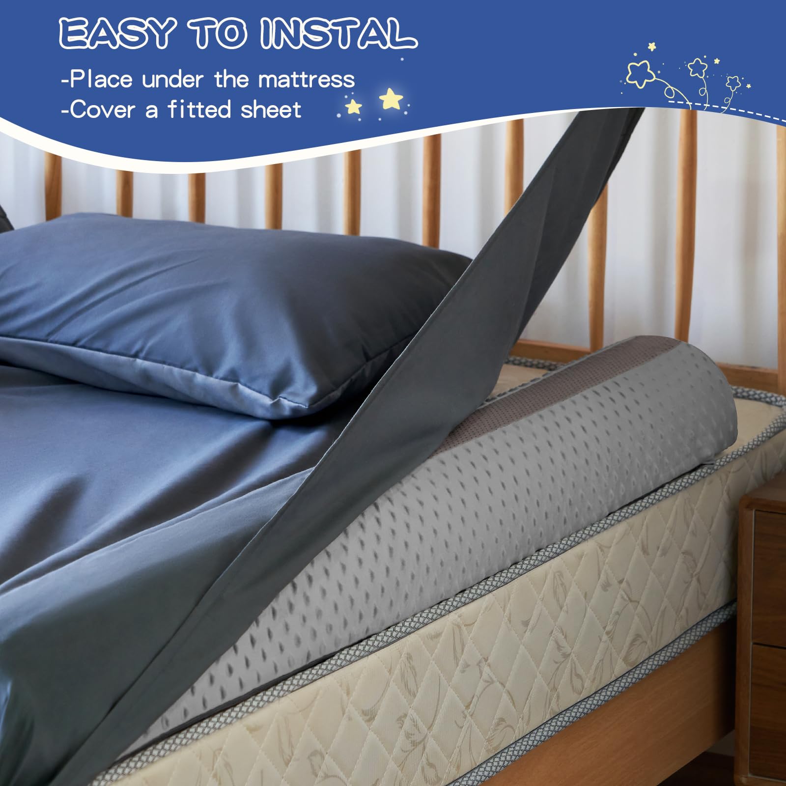 Easy To Install:The bed bumper for toddlers only needs three simple steps to be used. First, open the vacuum package to allow the foam to rebound to its original shape(first use only). Second, place it on the mattress. Third, cover the fitted sheet,they are so easy to put in and take out.There is soft non-slip rubber at the bottom of the rail to keep out of slipping. The bed rail comes equipped with a removable and machine washable hypoallergenic cover,which is water resistant.