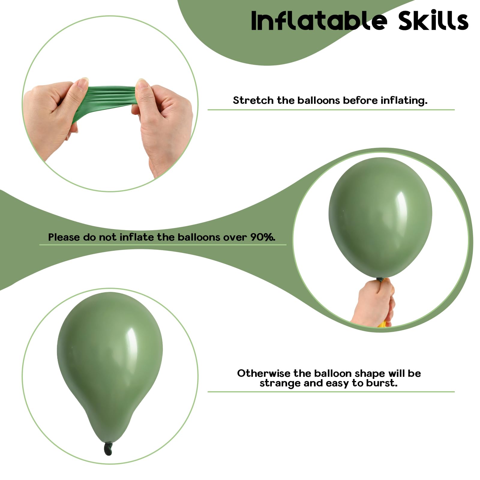 WARM TIPS: Always supervise children when playing with balloons, balloons can pose a choking hazard if they are not handled properly; keep balloons away from heat sources, such as direct sunlight, radiators, and open flames; inflate balloons slowly and do not overinflate them; the tail must be pulled tight after the balloon is knotted; balloons may have color differences under different lighting conditions