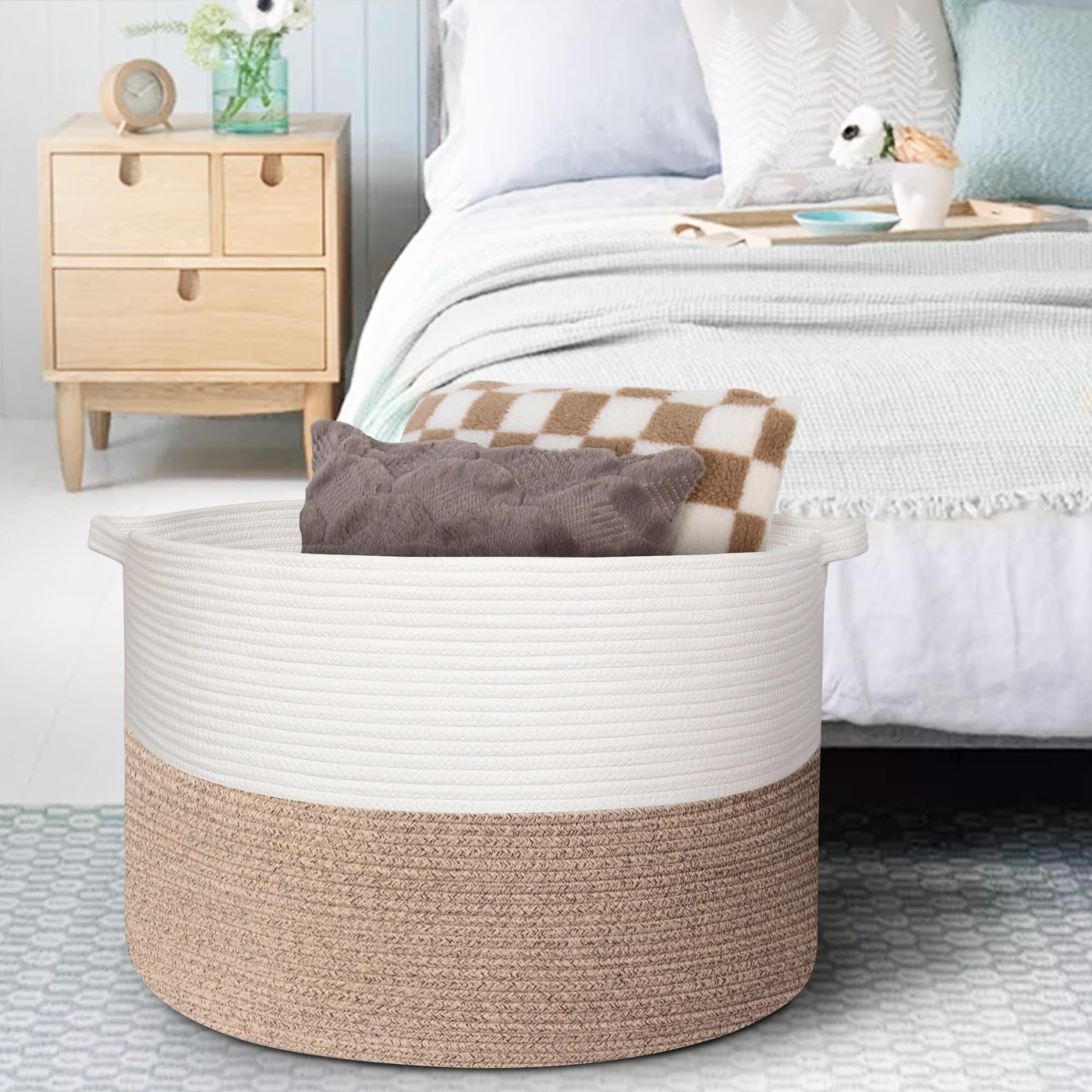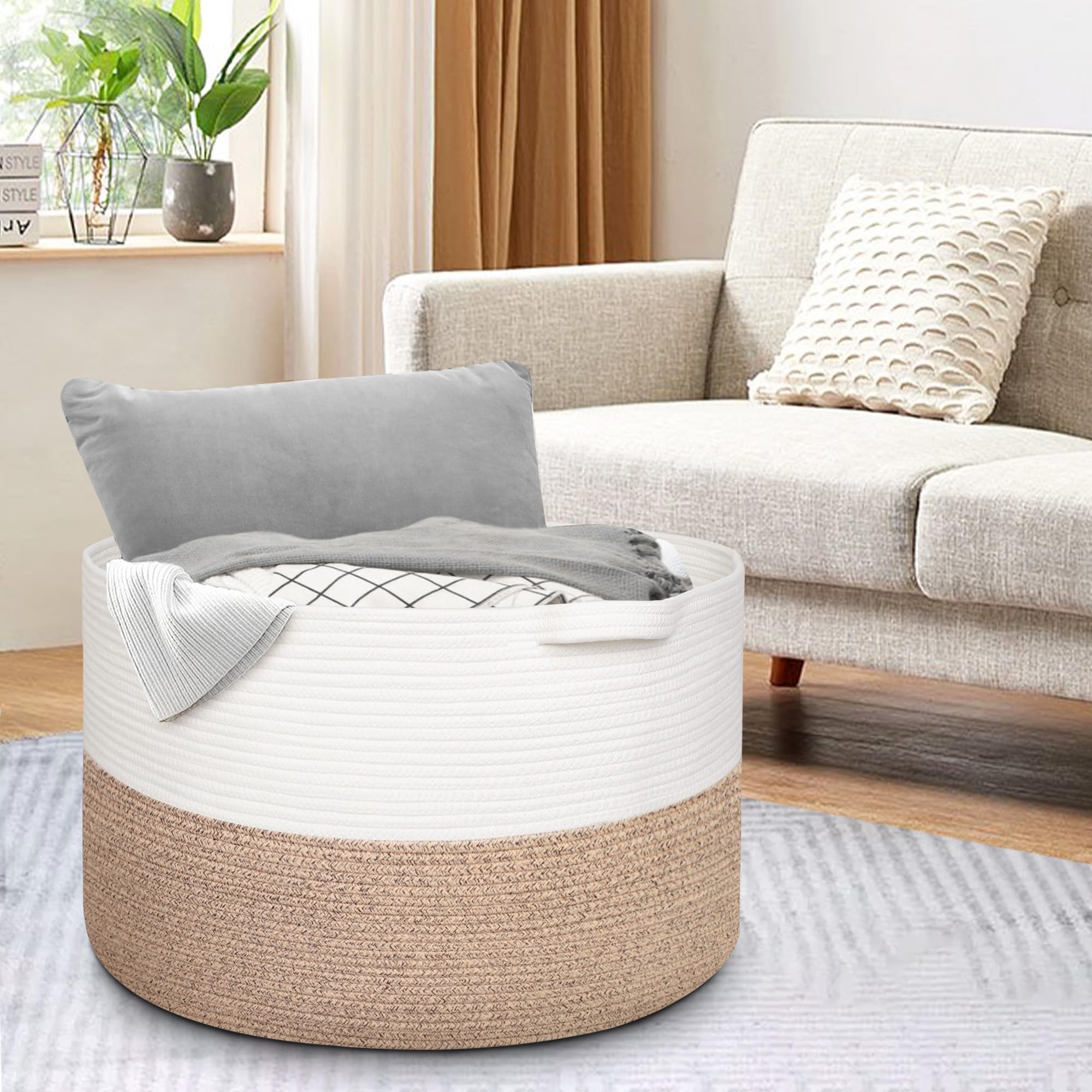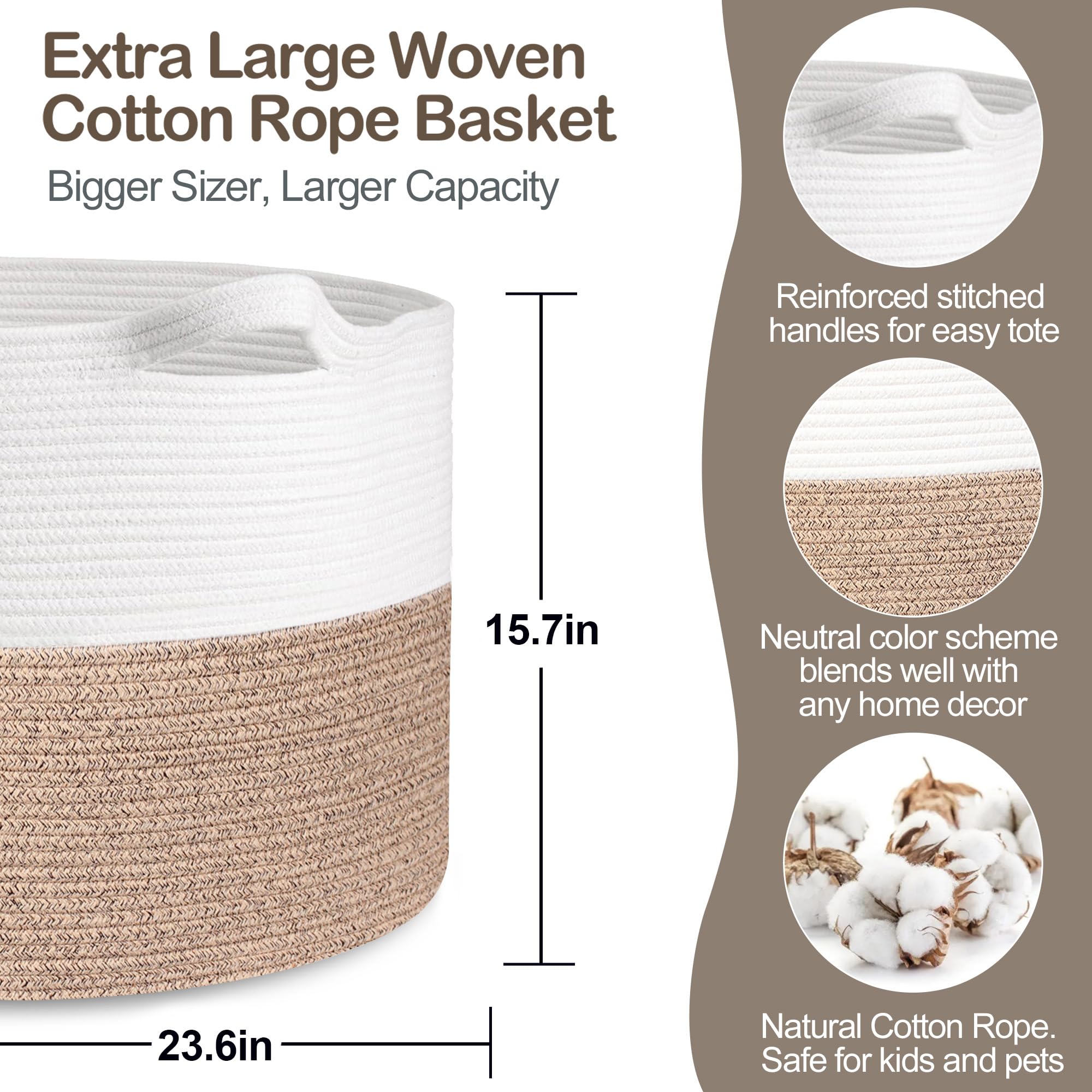 Cotton Rope Living Room Storage: The beige basket is made of hand natural cotton rope. Sturdy rope storage baskets can withstand weight and regular use without wear and tear. Rope material is soft and safe for baby, kids and even pets like doggy and cat. The lg 3x opened rope baskets for organizing has no chemical odor and sharp edges, so it will not harm the floor and the kids.