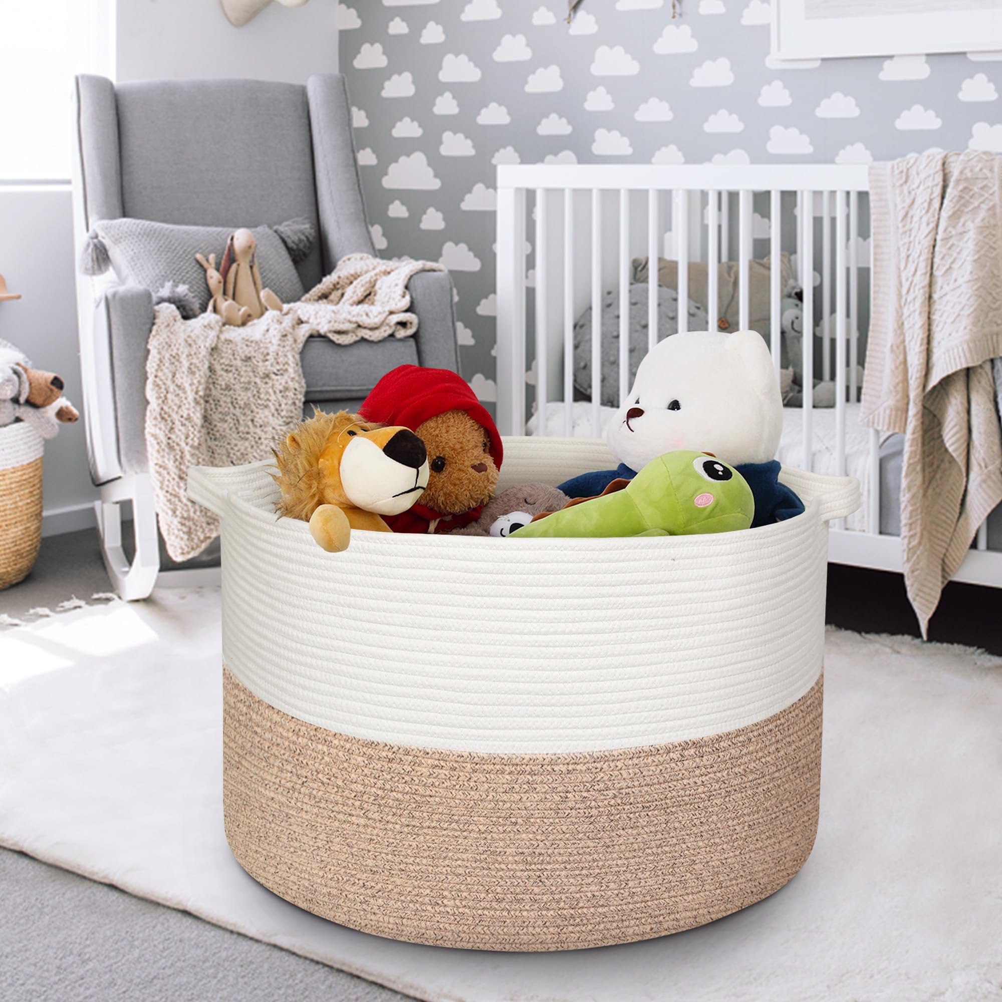 Sturdy and Reinforced Handles: The large toy storage is equipped with built-in foldable handles making transporting convenient even when filled with items. Plus, it's easy to clean. The basket is hand or machine washable and can fold flat so you can take it with you as a laundry basket when you travel or in your car. This super large asket can stand up easily and take its round shape quickly. Cotton with better recovery. Good elasticity.