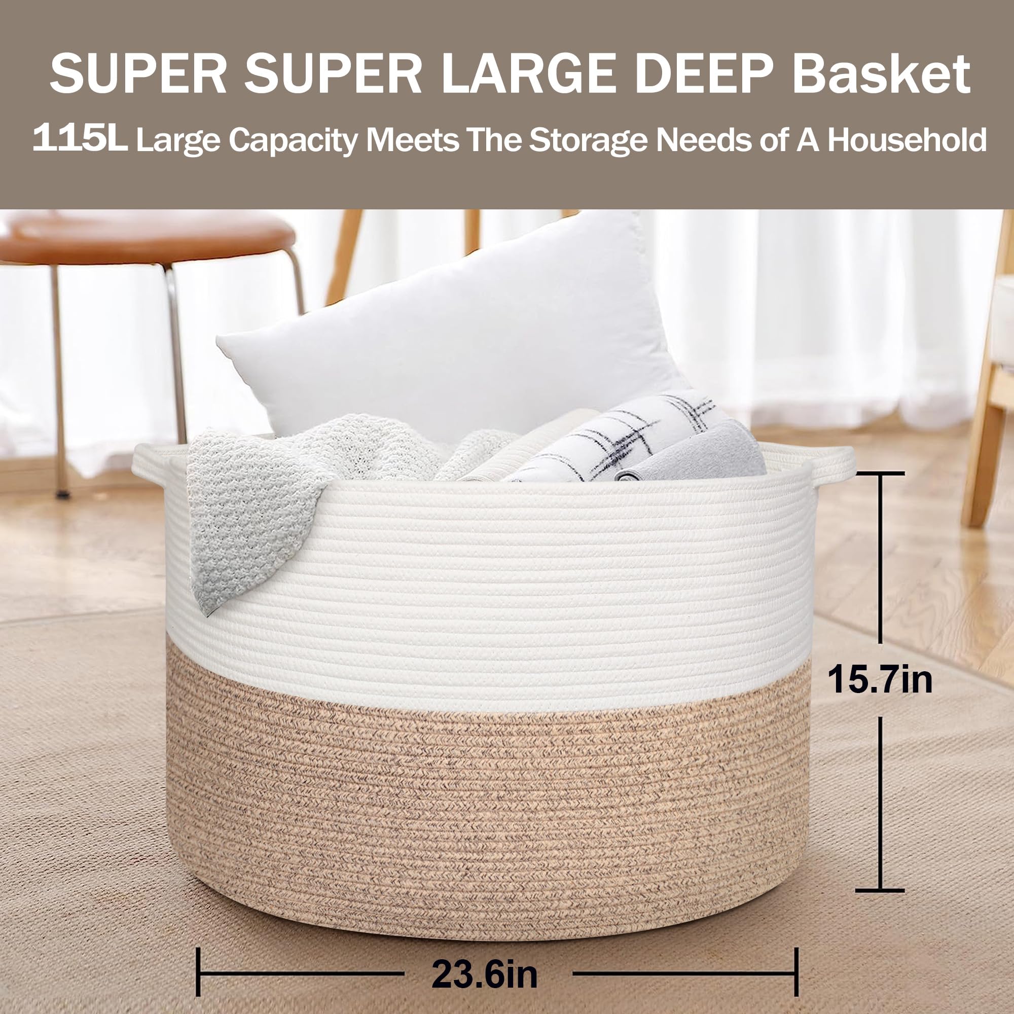 115L Extra Extra Large Baskets for Toys: The toy box have dimensions of 23.6 inches wide and 15.7 inches deep with a storage capacity of 115 Liters. XXXL extra large storage basket is huge and deep enough to store kids toy organizers and storage. Large storage basket is great for storing trucks, dolls, and Legos in the nursery since it can put the toys together.