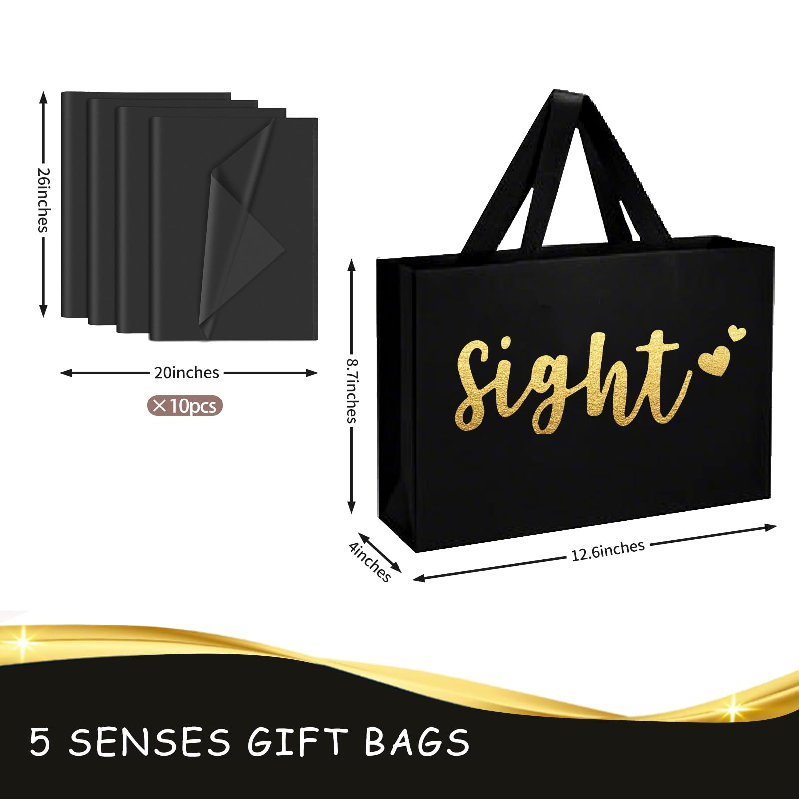 Size details: each sense gift bags measures 12.6 x 8.7 x 4 inches while accompanying tissue papers measure 19.7 x 26 inches, designed to accommodate uniquely shaped gifts, these 5 senses gift bags will help you create the great set of presents, and to show your love and add the last touch to your present