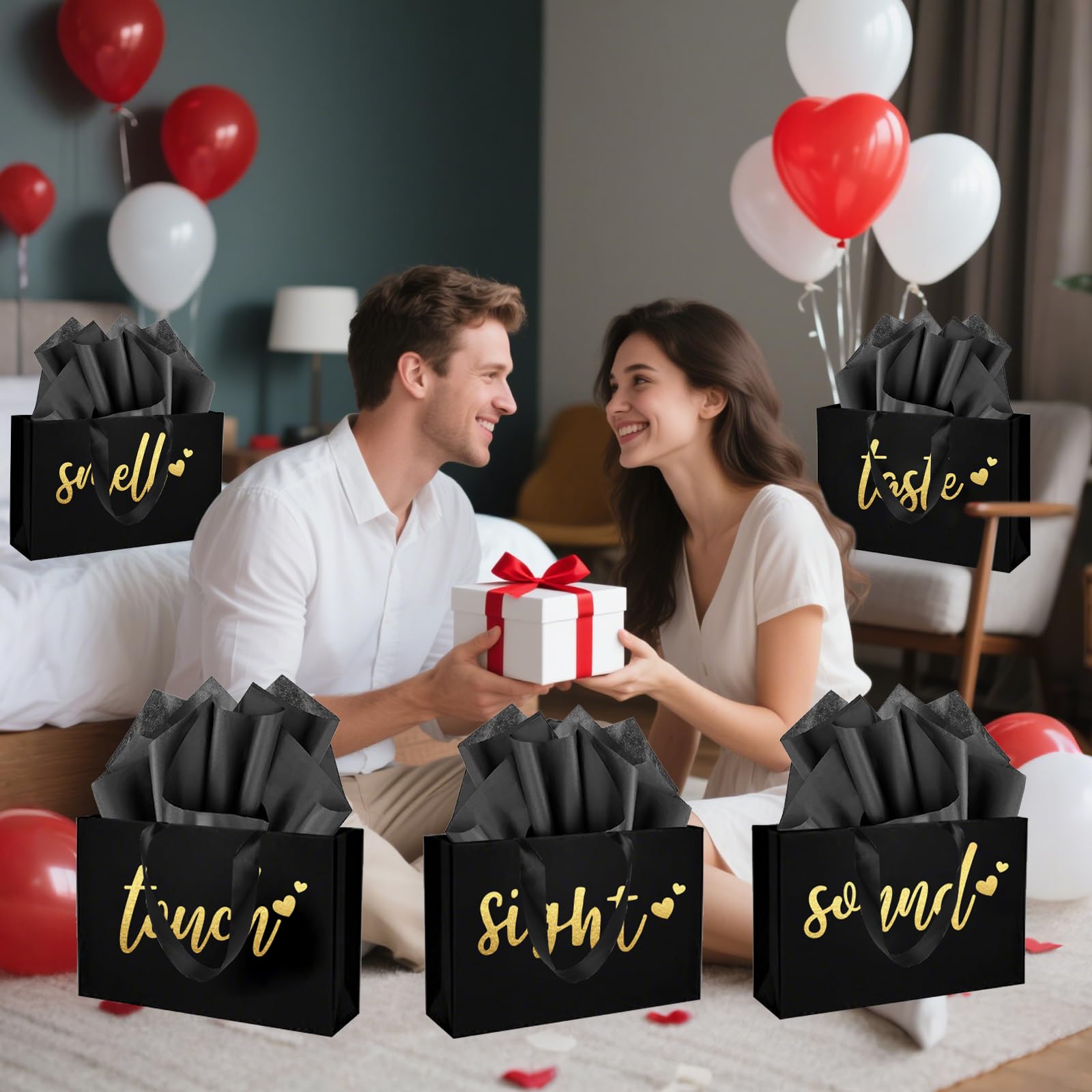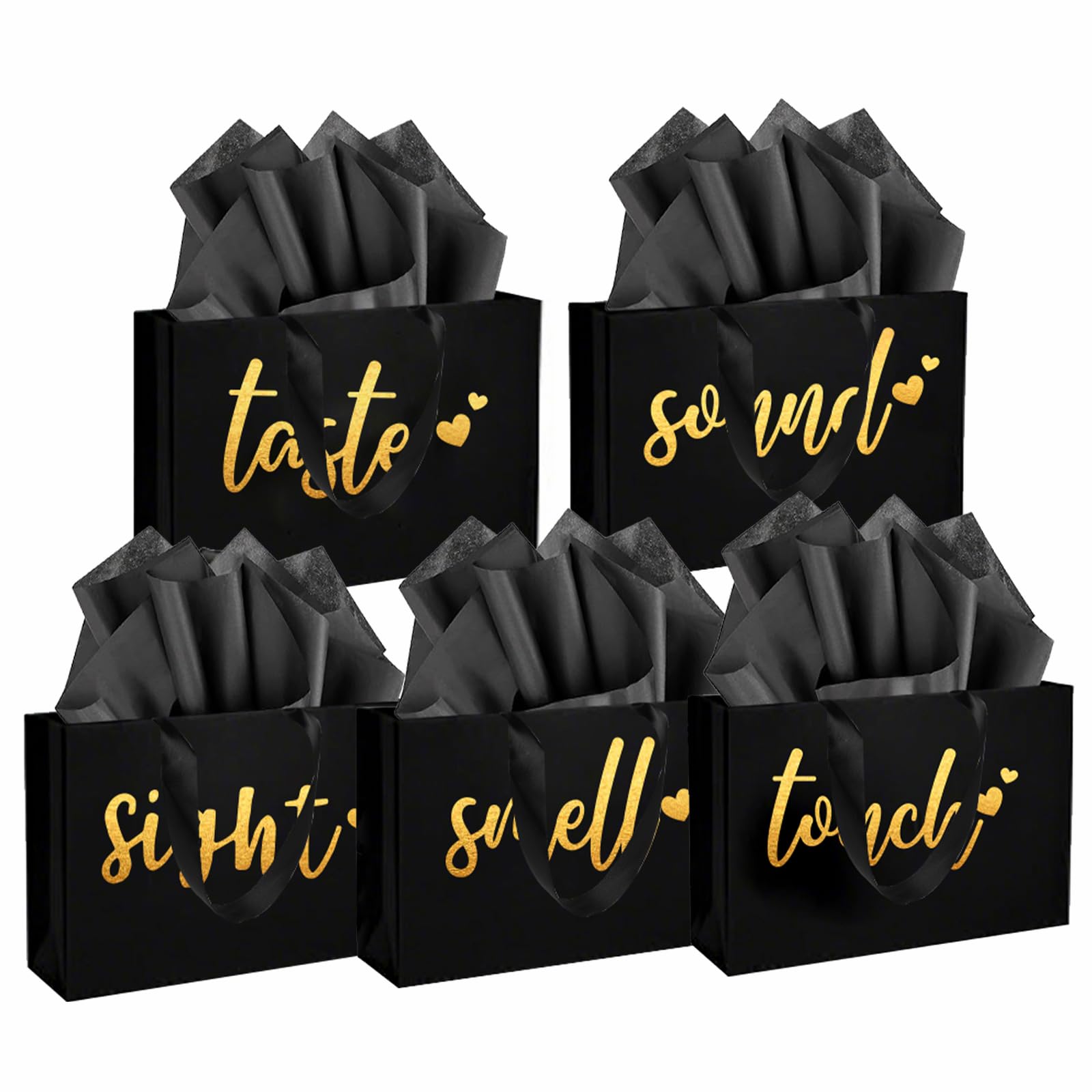 Package included: come with 5 senses gift bags designed with the words [Taste], [Touch], [Smell], [Sound] and [Sight], and 10 pieces of tissue paper, the perfect set for your "Five Senses" themed gift, and these 5 senses gift bags are a wonderful way to show your affection on birthdays, anniversaries, Valentine's Day or any occasion