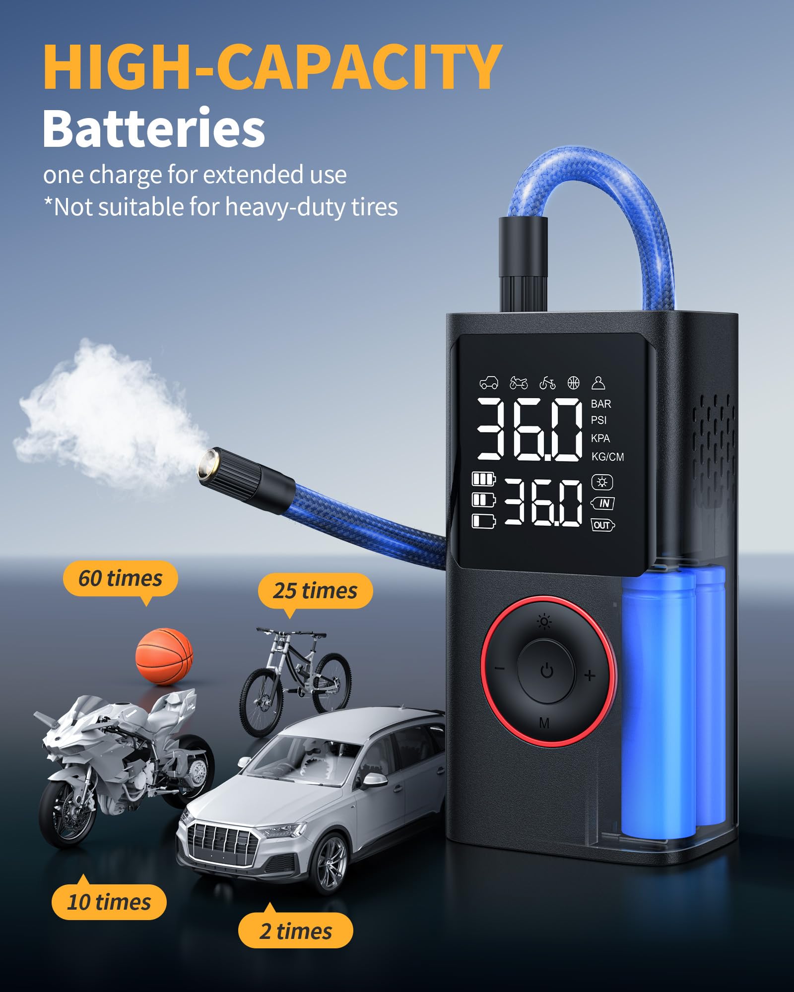 LONG-LASTING BATTERIES: Equipped with 4,000mAh rechargeable batteries, the Powools car tire air pump with portable design offers extended use without frequent recharging. A single charge provides enough power to inflate 2 car tires(*𝗡𝗼𝘁 𝘀𝘂𝗶𝘁𝗮𝗯𝗹𝗲 𝗳𝗼𝗿 𝗵𝗲𝗮𝘃𝘆-𝗱𝘂𝘁𝘆 𝘁𝗶𝗿𝗲𝘀), 25 bike tires, or 60 balls, continuously working for up to 25 minutes. The batteries are easily rechargeable with a Type-C charging port, adding to its convenience.
