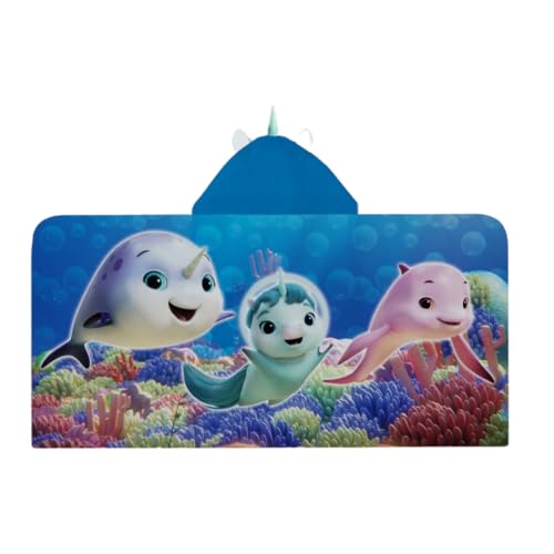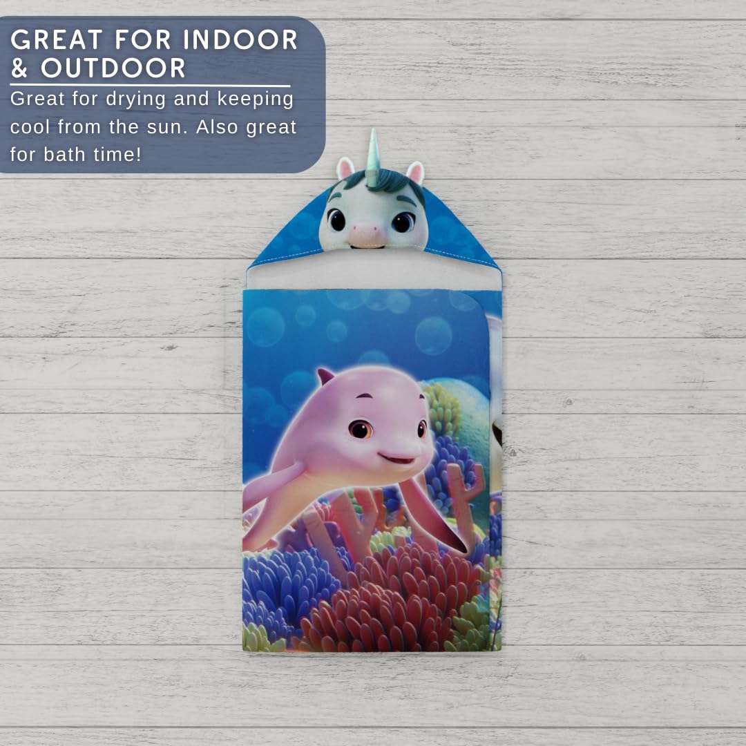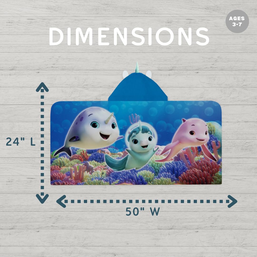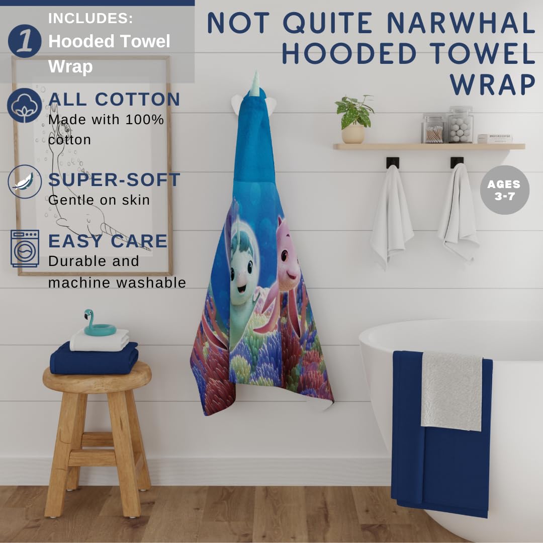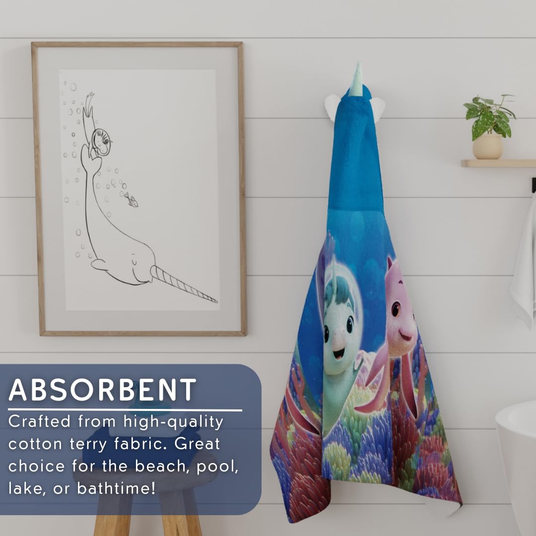 Dive into a world of enchantment with our "Not Quite Narwhal" Hooded Towel Wrap. Measuring a generous 24"x50", this towel wrap is designed for both comfort and adventure. Crafted from plush and absorbent cotton, it promises to keep your child cozy and dry after bath time. The star of the show is the delightful design on the back. Join Kelp, the endearing narwhal, and all of his undersea friends as they embark on enchanting adventures. It's a visual representation of the magic found in the new show, making bath time an imaginative voyage into the depths of the ocean. What truly sets our "Not Quite Narwhal" Hooded Towel Wrap apart is its official licensing. We've partnered with the creators of the show to bring this captivating world to life in your home. This means you're not just getting a towel; you're getting a piece of the show, backed by quality and authenticity. Transform ordinary bath times into undersea escapades with our "Not Quite Narwhal" Hooded Towel Wrap. It's a cozy and officially licensed gateway to a world of aquatic wonder and friendship.