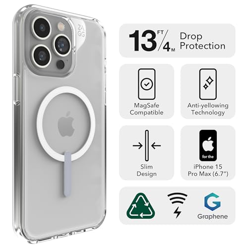 Effective Protection for the New iPhone 15 Experience the pinnacle of phone protection with the ZAGG Crystal Palace Clear Snap Case – the ultimate MagSafe solution for the iPhone 15. It is drop-resistant up to 13ft/4m thanks to Graphene, one of the strongest materials on earth. It’s thin, flexible, and heat conducive, yet more elastic than rubber, harder than a diamond, and up to 200x stronger than steel, making it ideal for unbeatable case protection. Stylish & Functional Seamlessly integrating with the MagSafe System, this case effortlessly aligns and attaches MagSafe accessories, ensuring hassle-free wireless charging without having to remove the case. Furthermore, it is made with up to 74% post-consumer recycled content, so you can feel good about your protection purchase. Crystal Palace case features a slim design with rounded edges to provide greater protection for your iPhone, while the precision cut-outs allow easy access to all buttons and ports. The case features a scratch-resistant surface with anti-yellowing properties, preventing marks and patches. Beyond Excellence Elevate every experience with ZAGG's unparalleled quality. From robust screen protectors to ergonomic phone cases, our range of premium products ensures unmatchable device protection and enhanced usability, making everyday life seamless and secure.