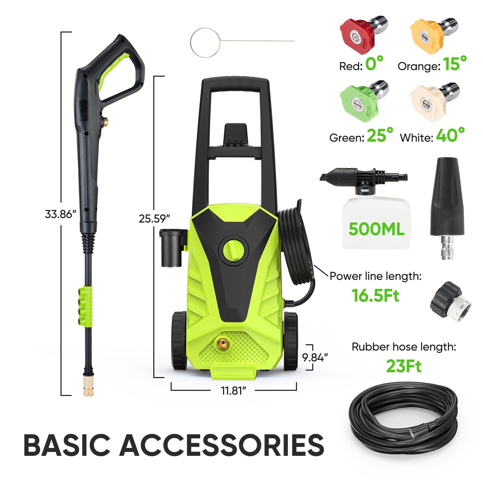 【5 Quick Nozzle and Soap Bottle】The electric pressure washer has 5 quick-connect nozzles (0º, 15º, 25º, 40º, Turbo ). Feel free to choose the high-pressure nozzle that best suits your task. Additionally, benefit from the 500ml foam spray can for effective and targeted cleaning.