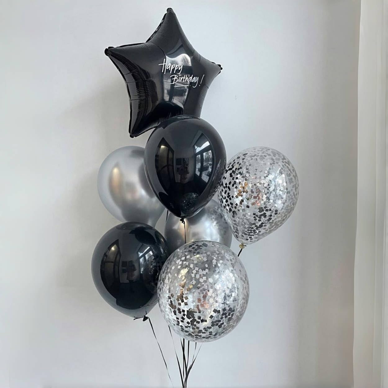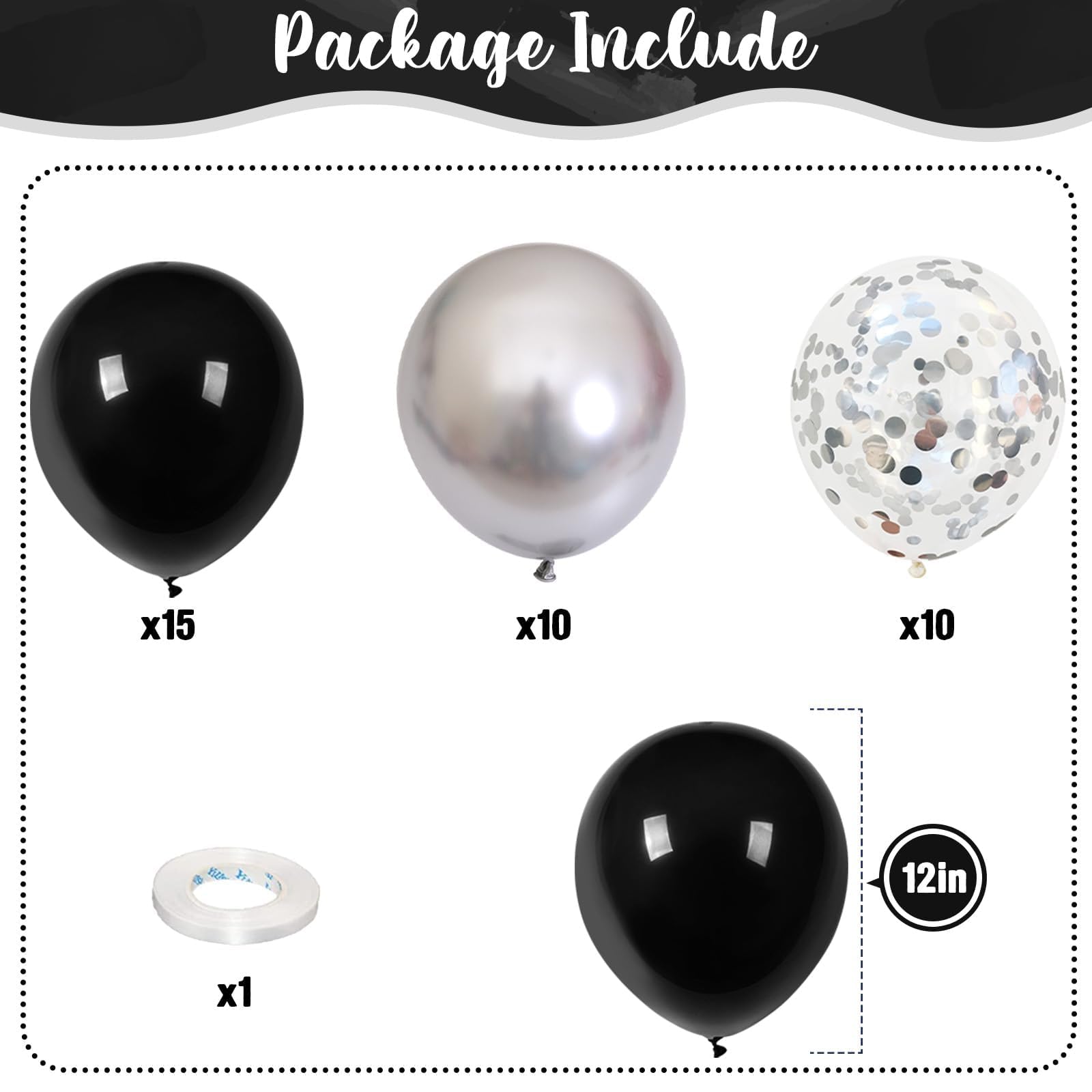 🎉 Black Silver Balloons - You will get 35 pieces 12 inch latex party balloons set, includes matte black 15pcs, metallic silver 10pcs, silver confetti 10pcs, come with 1pc white balloon ribbon. Perfect for women men birthday baby bridal shower wedding new year party decorations supplies.