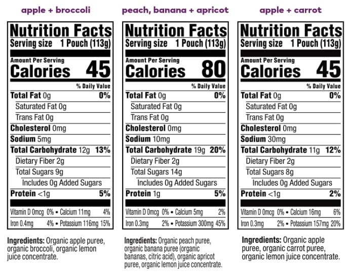 MADE WITH NATURAL FLAVORS: Apple and Broccoli, Peach, Banana, and Apricot, and Apple and Carrot blends made with organic fruit and veggie purees